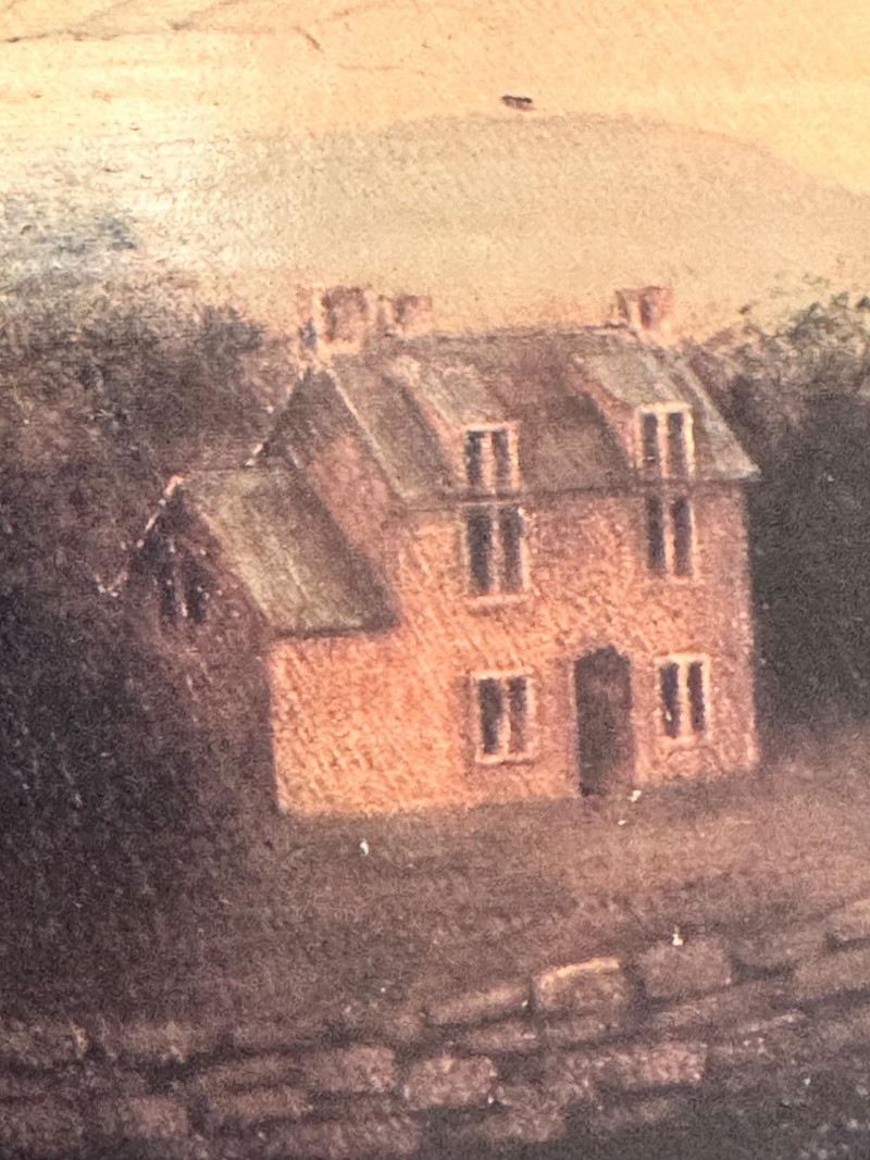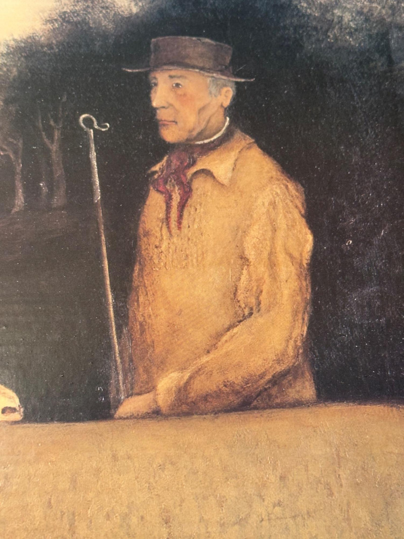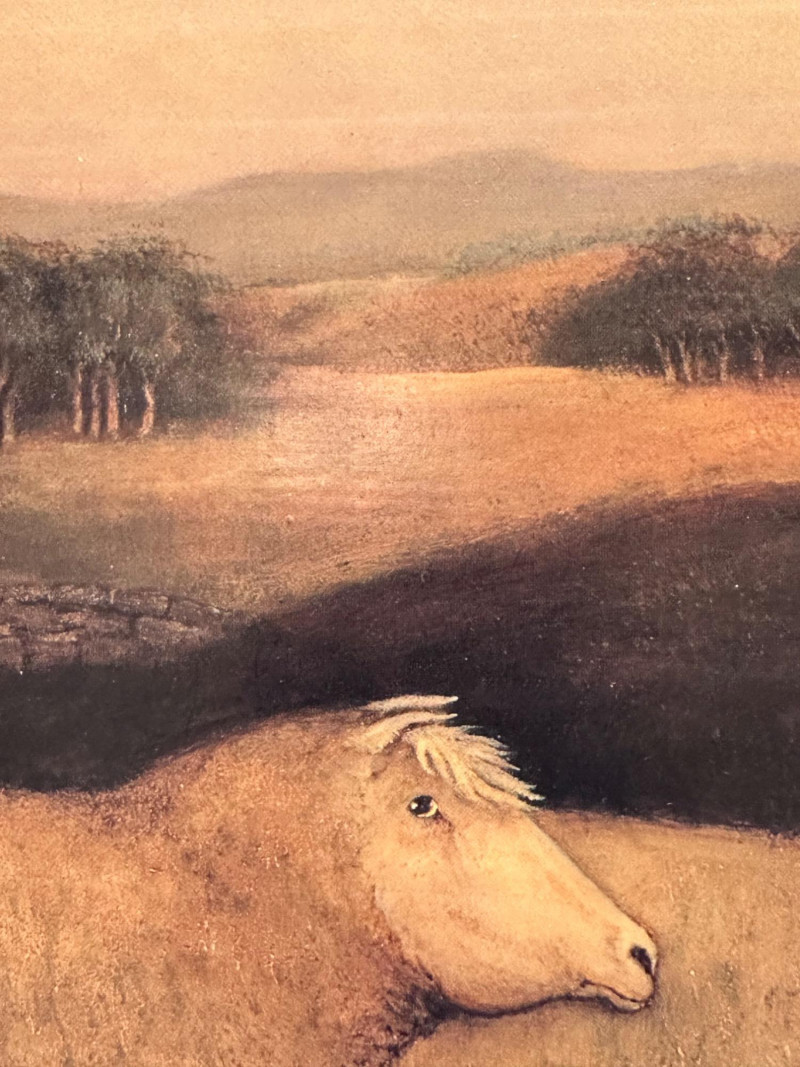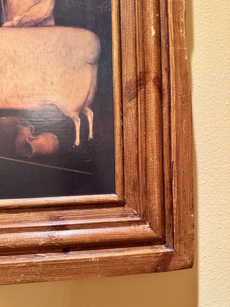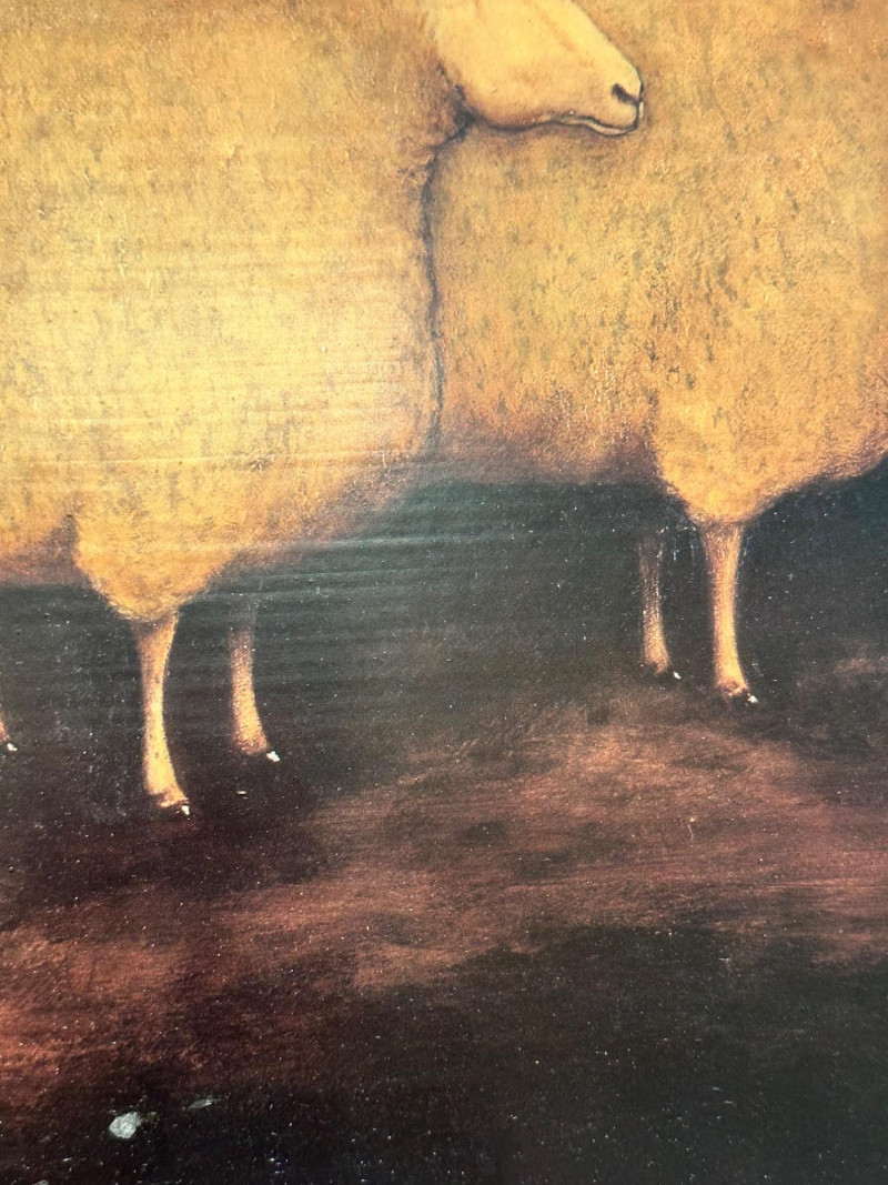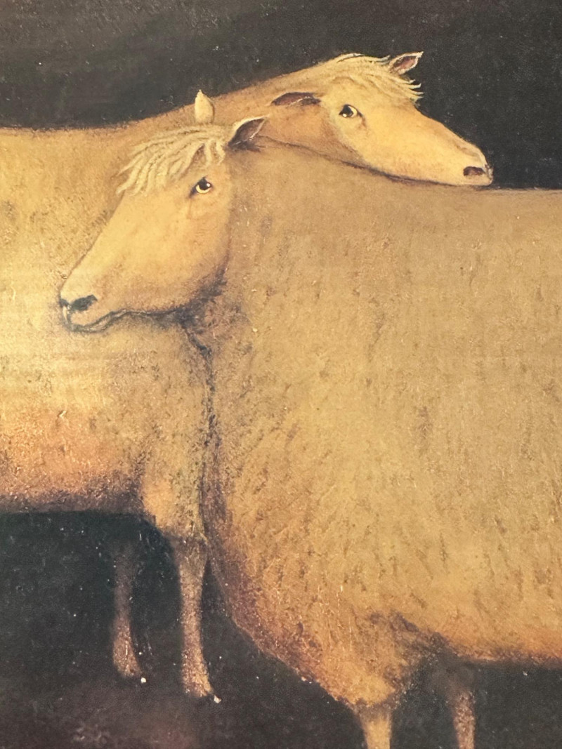 Vintage folk art–style decorative artwork depicting a traditional sheep sale / livestock market scene. The composition features four sheep in the foreground with two figures in period clothing, set against a peaceful rural landscape with rolling hills, trees, and a farmhouse in the distance. Artist: Unknown Type: Framed wall art / decorative print Style: Folk Art / Primitive / Country Subject: Sheep sale / rural farm scene Medium: Print on board or canvas (exact medium unknown) Frame: Solid wood, rustic finish Orientation: Horizontal Hanging: Wired and ready to hang Width: Approx. 31 inches Height: Approx. 23.5 inchesItem Details: