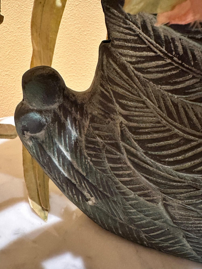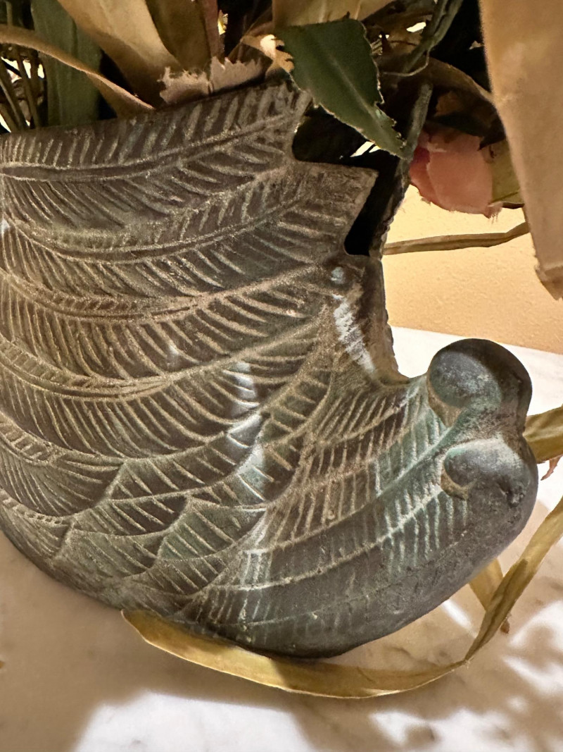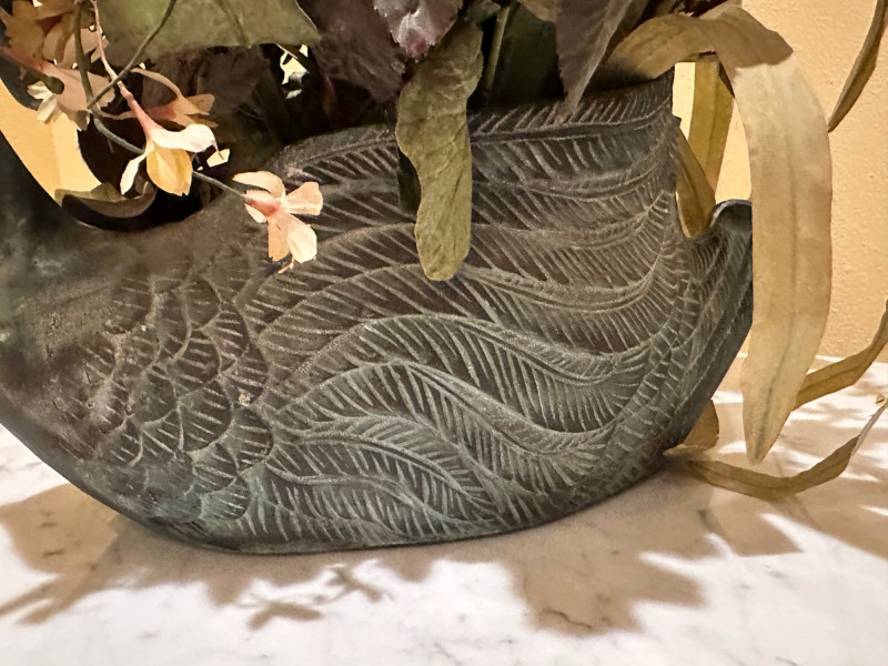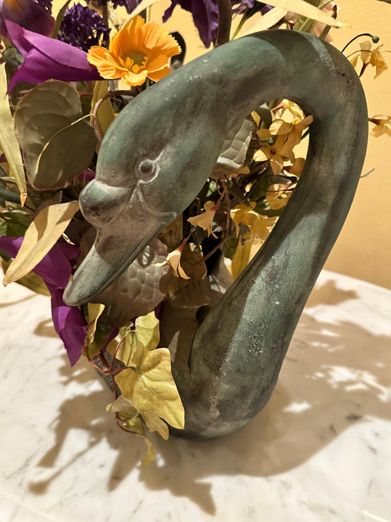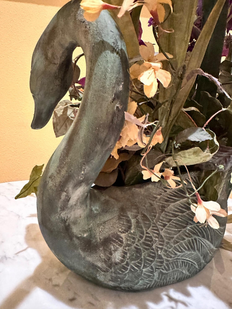This decorative Toyo swan planter features an elegant sculptural form with a gracefully curved neck and detailed feather-textured body. Finished in a soft green patina, the piece offers classic vintage charm and makes a striking accent for a tabletop, console, or entry display. The planter retains its original “Toyo – Made in Korea” label, indicating mid- to late-20th century production. It is currently filled with a coordinated silk floral arrangement, giving it an eye-catching, ready-to-display presentation. Maker: Toyo Marking: Original label reads “Toyo – Made in Korea” Type: Decorative planter / flower pot Motif: Swan Material: Metal Finish: Green patina with textured feather detailing Arrangement: Includes silk floral arrangement Dimensions (approx.): Length: 14.5" Height: 12" Width: 7" Origin: Korea Era: Vintage (mid- to late-20th century, approximate)Item Details: