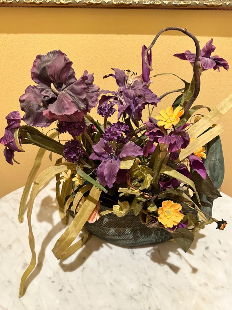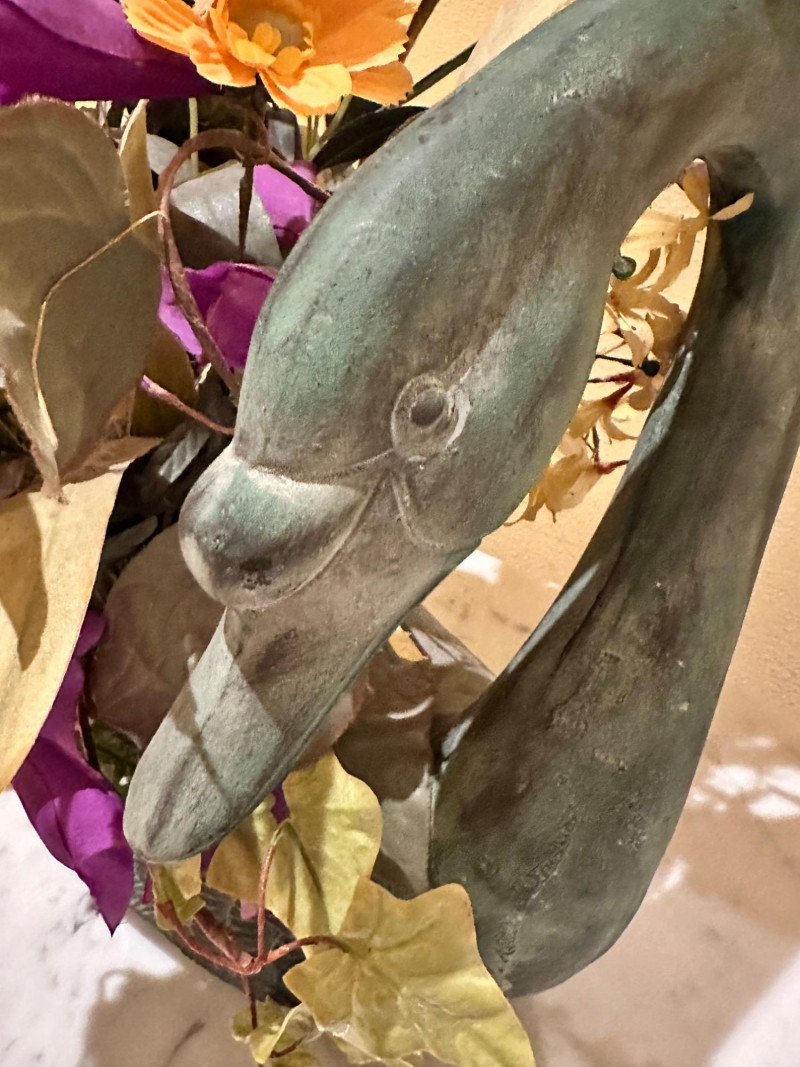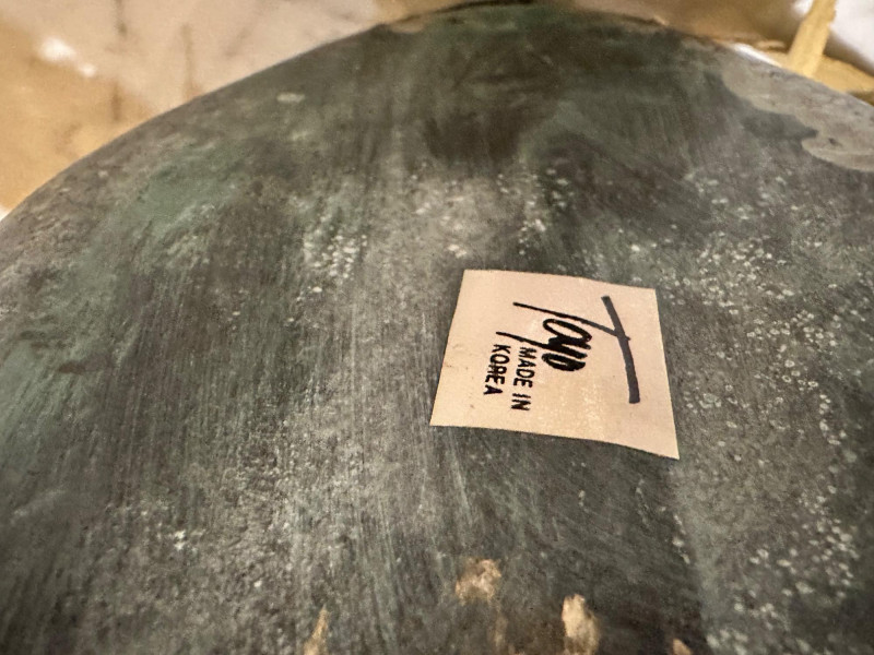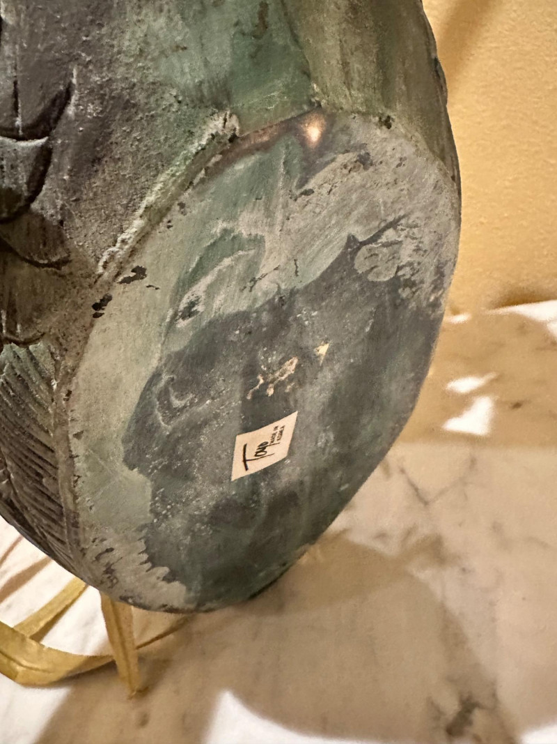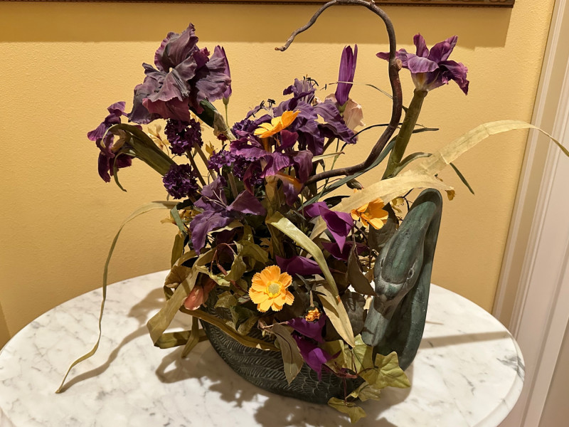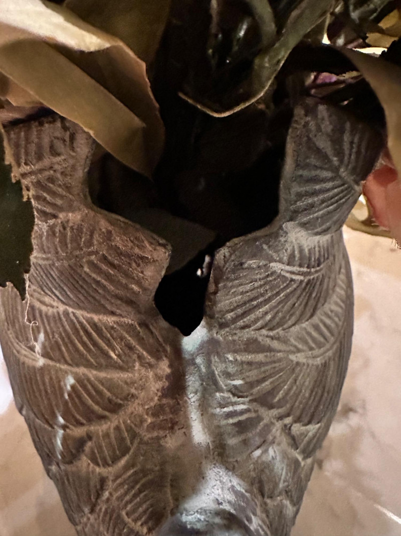 This decorative Toyo swan planter features an elegant sculptural form with a gracefully curved neck and detailed feather-textured body. Finished in a soft green patina, the piece offers classic vintage charm and makes a striking accent for a tabletop, console, or entry display. The planter retains its original “Toyo – Made in Korea” label, indicating mid- to late-20th century production. It is currently filled with a coordinated silk floral arrangement, giving it an eye-catching, ready-to-display presentation. Maker: Toyo Marking: Original label reads “Toyo – Made in Korea” Type: Decorative planter / flower pot Motif: Swan Material: Metal Finish: Green patina with textured feather detailing Arrangement: Includes silk floral arrangement Dimensions (approx.): Length: 14.5" Height: 12" Width: 7" Origin: Korea Era: Vintage (mid- to late-20th century, approximate)Item Details: