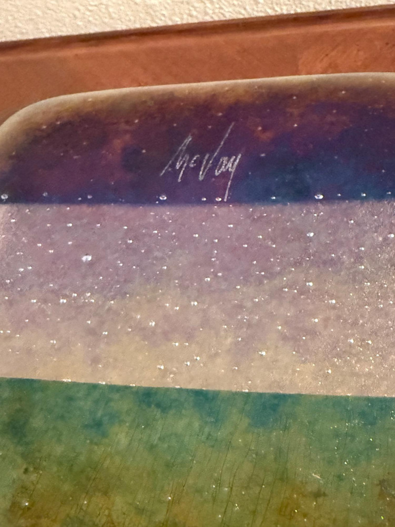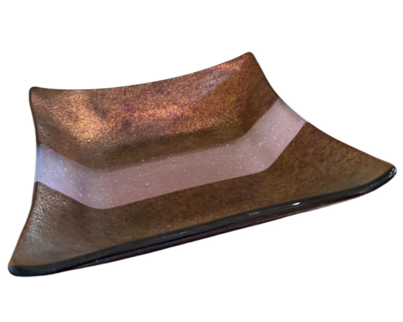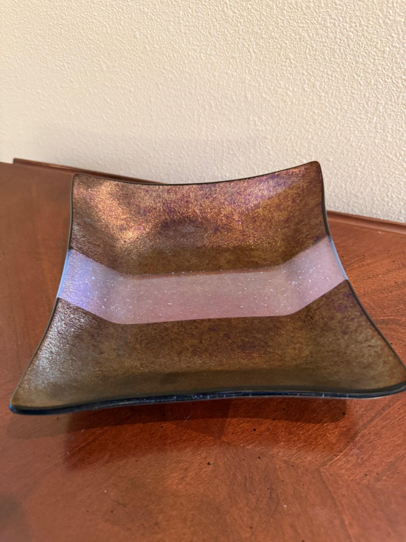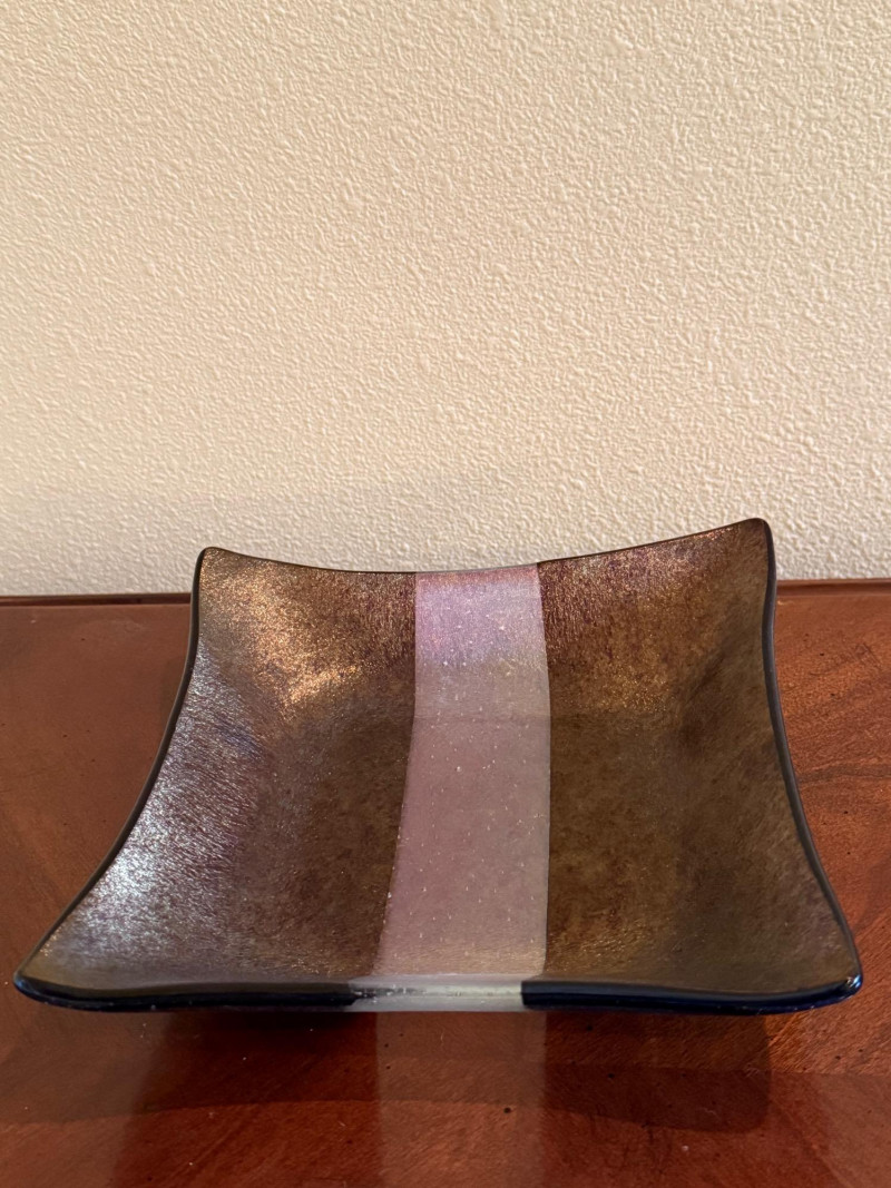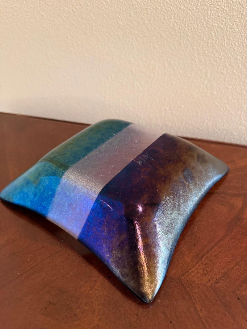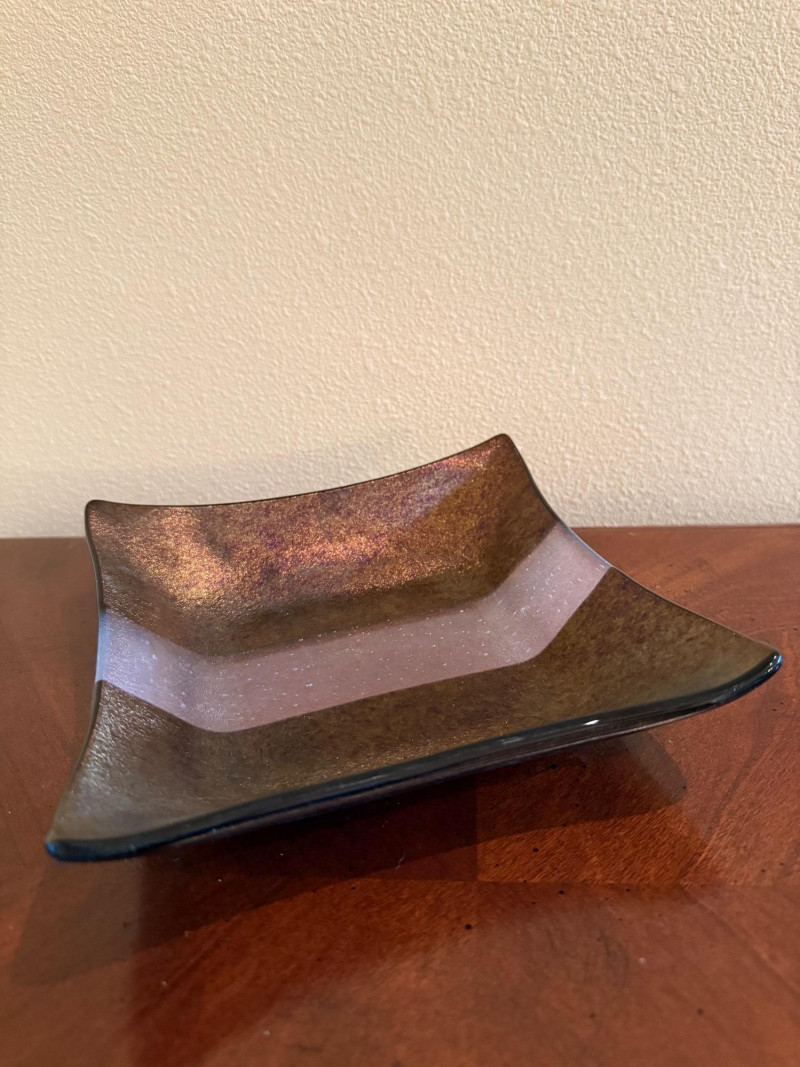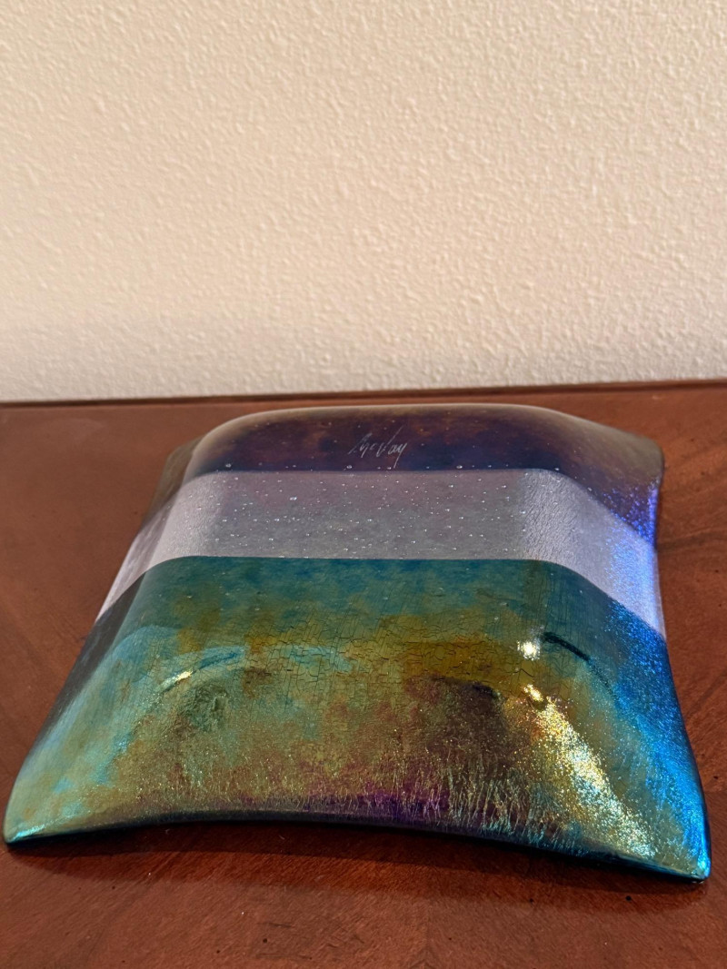 This signed square art glass dish is a handcrafted work by Kurt McVay, showcasing layered fused glass with luminous iridescent dichroic effects. The softly upturned square form features shimmering bands of bronze, gold, blue, lavender, and green, with a fine sparkling texture that creates depth and subtle color shifts under changing light. Signed on the underside by the artist, this piece is a strong example of contemporary studio art glass and works beautifully as a decorative display piece or accent dish. Artist: Kurt McVay Type: Art glass dish / square plate Material: Fused dichroic glass Shape: Square with gently upturned edges Color / Finish: Iridescent bronze, gold, blue, lavender, and green tones Signature: Signed on underside Style: Contemporary studio art glass Use: Decorative display or accent dish Approximate Size: 7" x 7"Item Details: