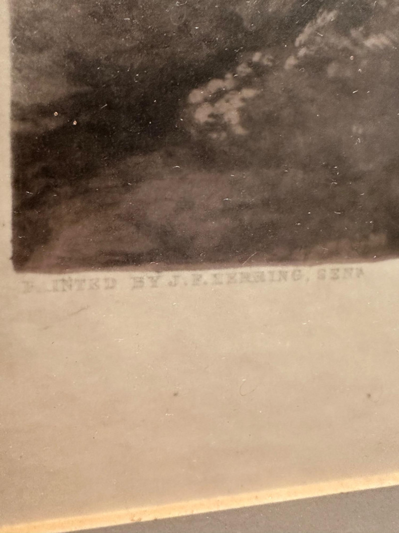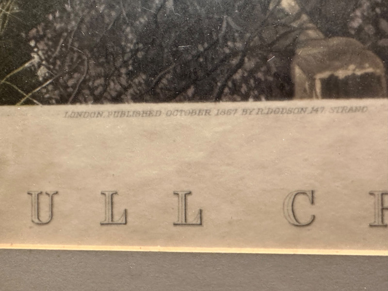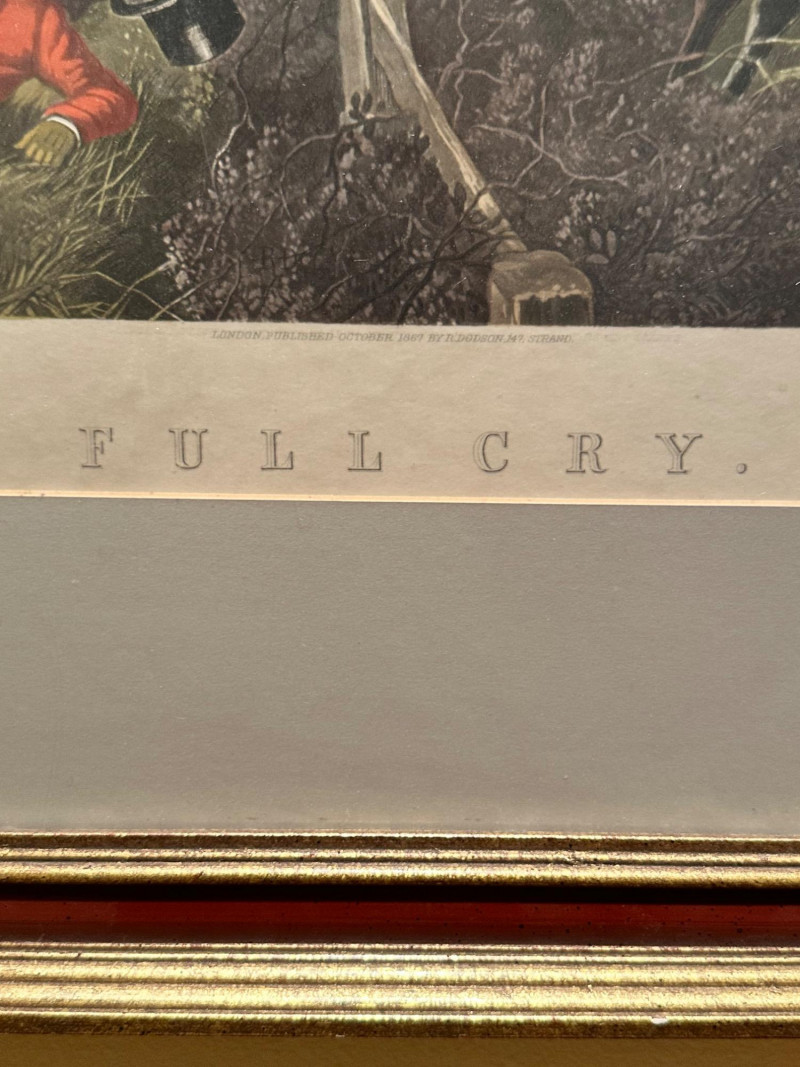 A classic Victorian sporting print from the celebrated series Herring’s Fox-Hunting Scenes, depicting the dramatic moment known as “Full Cry”—when horse and hounds surge forward at top speed. The composition captures the energy of the hunt with finely detailed riders in red coats, galloping horses, and a sweeping English countryside backdrop. This example is a hand-colored engraving, richly tinted in period style. The plate is titled “FULL CRY” beneath the image, with the series title above. Along the lower margin appears the original publication line: “London, Published October 1867 by R. Dodson, 147 Strand.” The work is after John Frederick Herring Sr., one of the most influential British sporting artists of the 19th century, whose fox-hunting scenes remain highly collectible. Professionally matted and housed in a traditional wood frame, this piece presents beautifully as wall décor for a study, library, or equestrian-themed interior. Title: Full Cry Series: Herring’s Fox-Hunting Scenes Artist: After John Frederick Herring Sr. Medium: Hand-colored engraving (print) Publisher: R. Dodson Place & Date: London, October 1867 Subject: Victorian fox hunting / equestrian sporting scene Presentation: Framed and matted (as shown)Item Details: