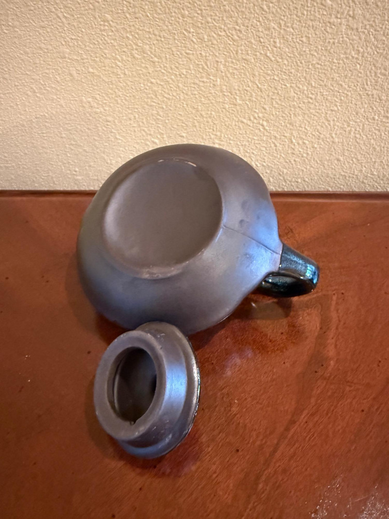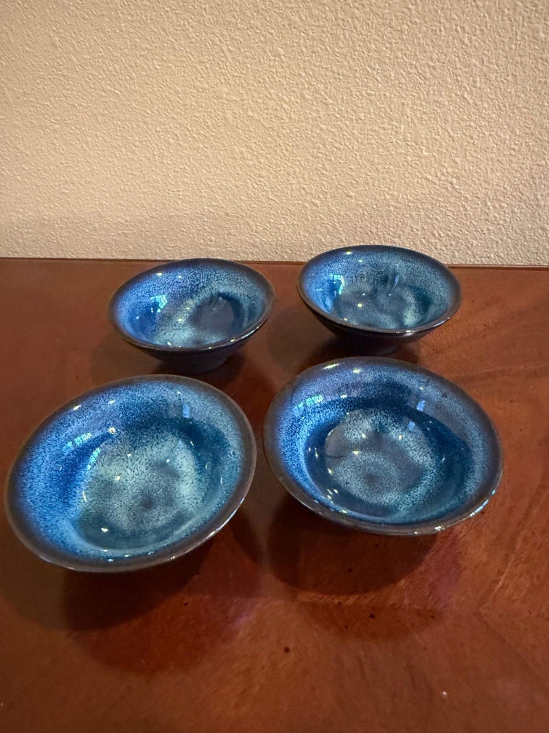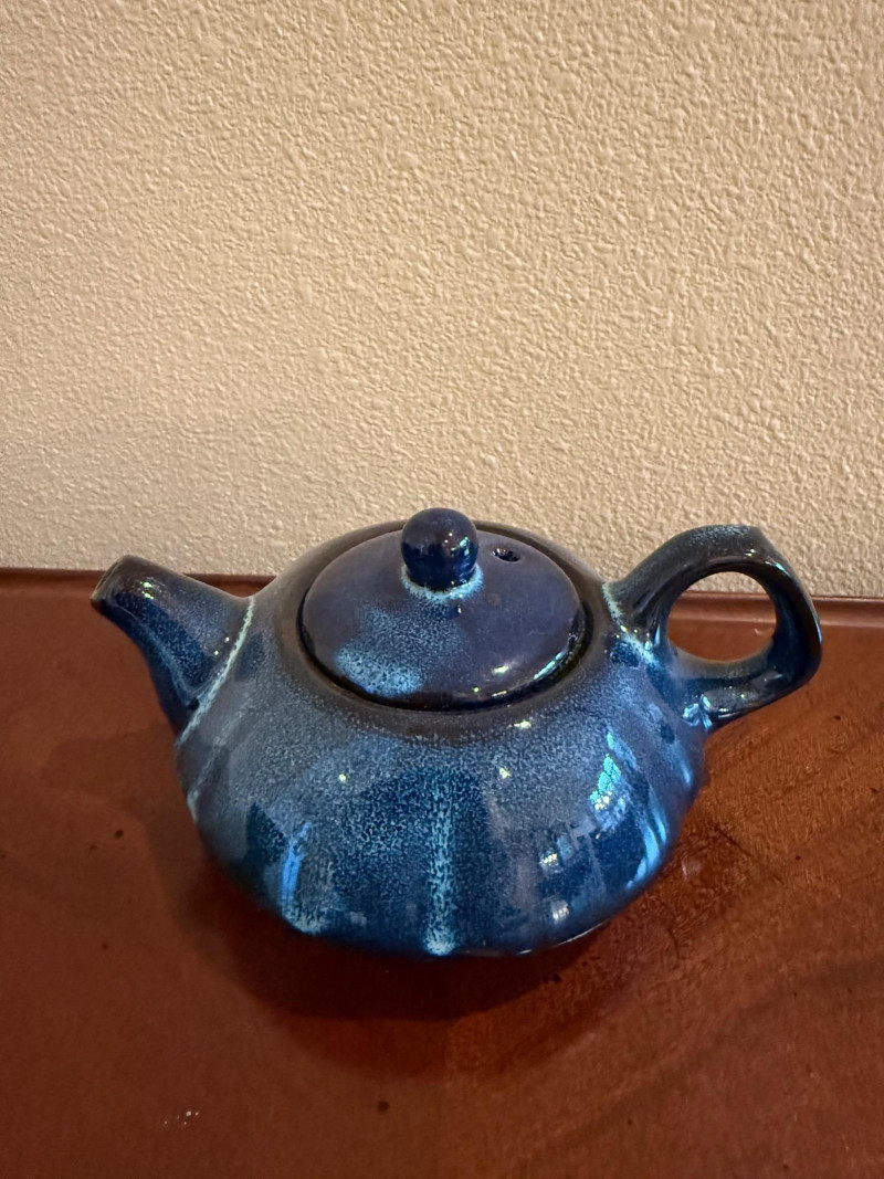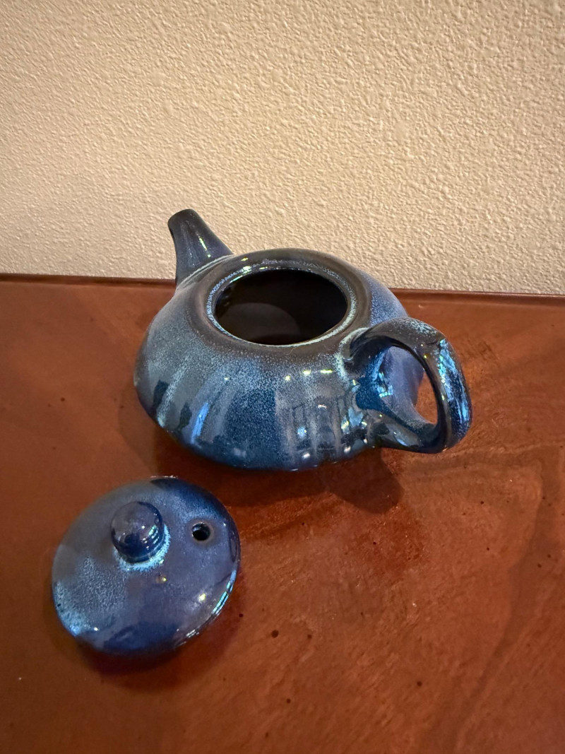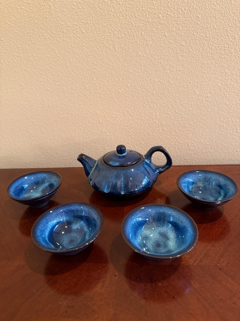 This blue glazed ceramic tea set features a Japanese tea pot with four matching cups. The set displays a rich blue glaze with subtle speckled variation, giving it a clean, minimalist appearance. The compact tea pot form with loop handle and fitted lid is paired with shallow bowl-style cups, suitable for tea service or display. Set Includes: 1 Japanese tea pot with lid 4 tea cups Material: Ceramic / pottery Color: Blue glaze Style: Japanese tea pot style Maker / Mark: Unmarked Era: Modern Tea Cups: 2.5" diameter × 1.5" tall Tea Pot: 5" wide × 2.5" tall (excluding spout and handle)Item Details