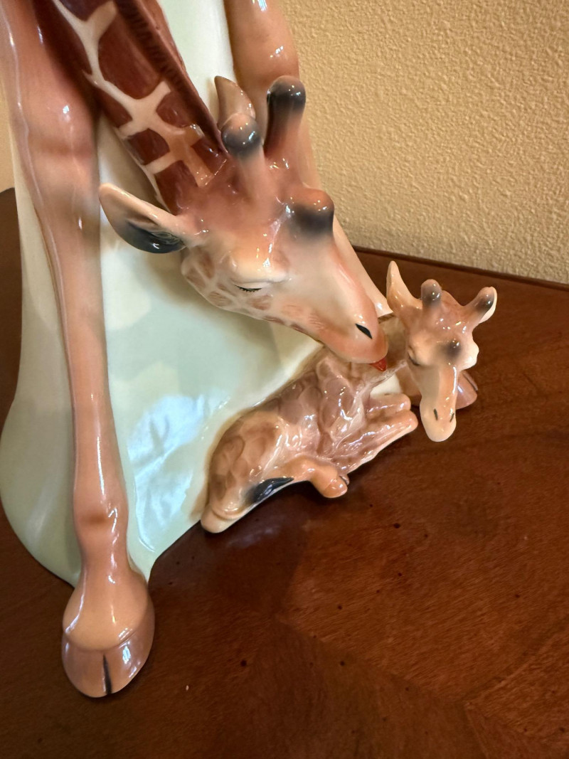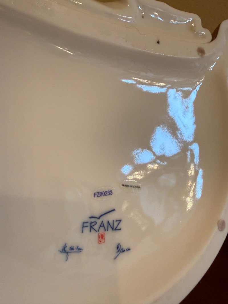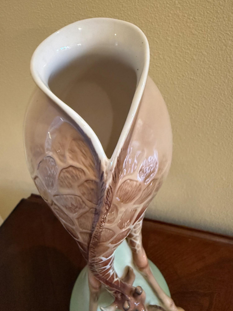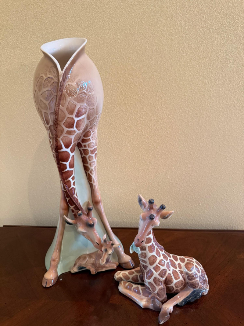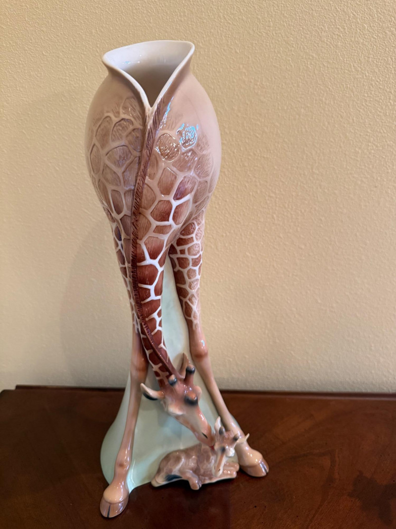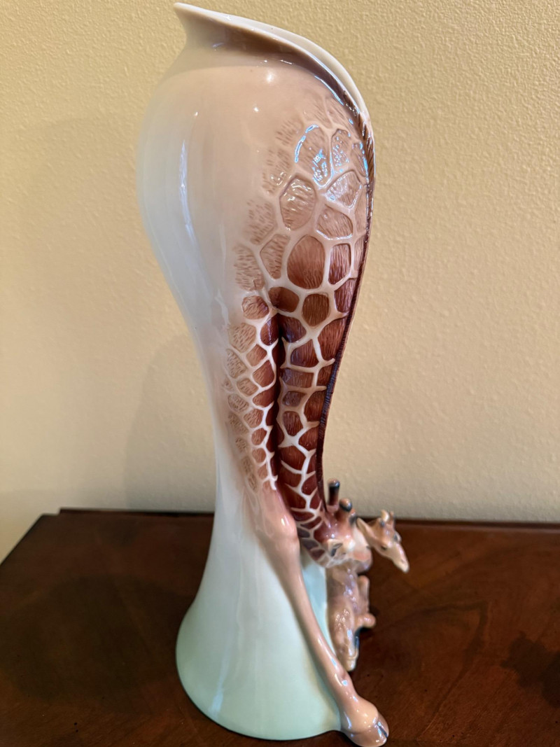 An elegant and highly collectible Franz Collection porcelain vase featuring a tender giraffe mother and baby motif, accompanied by a matching reclining giraffe figurine. The tall sculptural vase is beautifully modeled with flowing organic lines and an integrated opening at the top, officially designed and marketed by Franz as a vase. Finished in soft cream, tan, and brown tones with delicate hand-painted details, this piece exemplifies Franz’s signature blend of fine art and functional design. The companion figurine depicts a resting giraffe holding a leaf, making this an eye-catching and harmonious display set for collectors of Franz, animal art, or decorative porcelain. Marked on the underside with Franz branding and model number FZ00233, consistent with authentic Franz Collection production. Maker / Brand: Franz Collection Type: Porcelain vase with matching figurine Model Number (Vase): FZ00233 Design: Giraffe mother & baby; reclining giraffe figurine Material: Glazed porcelain Color / Finish: Cream, tan, brown, and soft green accents Height (Vase): Approx. 15.5 inches Marks: Franz Collection mark on underside; Made in China Era: Modern / ContemporaryItem Details: