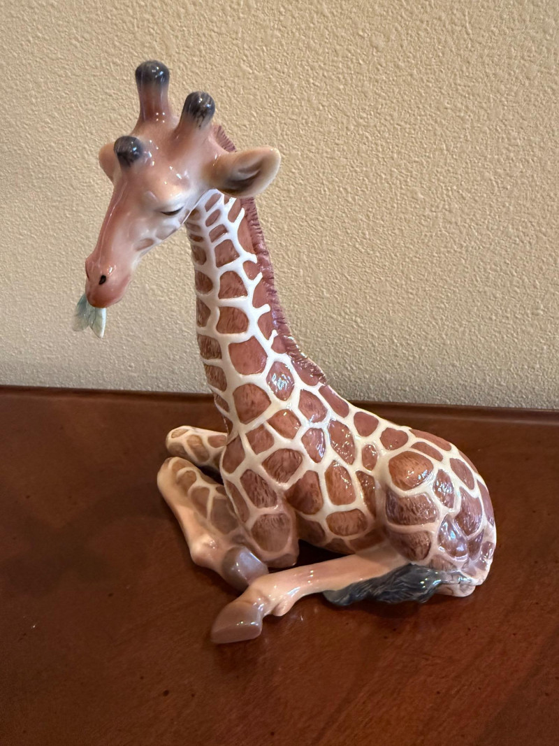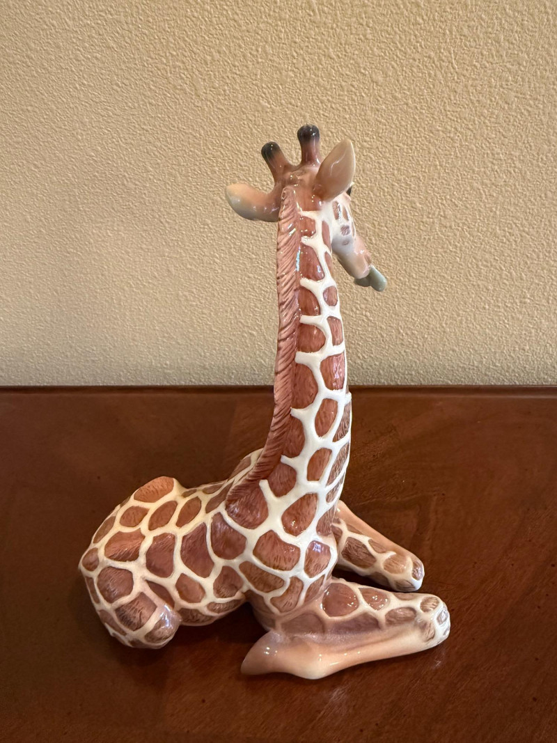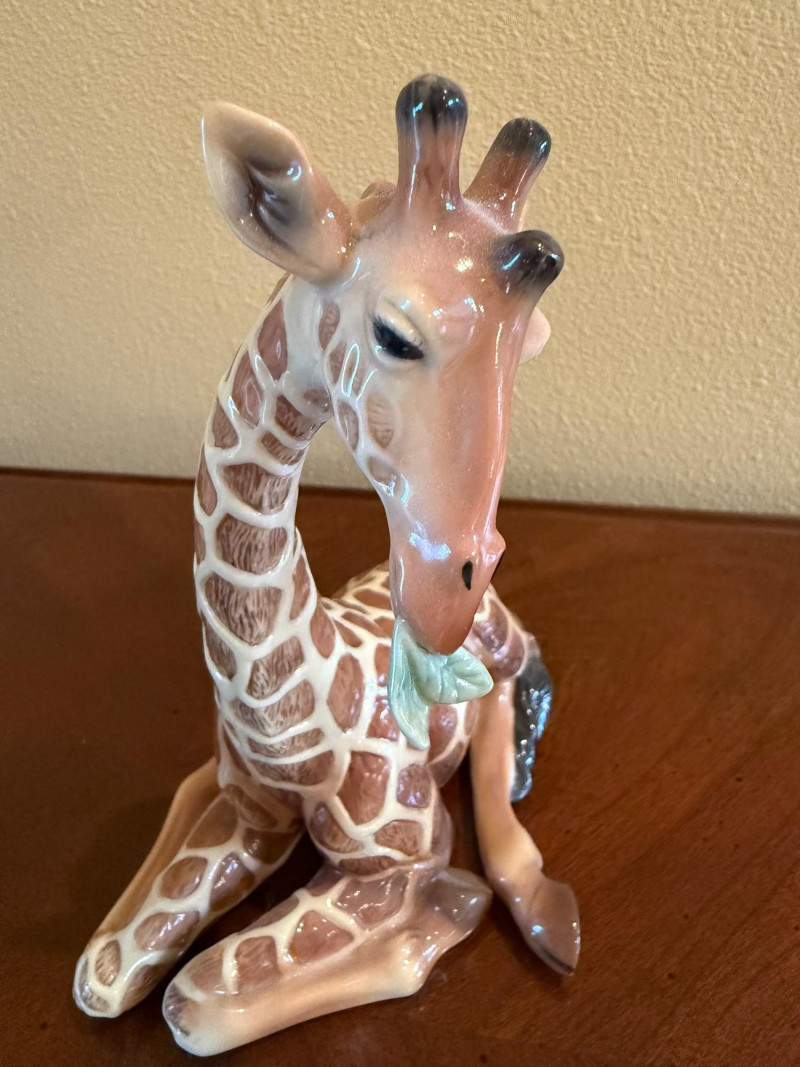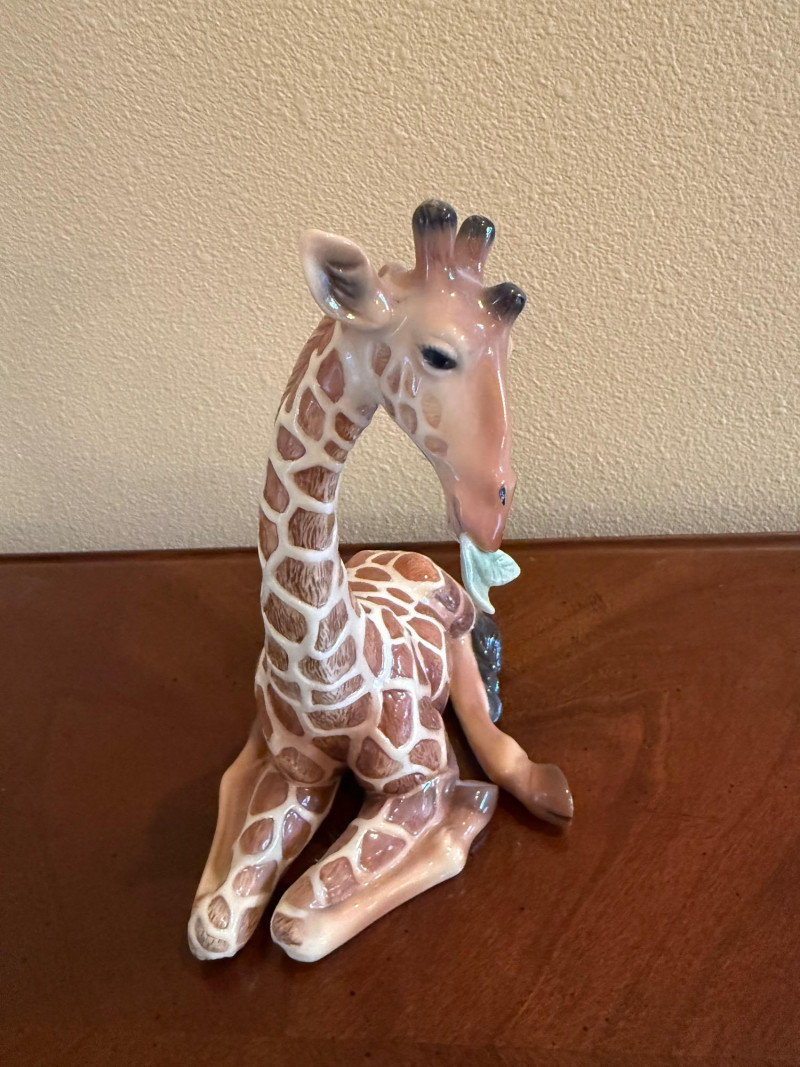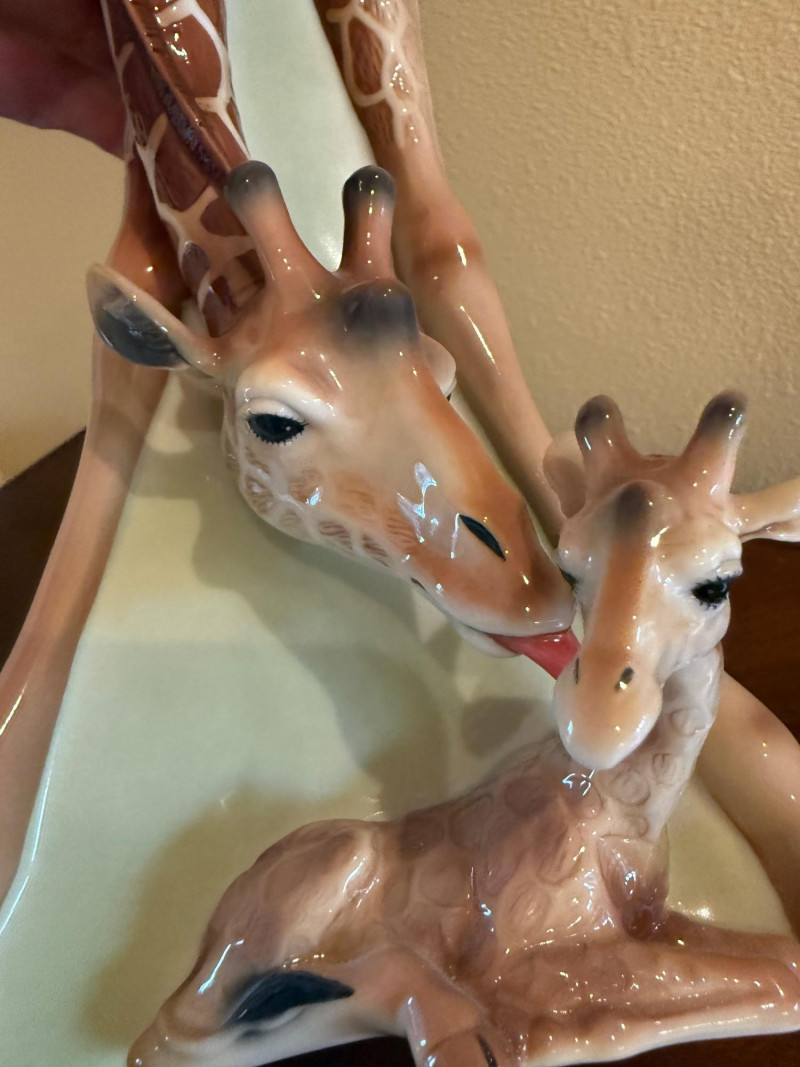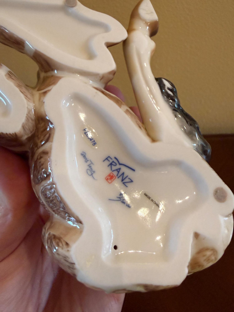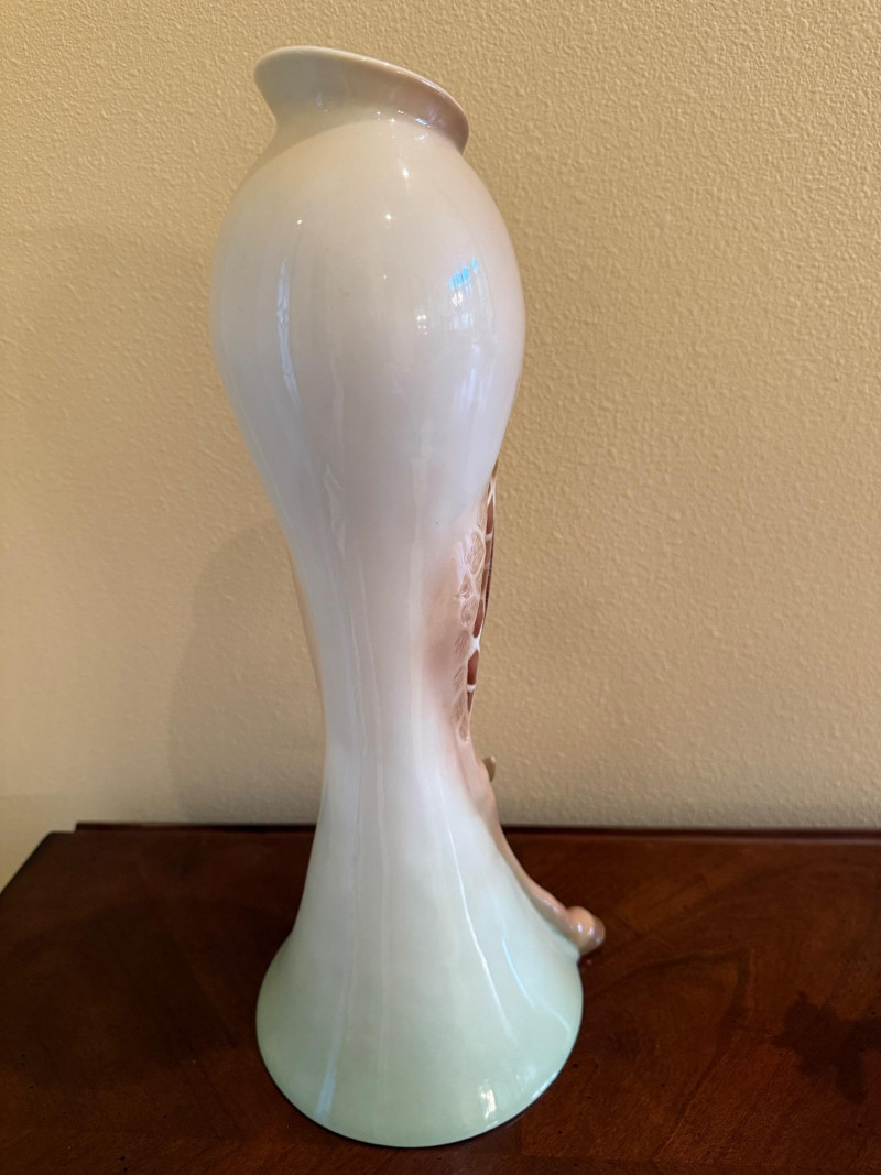 An elegant and highly collectible Franz Collection porcelain vase featuring a tender giraffe mother and baby motif, accompanied by a matching reclining giraffe figurine. The tall sculptural vase is beautifully modeled with flowing organic lines and an integrated opening at the top, officially designed and marketed by Franz as a vase. Finished in soft cream, tan, and brown tones with delicate hand-painted details, this piece exemplifies Franz’s signature blend of fine art and functional design. The companion figurine depicts a resting giraffe holding a leaf, making this an eye-catching and harmonious display set for collectors of Franz, animal art, or decorative porcelain. Marked on the underside with Franz branding and model number FZ00233, consistent with authentic Franz Collection production. Maker / Brand: Franz Collection Type: Porcelain vase with matching figurine Model Number (Vase): FZ00233 Design: Giraffe mother & baby; reclining giraffe figurine Material: Glazed porcelain Color / Finish: Cream, tan, brown, and soft green accents Height (Vase): Approx. 15.5 inches Marks: Franz Collection mark on underside; Made in China Era: Modern / ContemporaryItem Details: