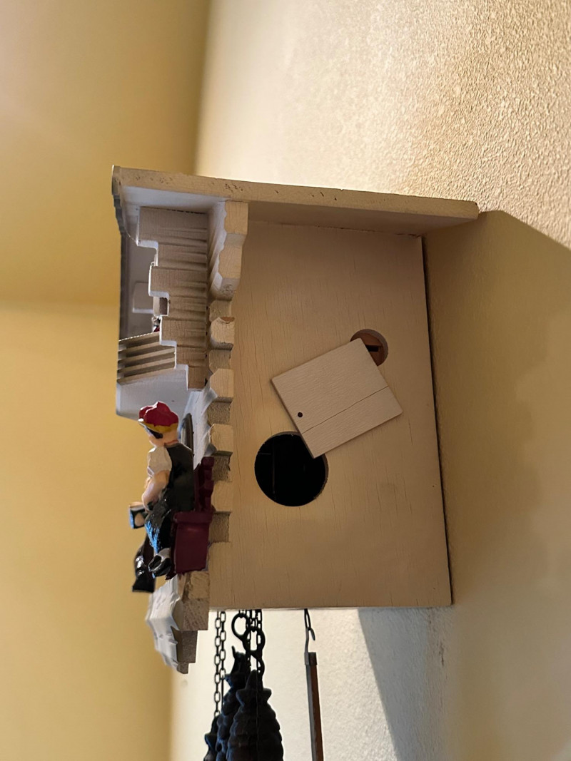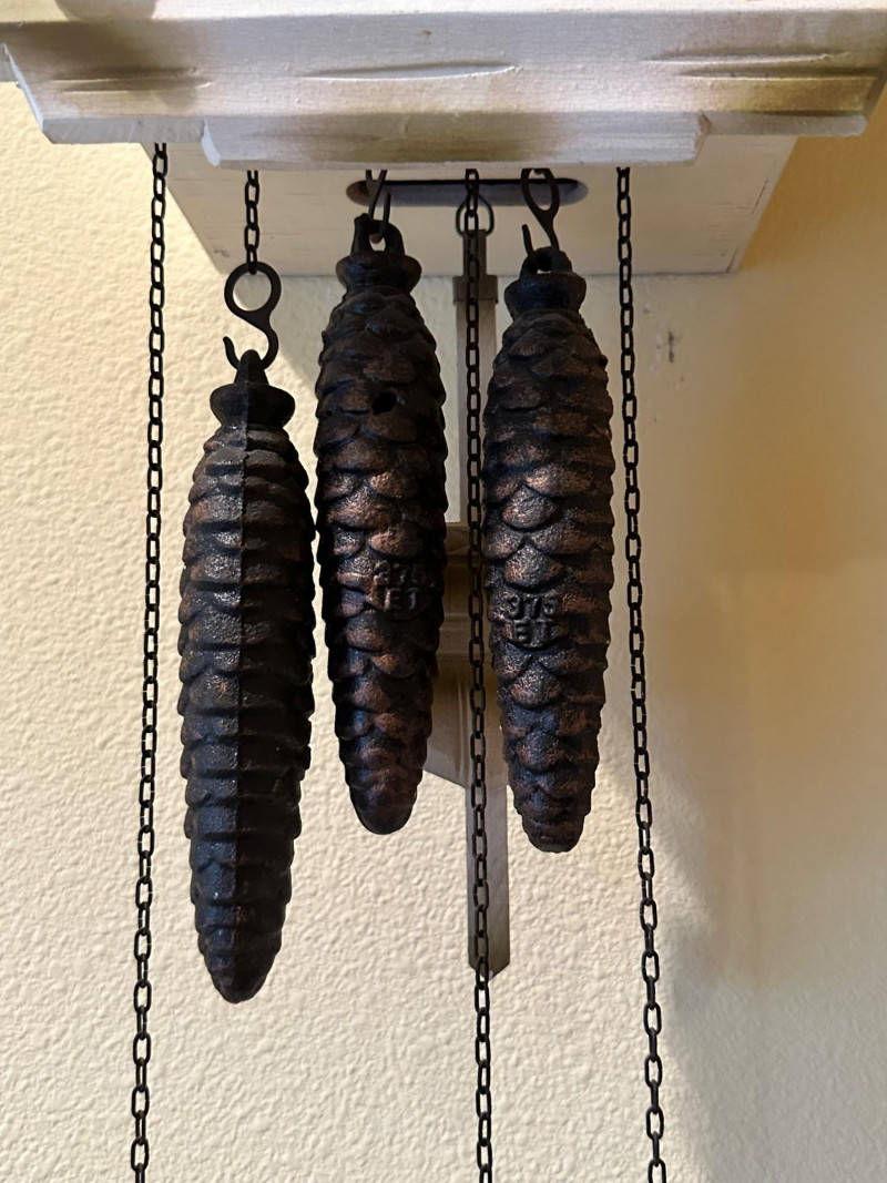 The clock is driven by three pinecone-shaped cast-iron weights suspended on chains, creating the traditional movement and sound associated with classic cuckoo clocks. A warm and animated wall piece that adds character and old-world charm to any space.Item Details: