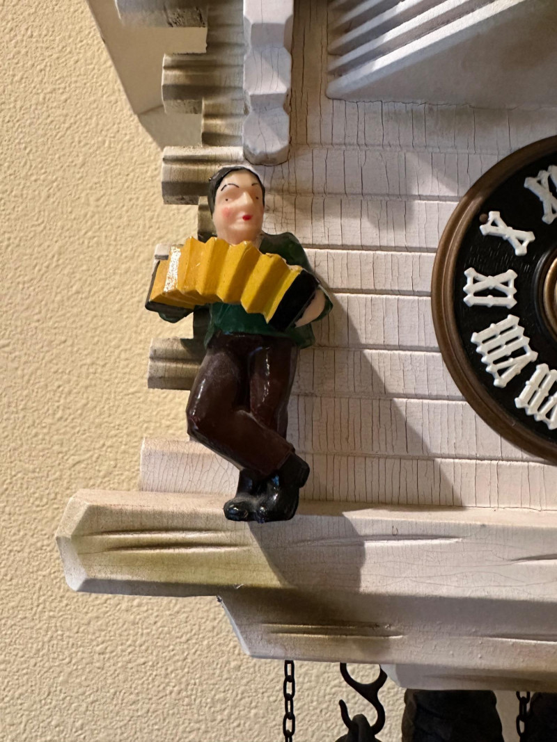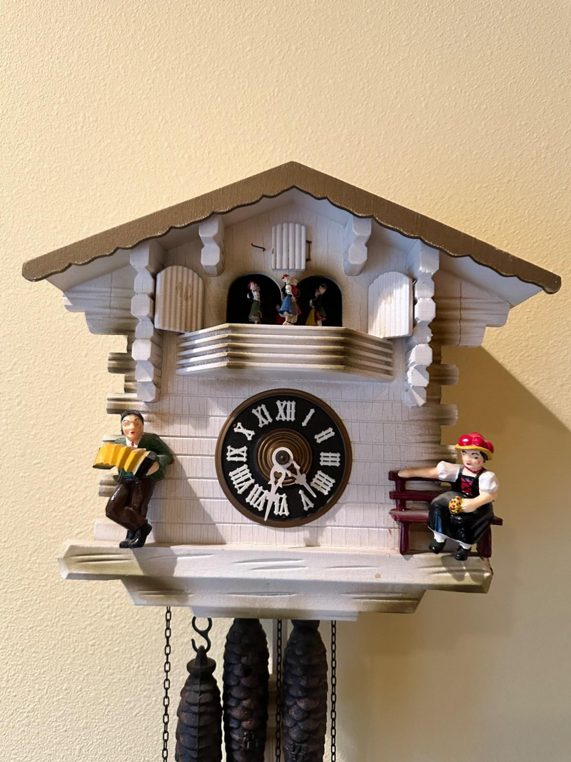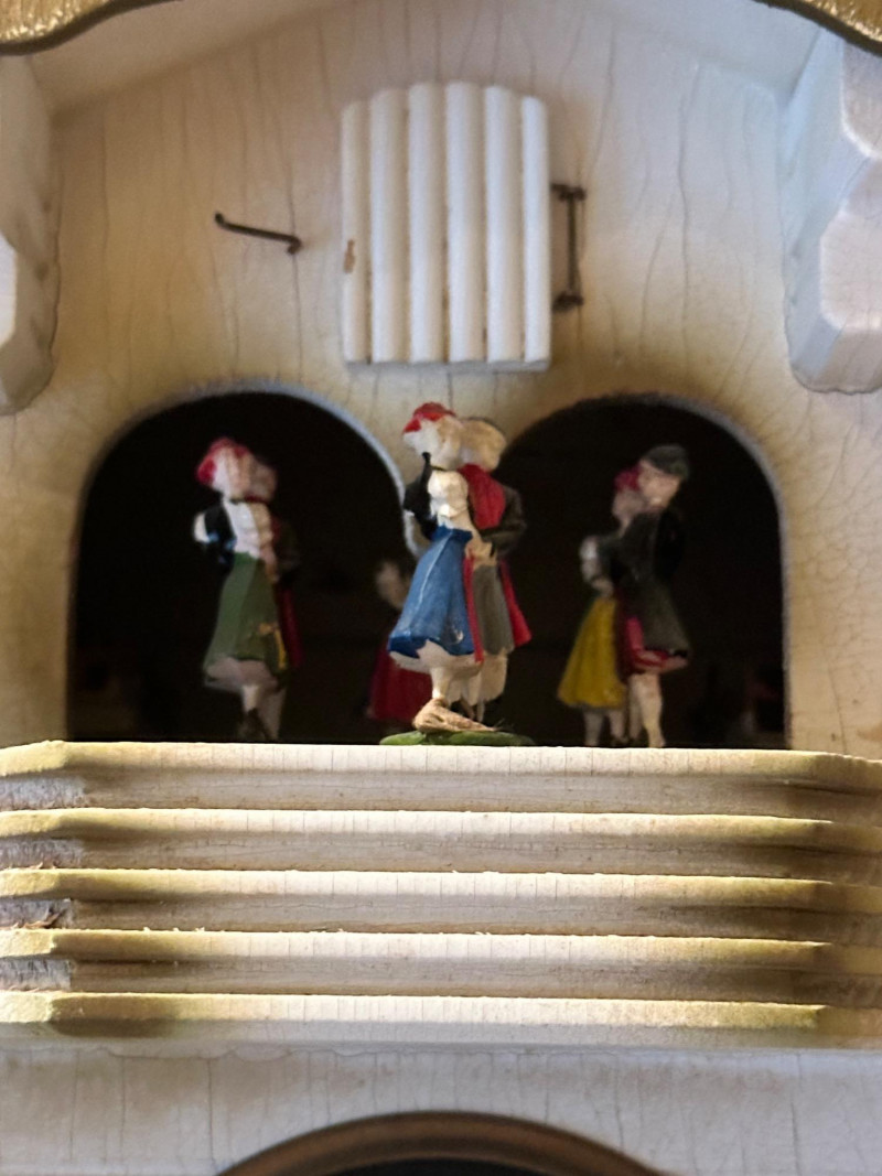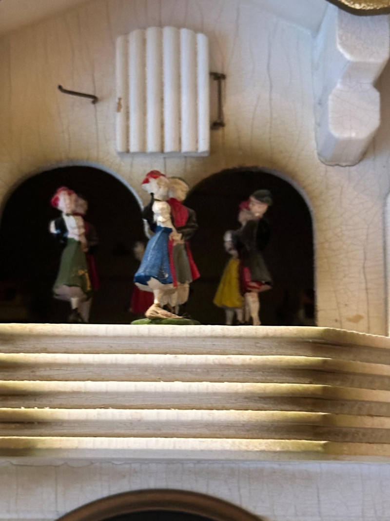 Charming vintage German-style cuckoo clock crafted in the classic Black Forest chalet tradition. The carved wooden case features a pitched roof, balcony stage, and detailed figurines. On the hour, the upper balcony reveals dancing figures, while the lower façade displays seated musicians flanking a black dial with raised Roman numerals. Type: Cuckoo Clock (German / Black Forest style) Movement: Mechanical, chain-driven Weights: Three cast-iron pinecone weights (included) Dial: Black face with raised Roman numerals and white hands Case: Carved wood chalet-style housing Features: Animated dancers on upper balcony; musician figurines on front Mounting: Wall mount Origin: German-style (maker unmarked) Power: Weight-driven (no batteries) Clock is in working condition