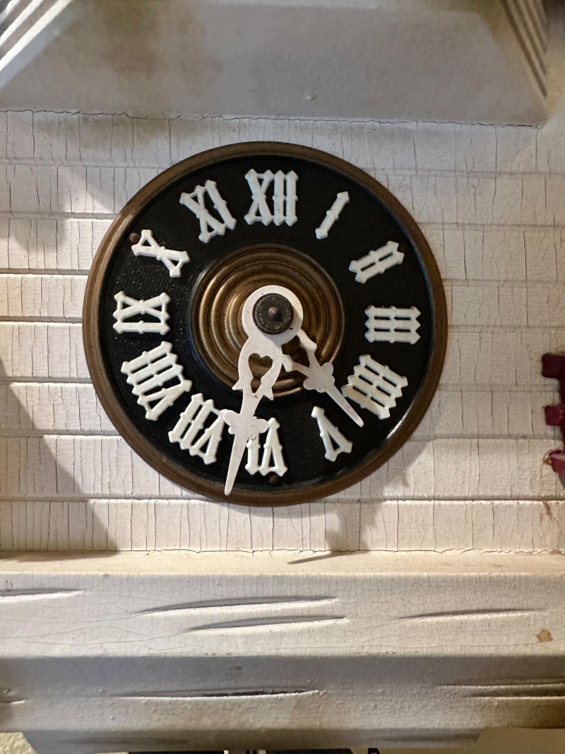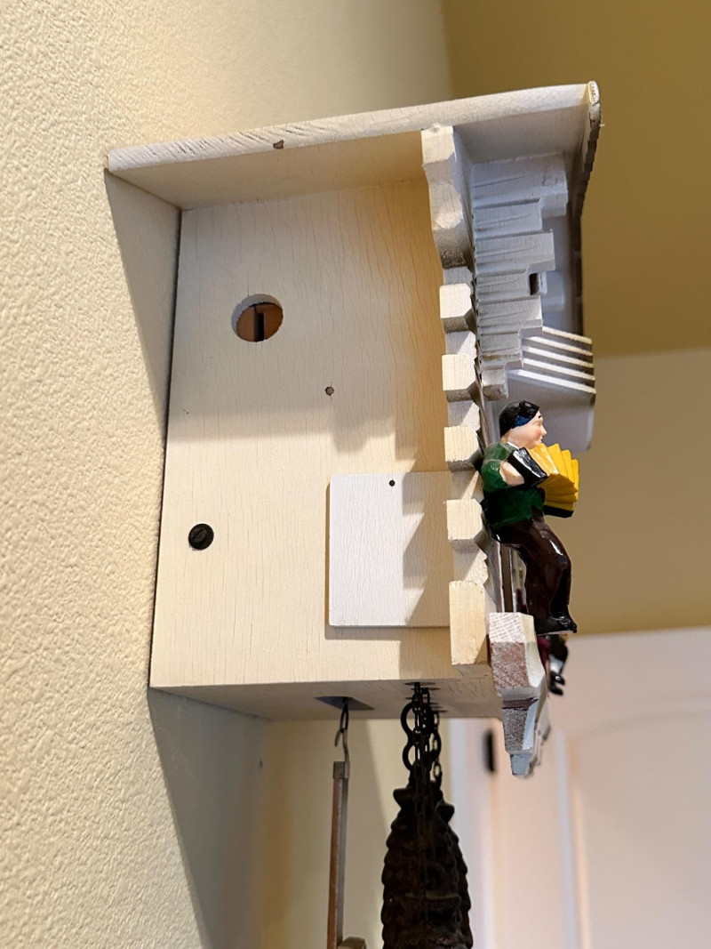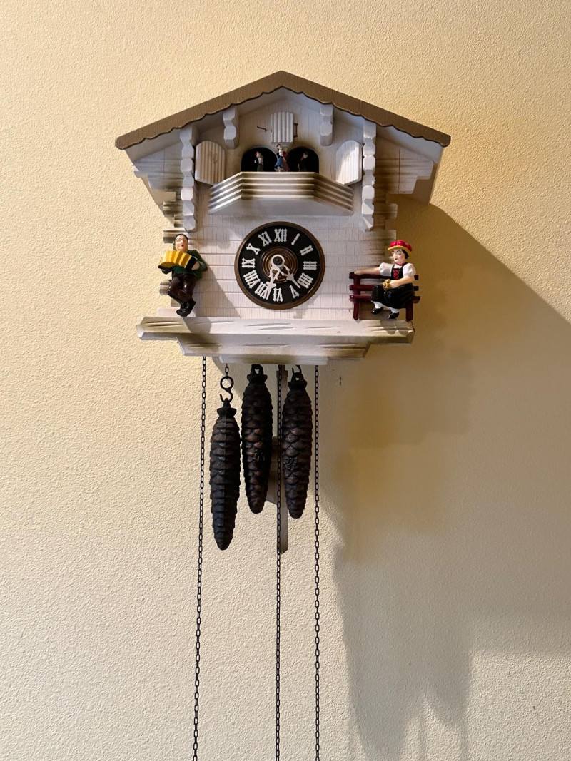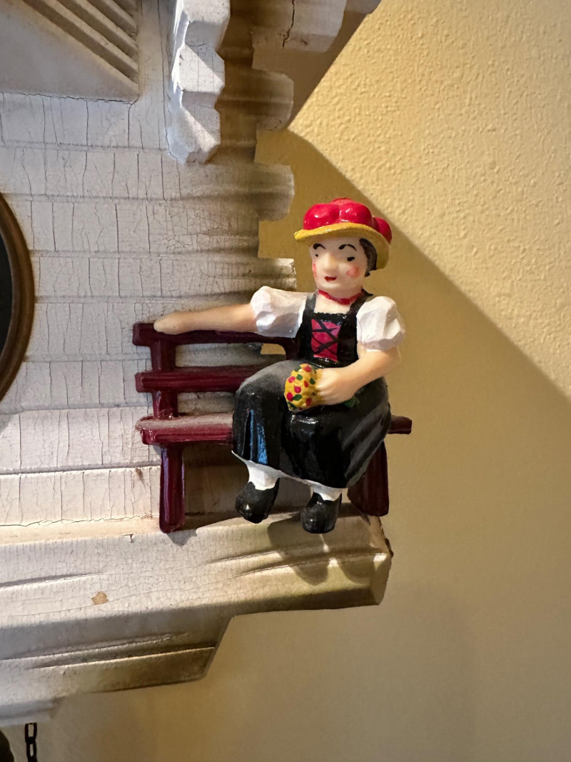Charming vintage German-style cuckoo clock crafted in the classic Black Forest chalet tradition. The carved wooden case features a pitched roof, balcony stage, and detailed figurines. On the hour, the upper balcony reveals dancing figures, while the lower façade displays seated musicians flanking a black dial with raised Roman numerals. Type: Cuckoo Clock (German / Black Forest style) Movement: Mechanical, chain-driven Weights: Three cast-iron pinecone weights (included) Dial: Black face with raised Roman numerals and white hands Case: Carved wood chalet-style housing Features: Animated dancers on upper balcony; musician figurines on front Mounting: Wall mount Origin: German-style (maker unmarked) Power: Weight-driven (no batteries) Clock is in working condition