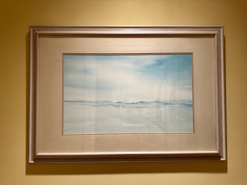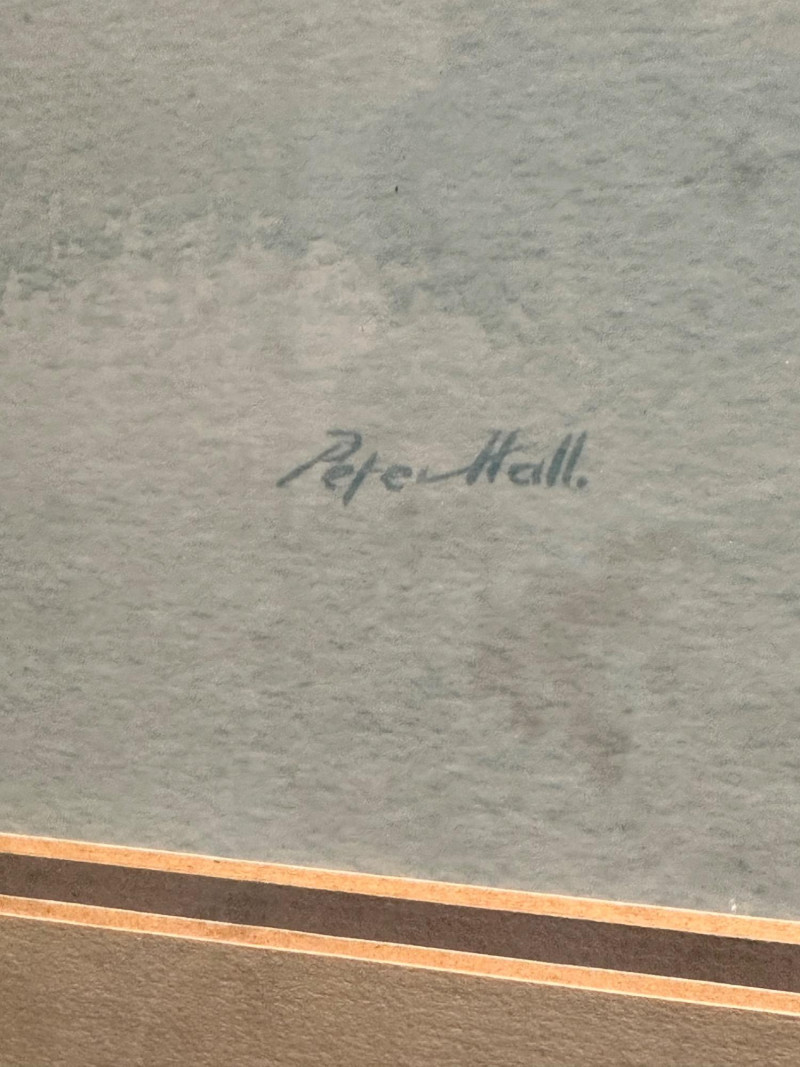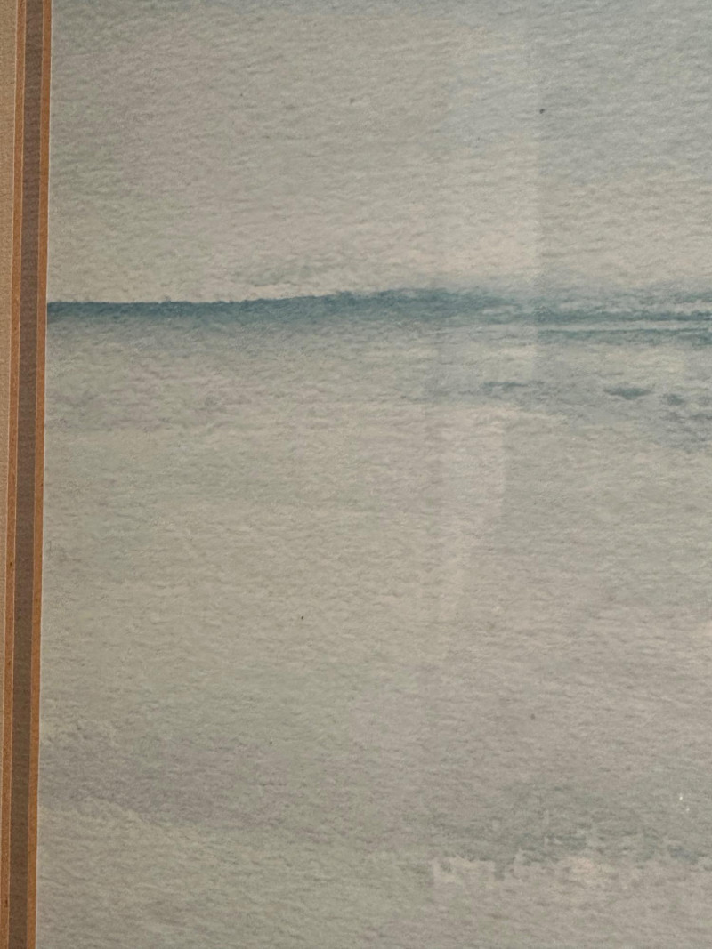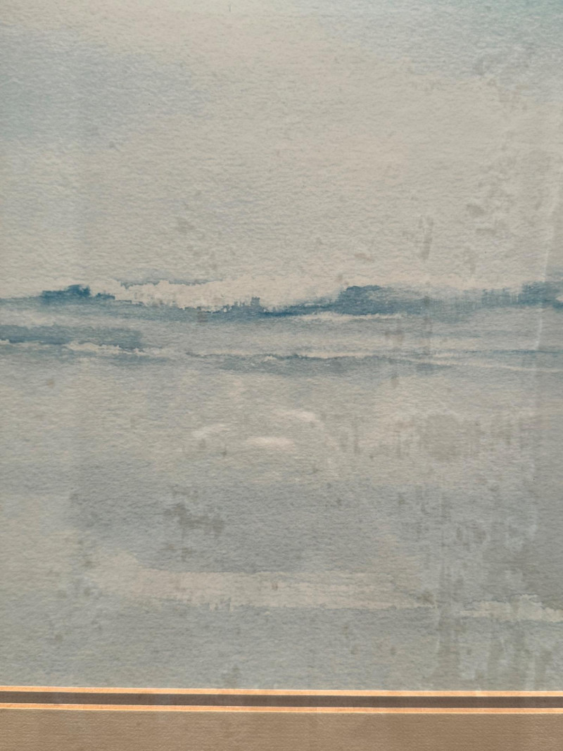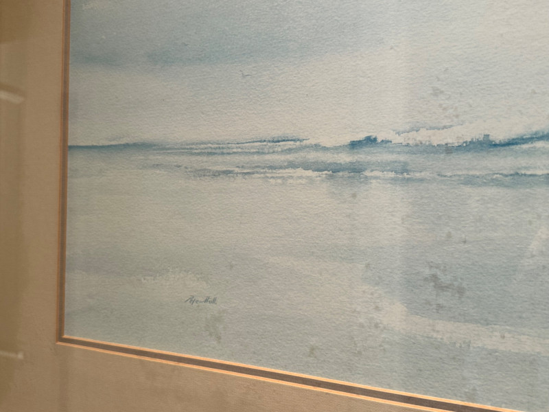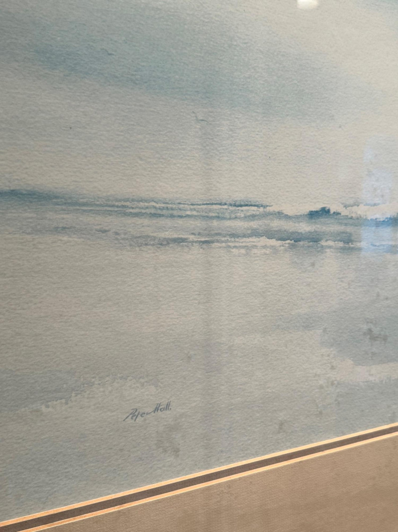 This serene framed seascape depicts a calm coastal horizon rendered in soft, atmospheric blue and gray washes. The composition emphasizes a low horizon line with gentle movement across the water, creating a peaceful, minimalist coastal scene. The watercolor is signed Peter Hall in the lower area of the artwork. The piece is professionally framed with a wide neutral mat and a substantial molded wood frame, presenting the artwork in a classic, gallery-style format. A Windsor Art Products Incorporated label remains on the reverse, indicating U.S. manufacture of the framing components. This artwork would complement coastal, traditional, or transitional interiors and works well as a statement piece over a sofa, console, or hallway wall. Artist: Peter Hall (signed) Title: Seascape (descriptive) Medium: Watercolor on paper Subject: Coastal seascape / horizon view Frame: Wood frame with wide mat, under glass Manufacturer Label (Frame): Windsor Art Products Incorporated, Pico Rivera, California, USA Orientation: HorizontalItem Details: