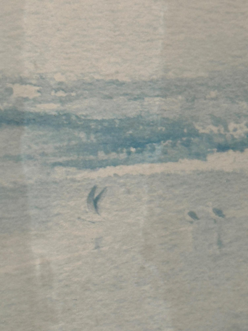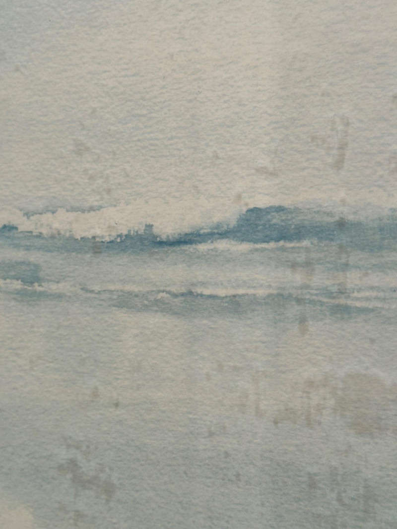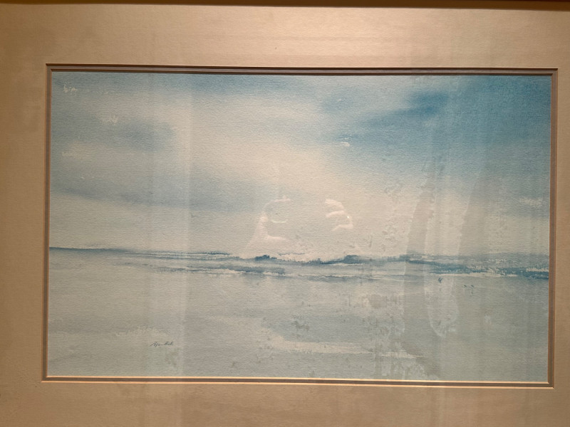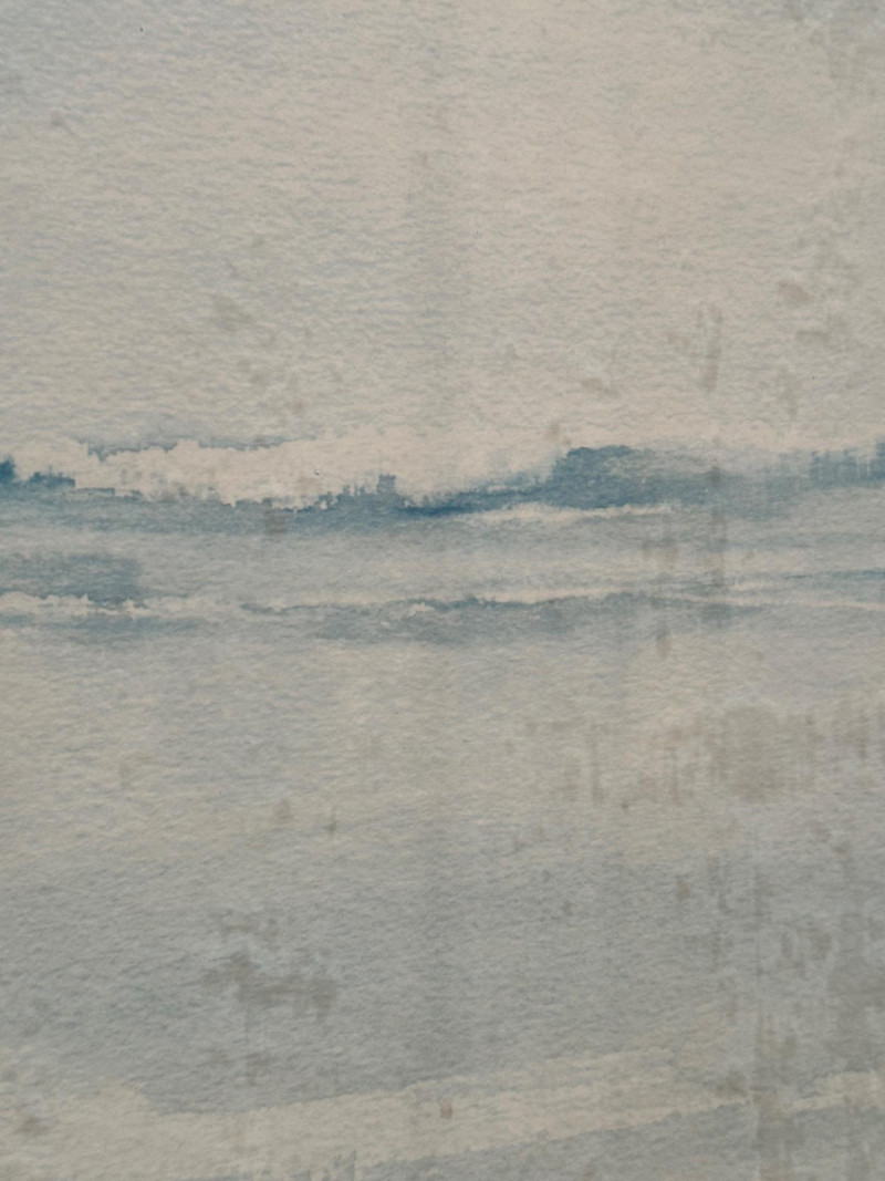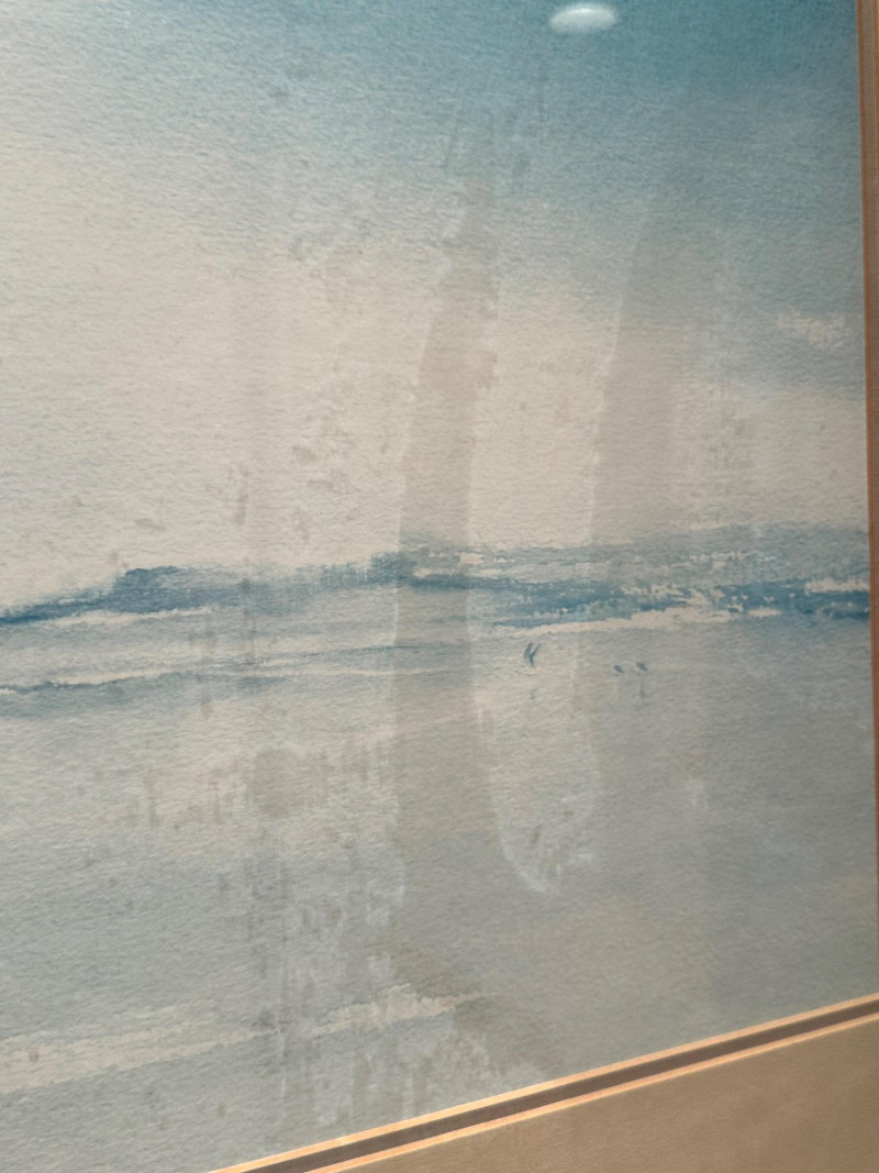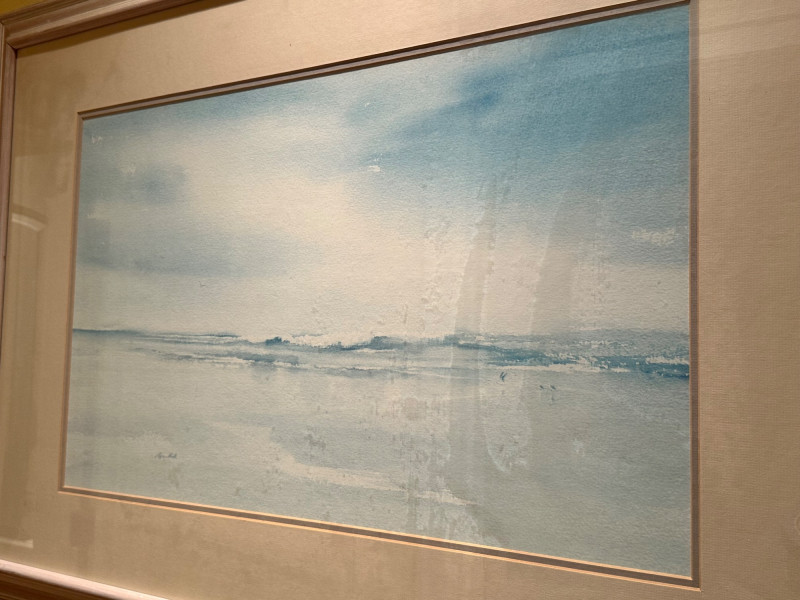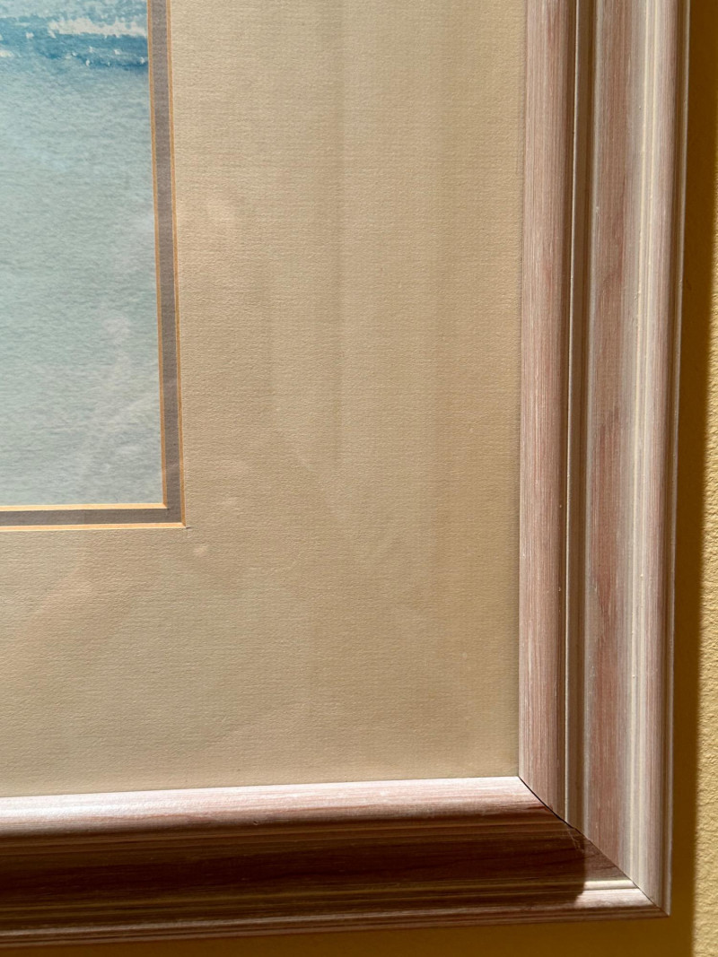 This serene framed seascape depicts a calm coastal horizon rendered in soft, atmospheric blue and gray washes. The composition emphasizes a low horizon line with gentle movement across the water, creating a peaceful, minimalist coastal scene. The watercolor is signed Peter Hall in the lower area of the artwork. The piece is professionally framed with a wide neutral mat and a substantial molded wood frame, presenting the artwork in a classic, gallery-style format. A Windsor Art Products Incorporated label remains on the reverse, indicating U.S. manufacture of the framing components. This artwork would complement coastal, traditional, or transitional interiors and works well as a statement piece over a sofa, console, or hallway wall. Artist: Peter Hall (signed) Title: Seascape (descriptive) Medium: Watercolor on paper Subject: Coastal seascape / horizon view Frame: Wood frame with wide mat, under glass Manufacturer Label (Frame): Windsor Art Products Incorporated, Pico Rivera, California, USA Orientation: HorizontalItem Details: