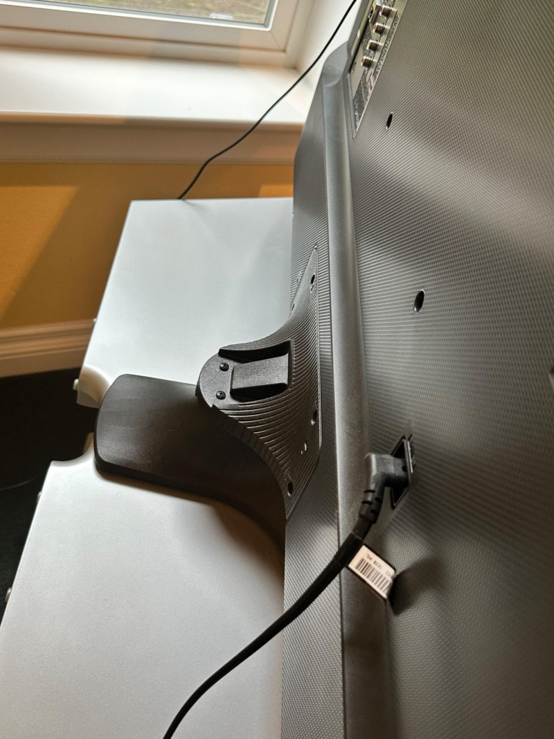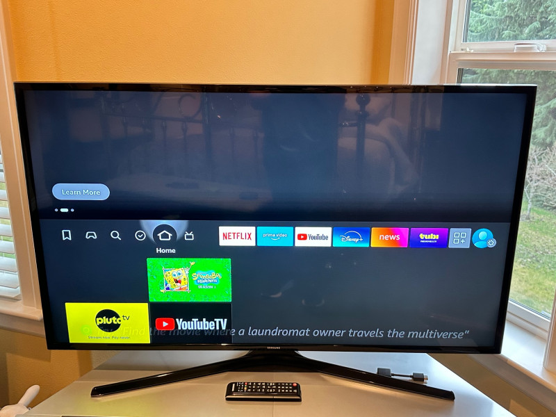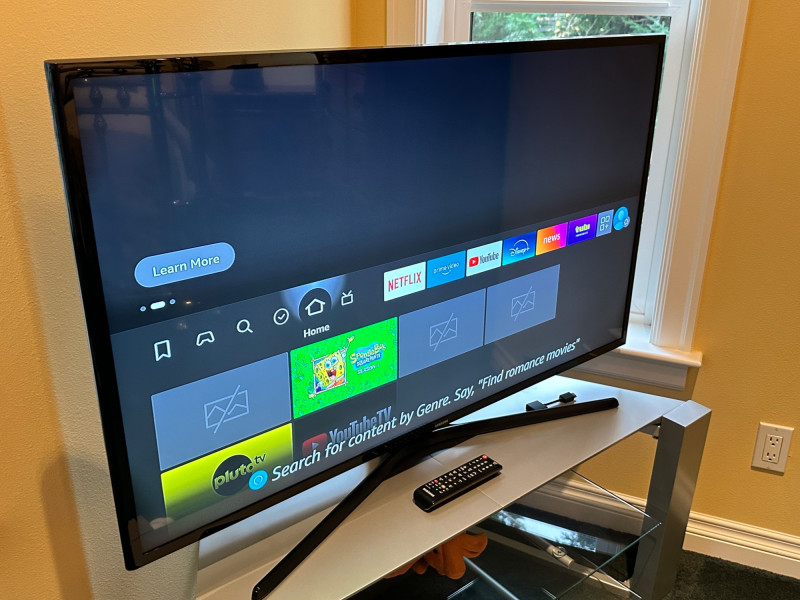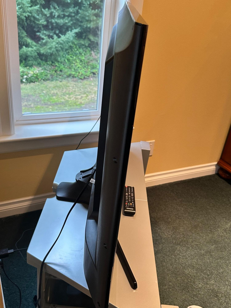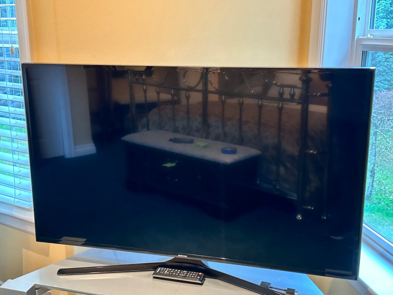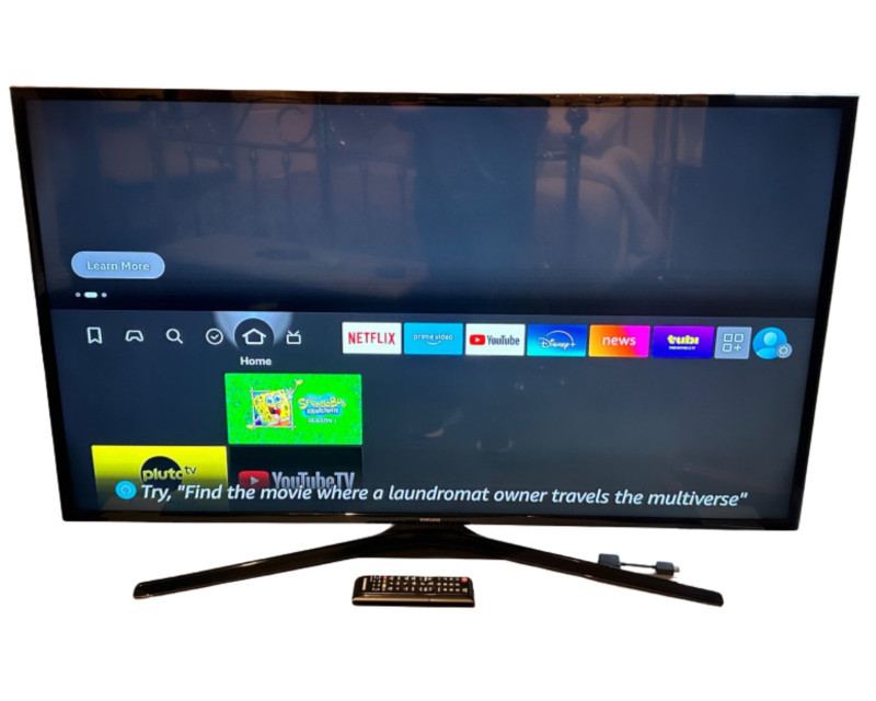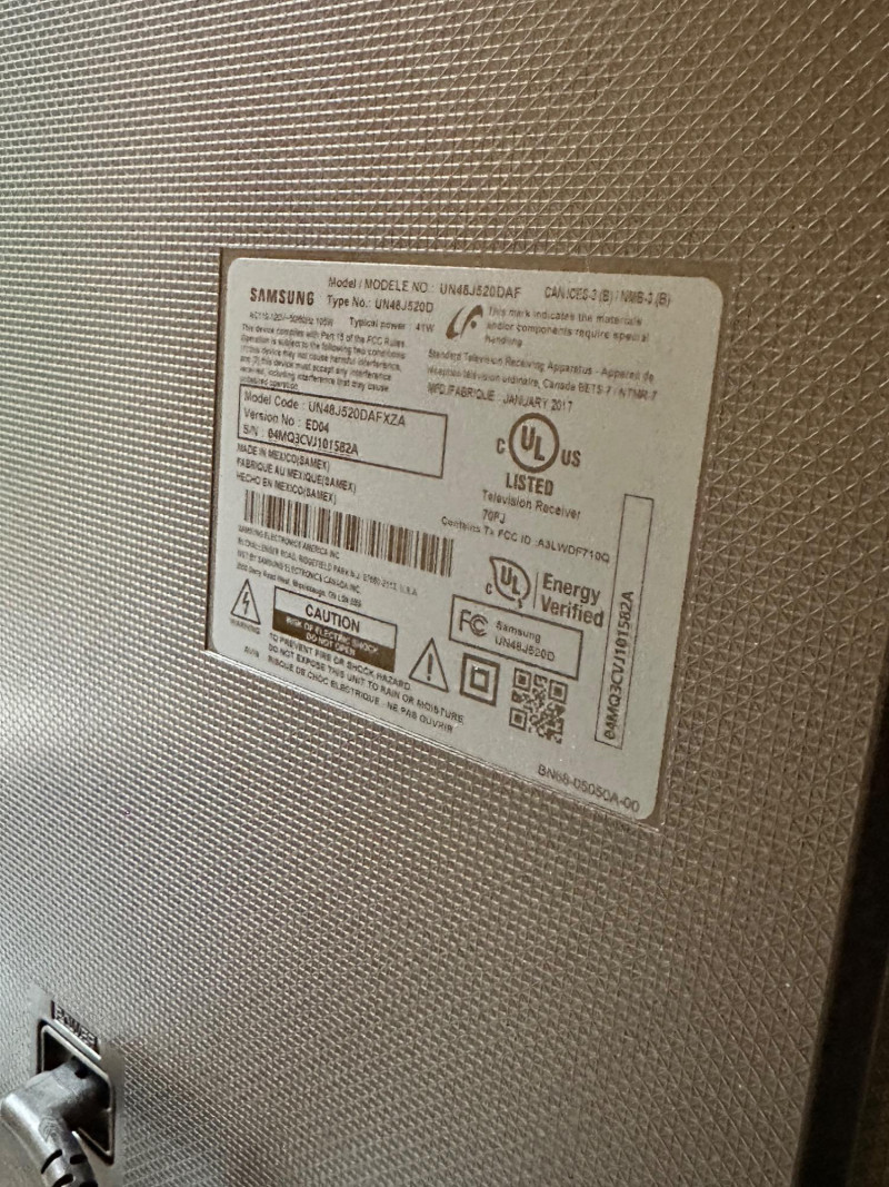 This lot features a Samsung 48-inch Smart LED Television, model UN48J520DAF, complete with its original pedestal stand and original Samsung remote control (pictured). The TV powers on properly and displays the Smart Hub interface with streaming apps such as Netflix, YouTube, Disney+, Prime Video, Pluto TV, and more visible on screen. The rear label confirms a January 2017 manufacture date, and the back panel shows a variety of input and output options for external devices. This TV is well-suited for a living room, bedroom, guest room, or secondary entertainment setup. Brand: Samsung Model: UN48J520DAF Screen Size: 48 inches Display Type: LED Smart TV: Yes (Smart Hub platform) Manufacture Date: January 2017 Typical Power Consumption: 41W Color: Black Mounting: Original Samsung pedestal stand included Inputs / Outputs: Component / AV In Digital Audio Out (Optical) Audio Out LAN (Ethernet) Original Samsung remote included Full-function remote with Smart Hub, Menu, Guide, and navigation buttons Battery compartment intact (batteries not guaranteed) TV powers on and displays menus and apps (see photos) Screen appears intact with no visible cracks Remote present and included Normal cosmetic wear consistent with regular useItem Details: