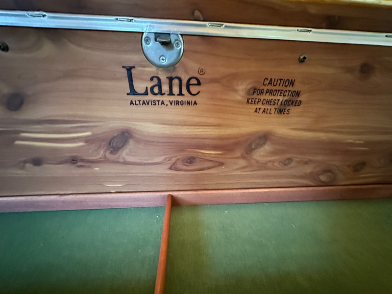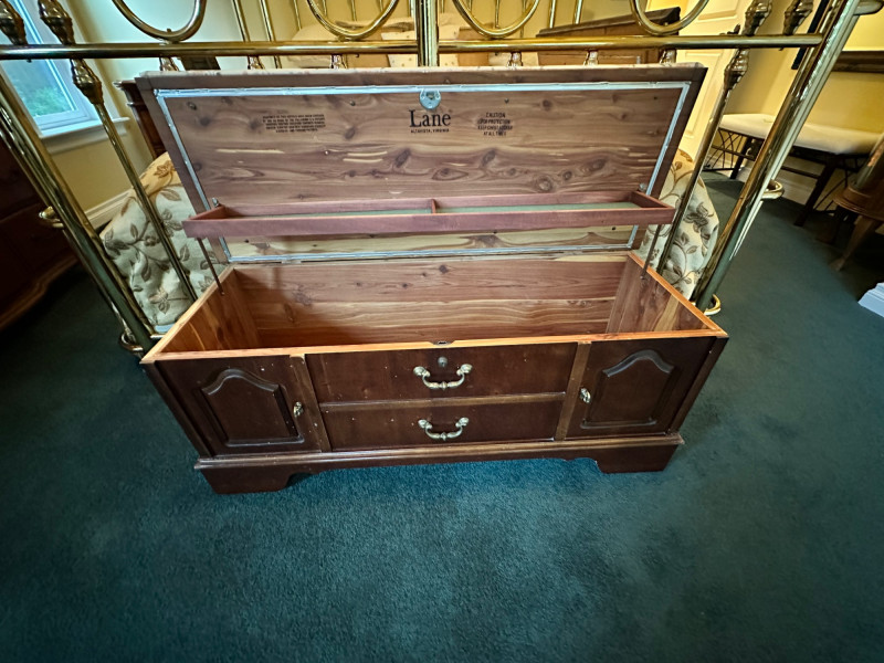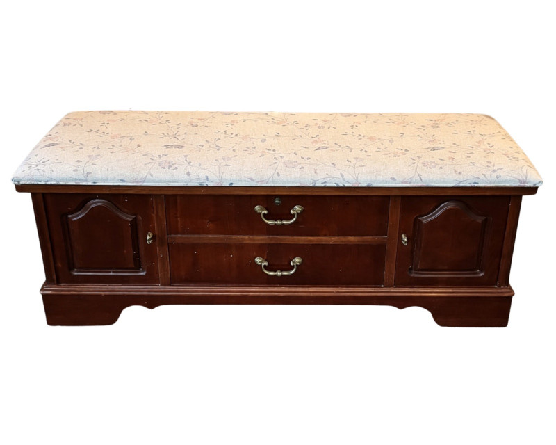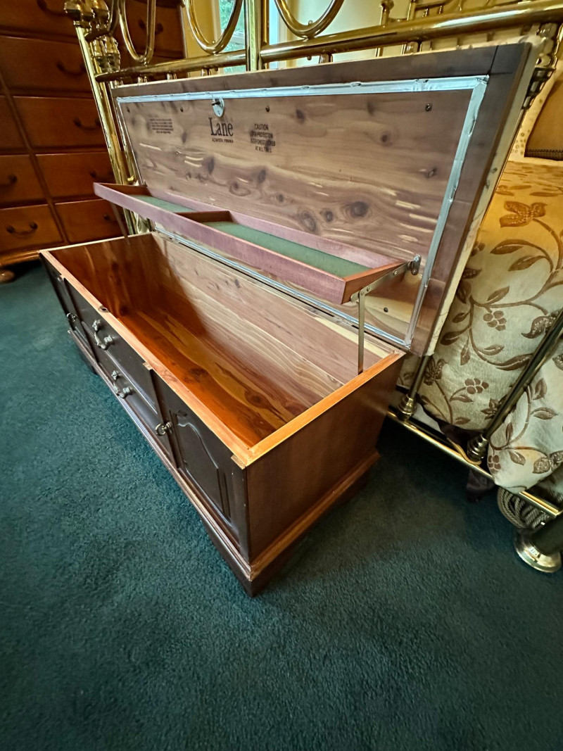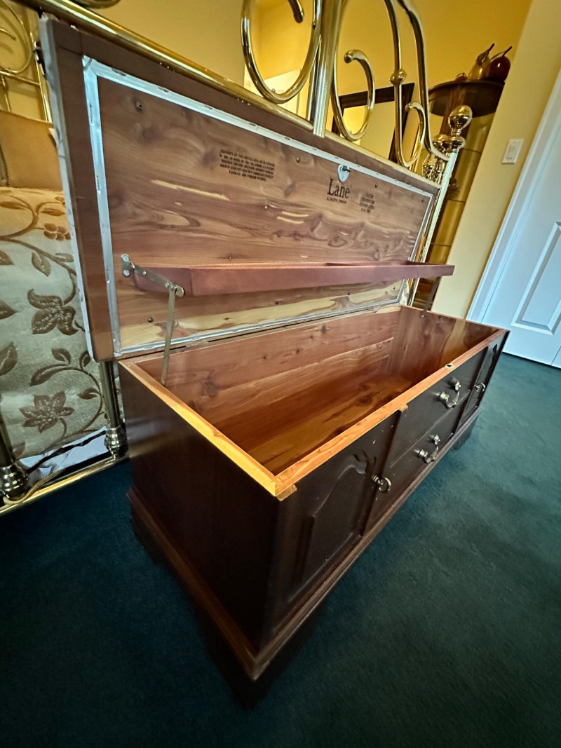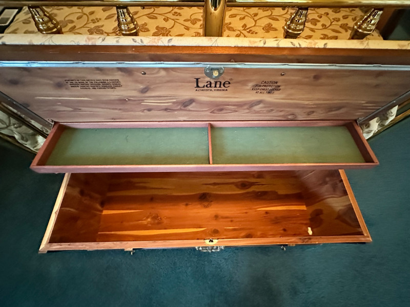 This classic Lane cedar hope chest offers both generous storage and comfortable seating. Made in Altavista, Virginia, it features a solid wood exterior with paneled ends, an aromatic cedar-lined interior, and a padded upholstered topsuitable for use as a bench at the foot of a bed, in a hallway, or in a guest room. The interior includes a removable divided tray for organizing smaller items, while the main cedar compartment is ideal for blankets, linens, or keepsakes. The original Lane safety stamp is present inside the lid, confirming authentic manufacture. Two front drawers add convenient additional storage. A timeless, functional piece that blends traditional design with everyday practicality. Maker: Lane Furniture Origin: Altavista, Virginia, USA Type: Cedar hope chest / upholstered storage bench Materials: Solid wood case, cedar-lined interior, upholstered seat Interior Features: Cedar lining; removable divided tray Exterior Features: Paneled ends; brass-tone pulls; two front drawers Safety: Original Lane safety warning stamp present Approximate Dimensions: Length: 43.5 in Width: 16 in Height: 18 inItem Details: