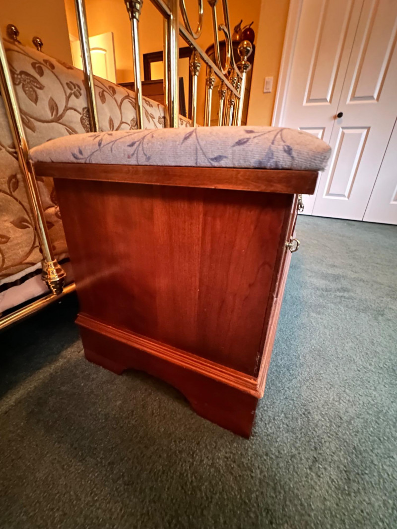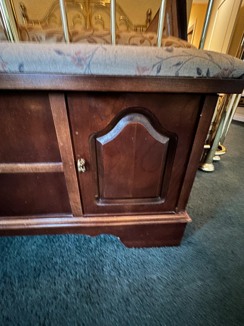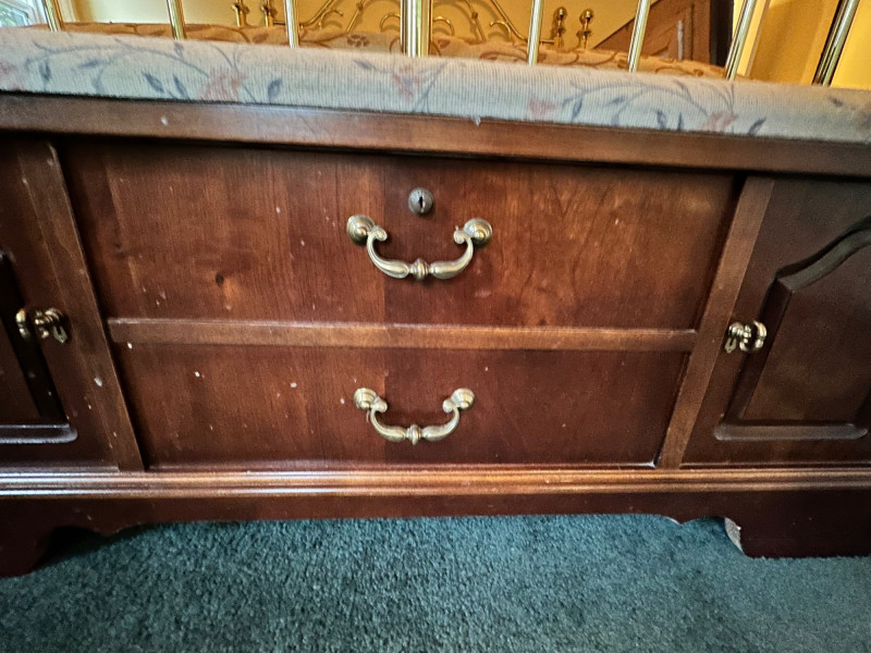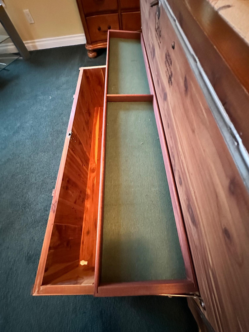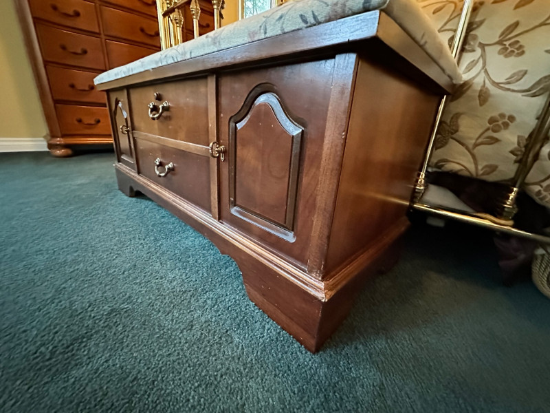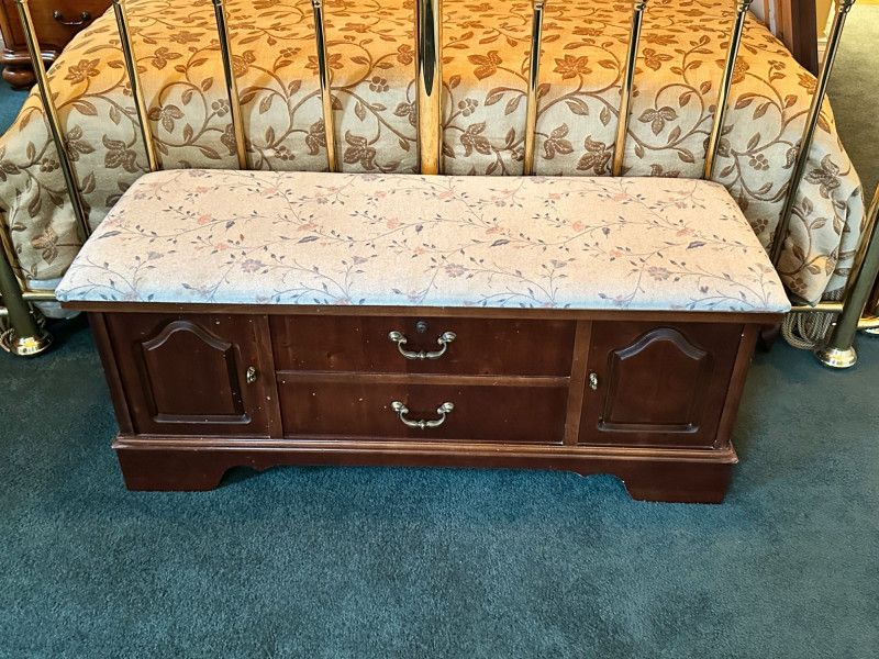 This classic Lane cedar hope chest offers both generous storage and comfortable seating. Made in Altavista, Virginia, it features a solid wood exterior with paneled ends, an aromatic cedar-lined interior, and a padded upholstered topsuitable for use as a bench at the foot of a bed, in a hallway, or in a guest room. The interior includes a removable divided tray for organizing smaller items, while the main cedar compartment is ideal for blankets, linens, or keepsakes. The original Lane safety stamp is present inside the lid, confirming authentic manufacture. Two front drawers add convenient additional storage. A timeless, functional piece that blends traditional design with everyday practicality. Maker: Lane Furniture Origin: Altavista, Virginia, USA Type: Cedar hope chest / upholstered storage bench Materials: Solid wood case, cedar-lined interior, upholstered seat Interior Features: Cedar lining; removable divided tray Exterior Features: Paneled ends; brass-tone pulls; two front drawers Safety: Original Lane safety warning stamp present Approximate Dimensions: Length: 43.5 in Width: 16 in Height: 18 inItem Details: