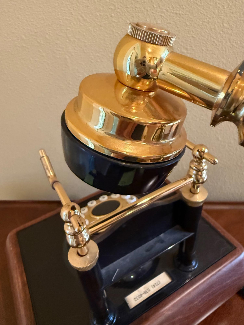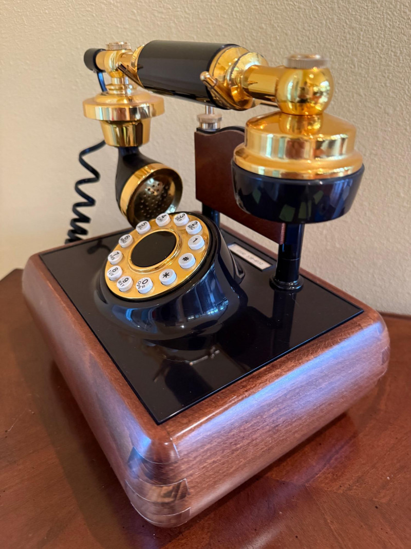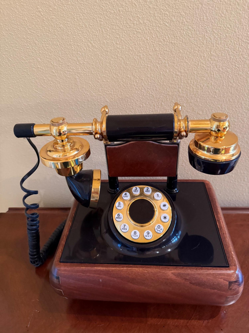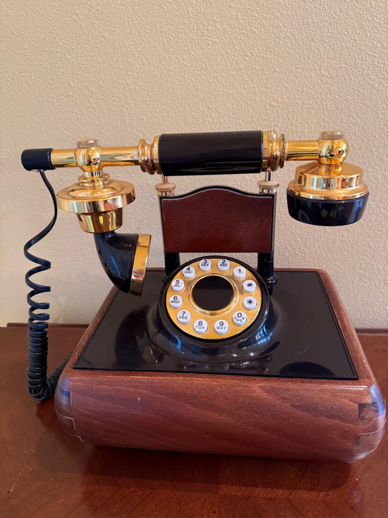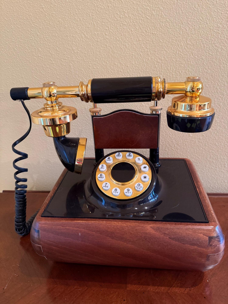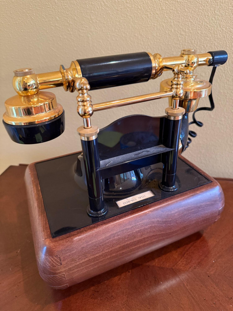 Elegant reproduction rotary telephone featuring a richly finished wooden base accented with glossy black and gold-tone detailing. The handset rests on a sculpted gold-toned cradle and is connected by a classic coiled cord. The rotary dial displays traditional alphanumeric markings, enhancing its authentic early-to-mid 20th century aesthetic. A refined decorative accent that adds timeless charm to an office, library, or interior display. Type: Rotary dial telephone (decorative vintage-style reproduction) Design: Classic early desk telephone form Materials: Wooden base, black composite body, gold-tone metal hardware Color: Black, gold-tone, and warm wood finish Features: Rotary dial with alphanumeric markings, traditional handset, gold-toned cradle, coiled cord Use: Ideal for décor, display, or themed interior settings Height: 9.5" Length: 10.25" Width: 6.75"Item Details:
