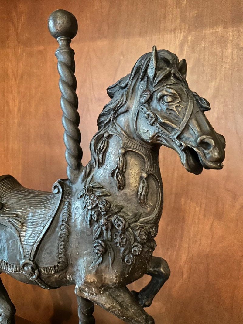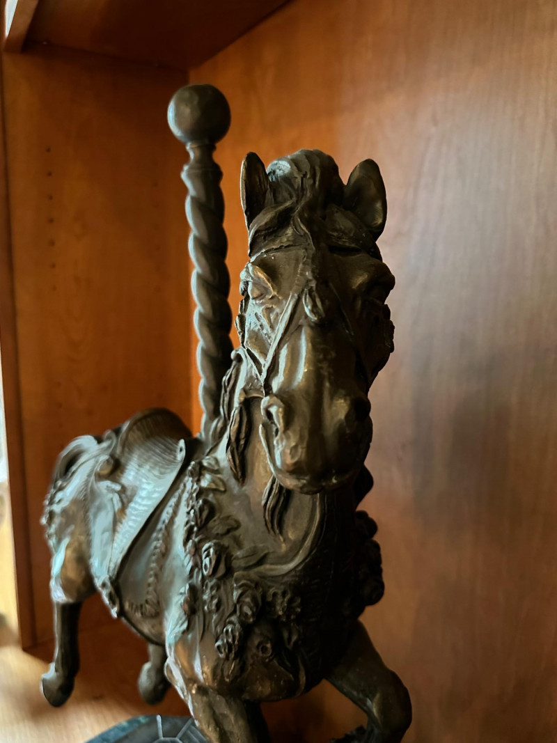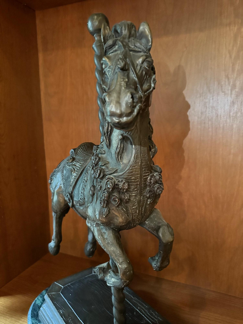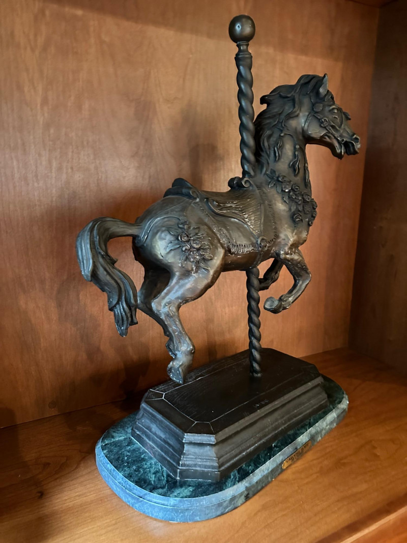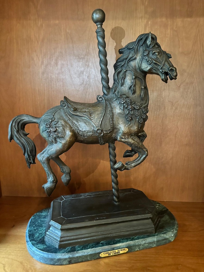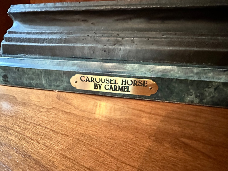 Substantial and finely detailed bronze carousel horse sculpture by Carmel, depicting a rearing horse mounted on a twisted carousel pole. The figure is richly modeled with ornate floral embellishments, a sculpted saddle, expressive facial features, and a flowing mane and tail, all enhanced by a deep bronze patina. The sculpture is mounted on a tiered pedestal set atop a polished green marble oval base, providing both visual elegance and exceptional stability. An original brass plaque affixed to the base reads “Carousel Horse by Carmel,” confirming the artist attribution. This piece is very heavy and solid, making it an impressive statement sculpture for display in a home, office, or curated collection. Title: Carousel Horse Artist: Carmel Material: Bronze sculpture Finish: Dark bronze patina Base: Tiered pedestal on polished green marble base Plaque: Original brass plaque reading “Carousel Horse by Carmel” Form: Rearing carousel horse with twisted pole Weight: Very heavy (substantial, solid construction)Item Details: