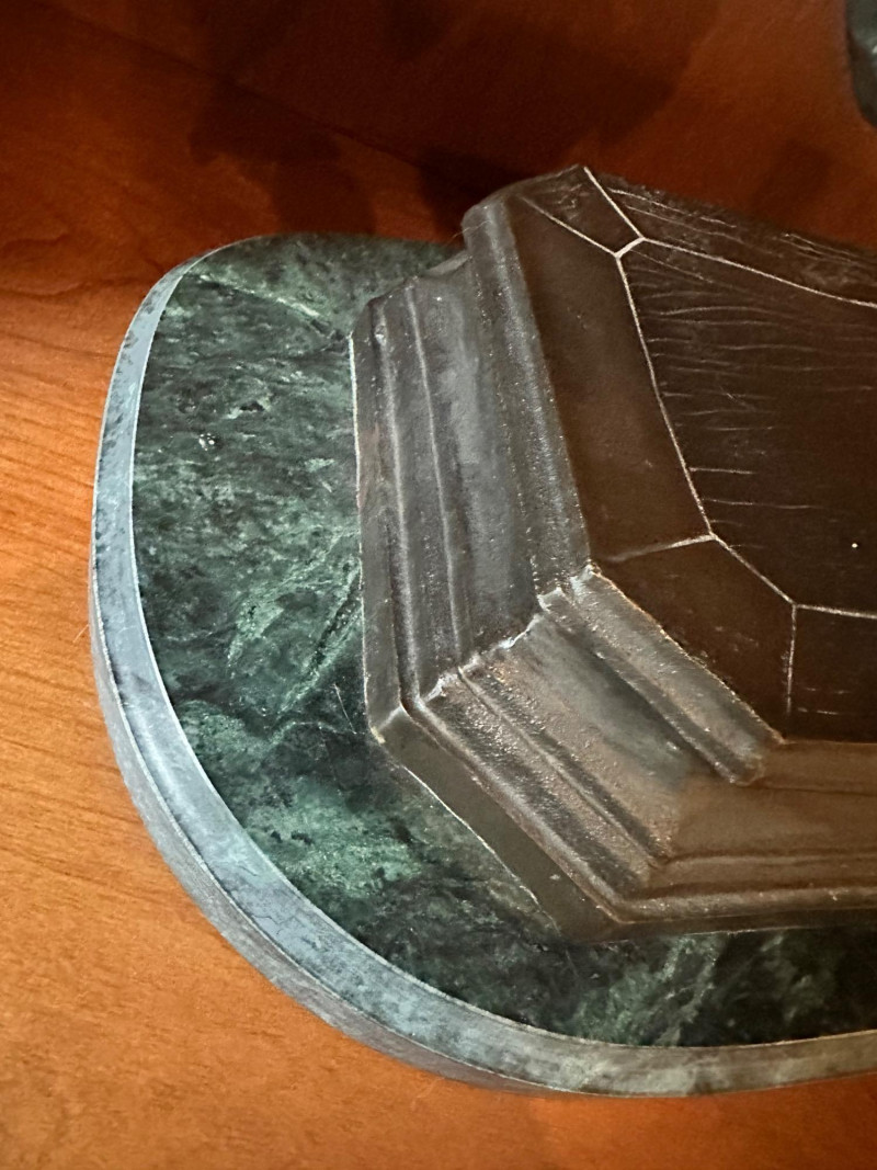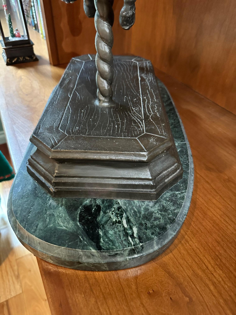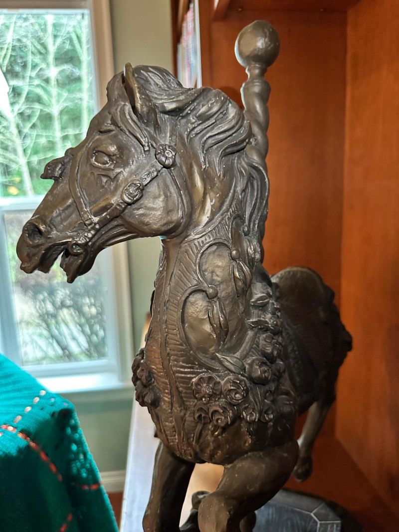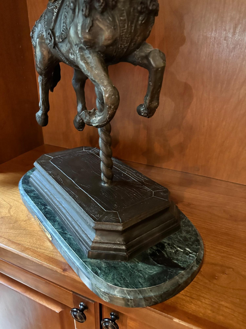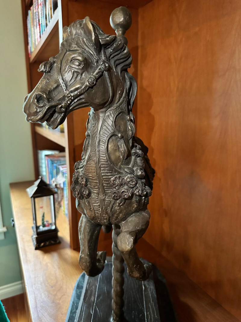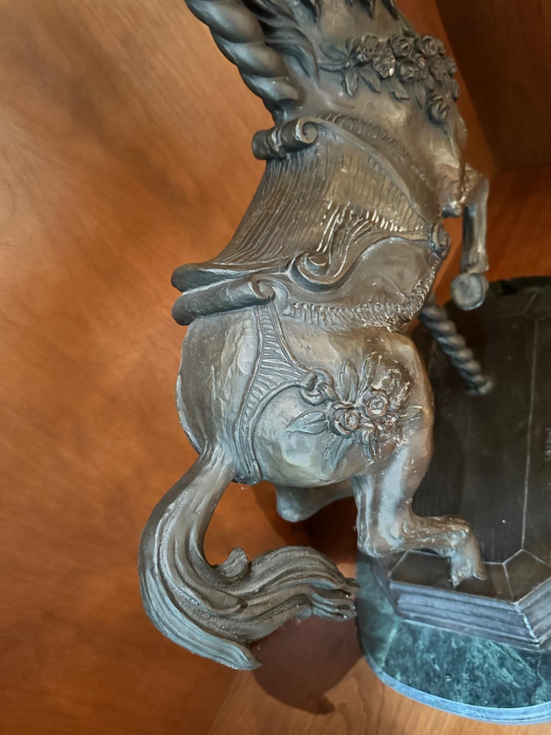 Substantial and finely detailed bronze carousel horse sculpture by Carmel, depicting a rearing horse mounted on a twisted carousel pole. The figure is richly modeled with ornate floral embellishments, a sculpted saddle, expressive facial features, and a flowing mane and tail, all enhanced by a deep bronze patina. The sculpture is mounted on a tiered pedestal set atop a polished green marble oval base, providing both visual elegance and exceptional stability. An original brass plaque affixed to the base reads “Carousel Horse by Carmel,” confirming the artist attribution. This piece is very heavy and solid, making it an impressive statement sculpture for display in a home, office, or curated collection. Title: Carousel Horse Artist: Carmel Material: Bronze sculpture Finish: Dark bronze patina Base: Tiered pedestal on polished green marble base Plaque: Original brass plaque reading “Carousel Horse by Carmel” Form: Rearing carousel horse with twisted pole Weight: Very heavy (substantial, solid construction)Item Details: