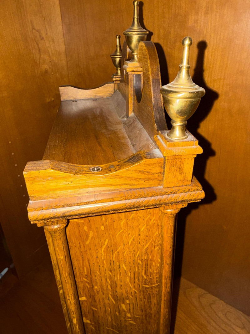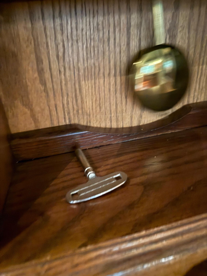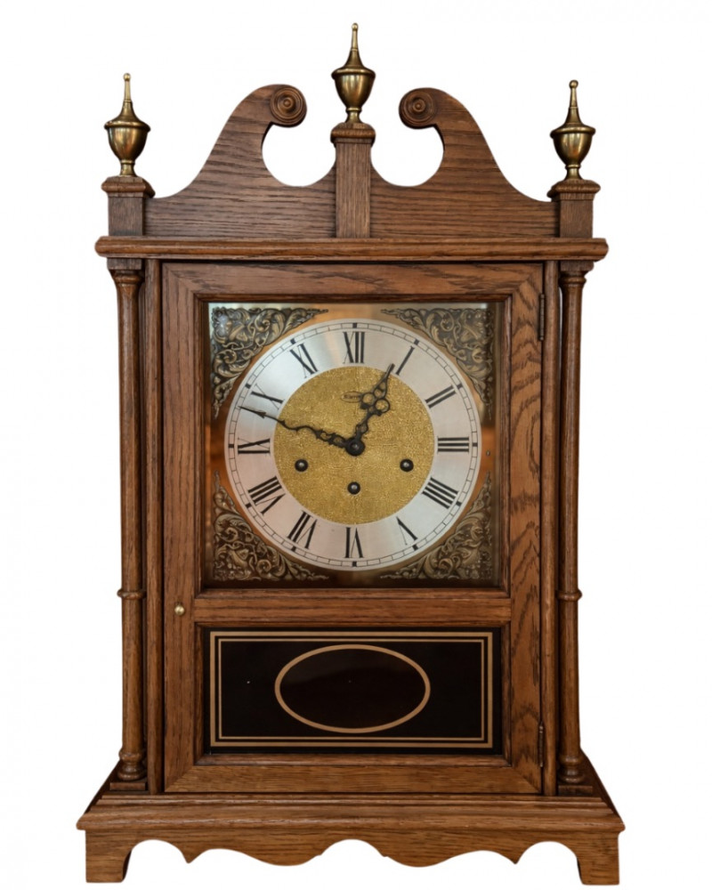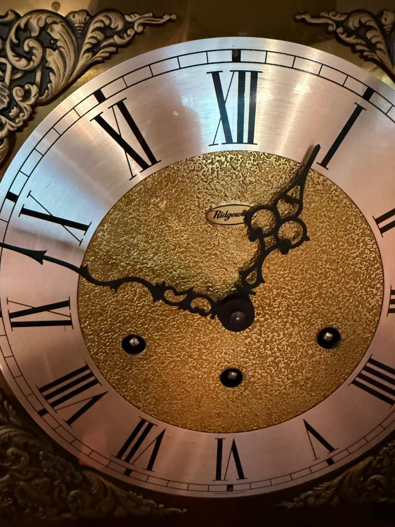 Classic and stately, this vintage mantel clock by Ridgeway features a traditional oak case with a warm, medium-brown finish and elegant architectural details. The silvered chapter ring with Roman numerals frames a textured gilt center, complemented by ornate black hands. Inside, a key-wound mechanical movement drives the pendulum and chime rods, offering both visual appeal and traditional timekeeping charm. Decorative brass finials crown the top, while a glazed lower panel allows a view of the swinging pendulum—an inviting focal point for a mantel, shelf, or sideboard. Maker: Ridgeway Type: Mantel clock Movement: Mechanical, key-wound Chime: Rod chime with pendulum Dial: Roman numerals; textured gilt center with silvered ring Case: Oak wood with decorative finials Finish: Warm oak tone Features: Glass door; visible pendulum; classic carved profileItem Details: