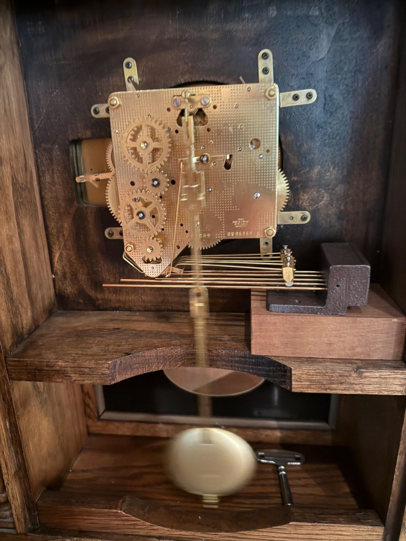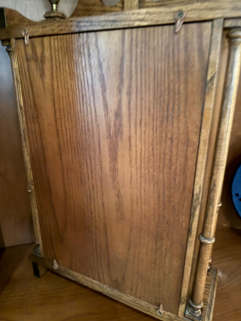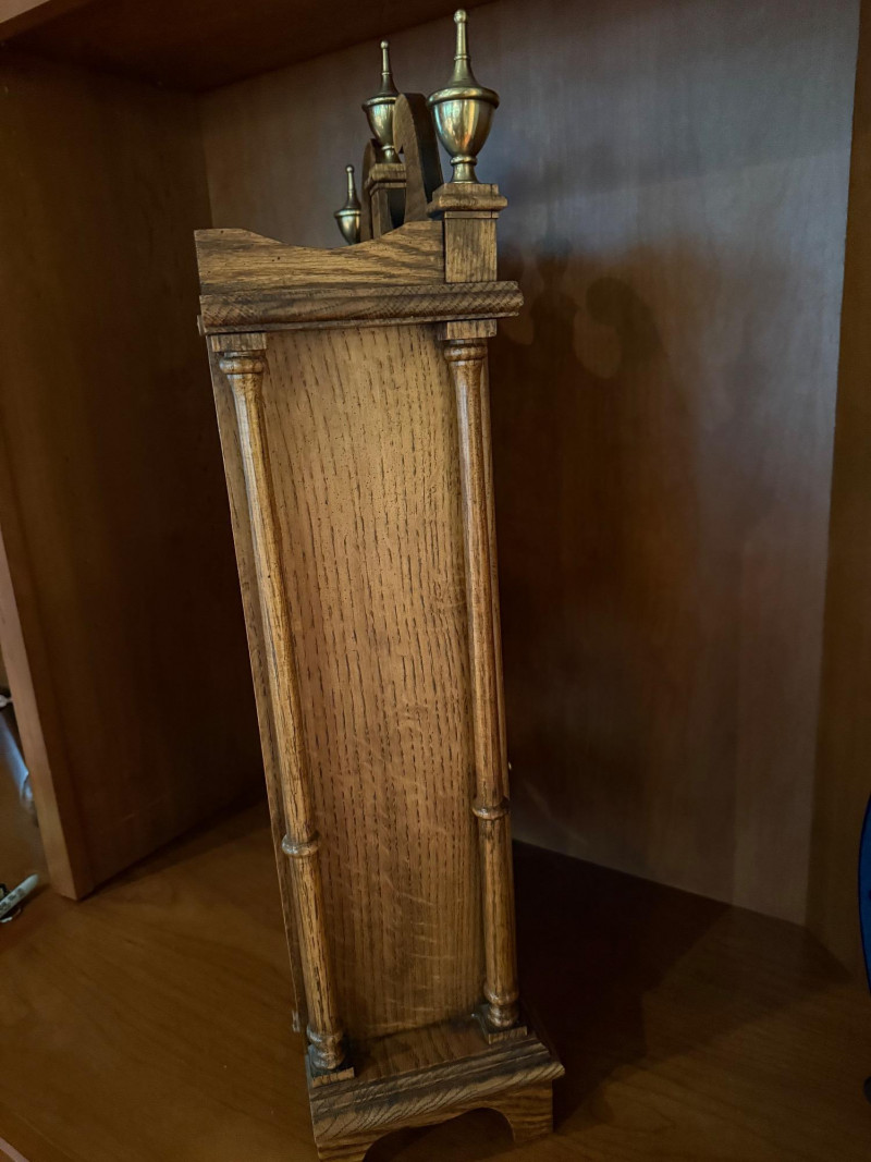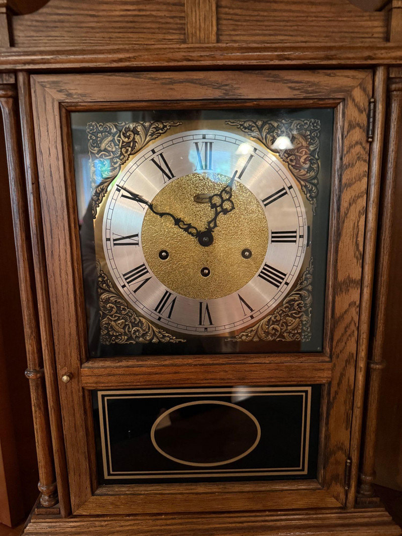 Classic and stately, this vintage mantel clock by Ridgeway features a traditional oak case with a warm, medium-brown finish and elegant architectural details. The silvered chapter ring with Roman numerals frames a textured gilt center, complemented by ornate black hands. Inside, a key-wound mechanical movement drives the pendulum and chime rods, offering both visual appeal and traditional timekeeping charm. Decorative brass finials crown the top, while a glazed lower panel allows a view of the swinging pendulum—an inviting focal point for a mantel, shelf, or sideboard. Maker: Ridgeway Type: Mantel clock Movement: Mechanical, key-wound Chime: Rod chime with pendulum Dial: Roman numerals; textured gilt center with silvered ring Case: Oak wood with decorative finials Finish: Warm oak tone Features: Glass door; visible pendulum; classic carved profileItem Details: