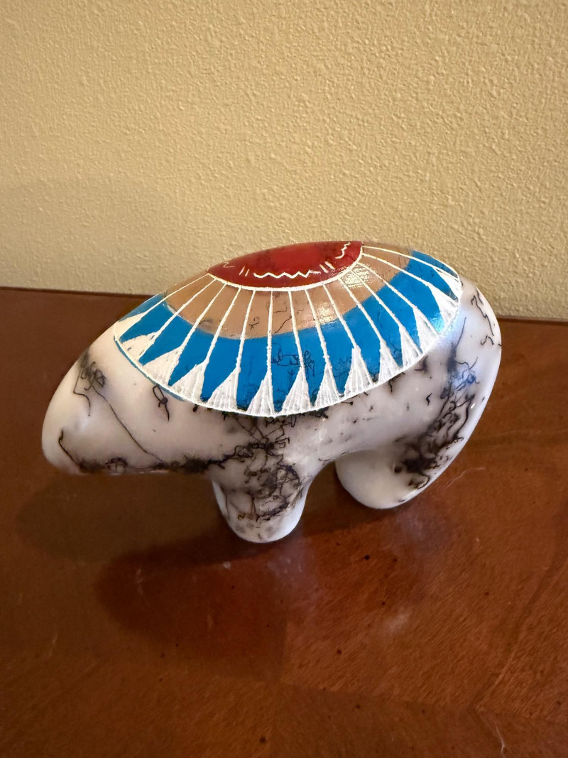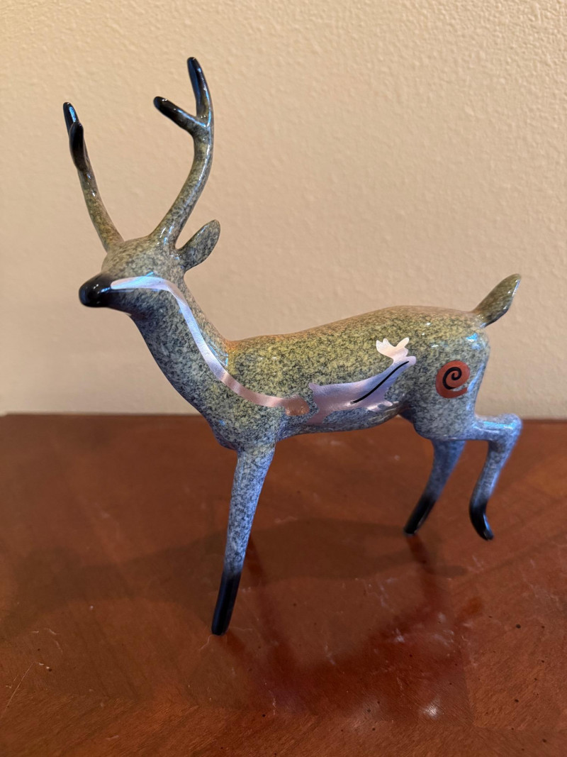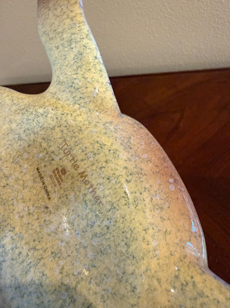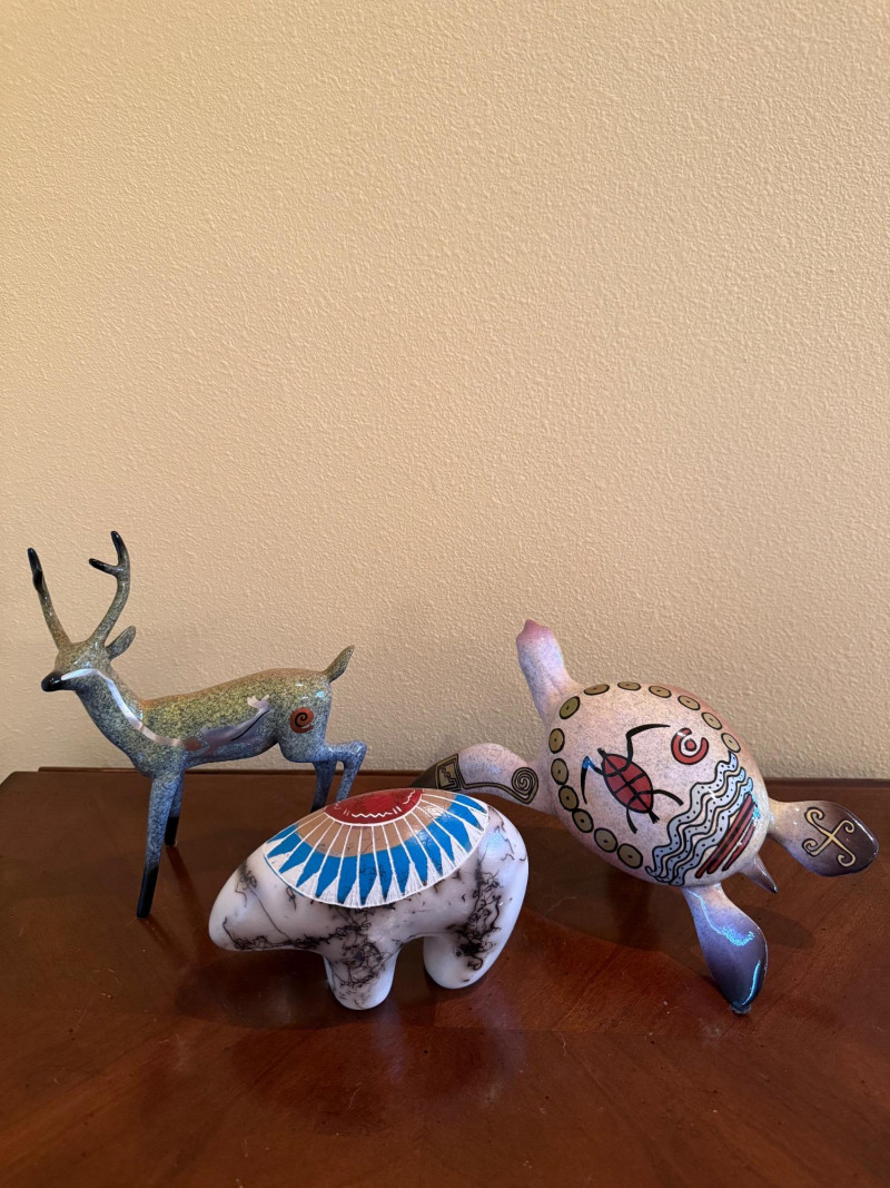A sculptural trio of decorative stone animal figures featuring a Primal Visions “Life Cycle” deer, a Primal Visions turtle mother, and an unmarked polar bear. Together, these pieces reflect the symbolic storytelling and Native-inspired design language associated with Primal Visions, combining speckled stone finishes, hand-painted motifs, and stylized animal forms. The grouping presents a cohesive display celebrating themes of nature, continuity, and strength. Series / Model: Life Cycle Date: Circa 2000s (©2008) Dimensions: Approx. 7.5" H × 6" W Mark: Primal Visions (gold mark, Made in China) Color / Finish: Speckled gray-green stone with hand-painted symbolic accents Design: Stylized buck form representing renewal and the passage of time Date: Circa 2000s Dimensions: Approx. 4.5" H × 8" W Mark: Primal Visions (gold mark, Made in China) Color / Finish: Light stone tone with hand-painted geometric and symbolic shell motifs Design: Turtle mother form symbolizing protection, wisdom, and continuity Date: Unknown Dimensions: Approx. 4" H × 6" W Mark: None observed Color / Finish: White stone with marbled gray veining Design: Simplified polar bear form with smooth carved featuresItem Details: