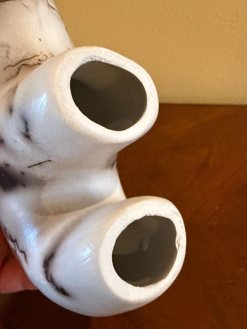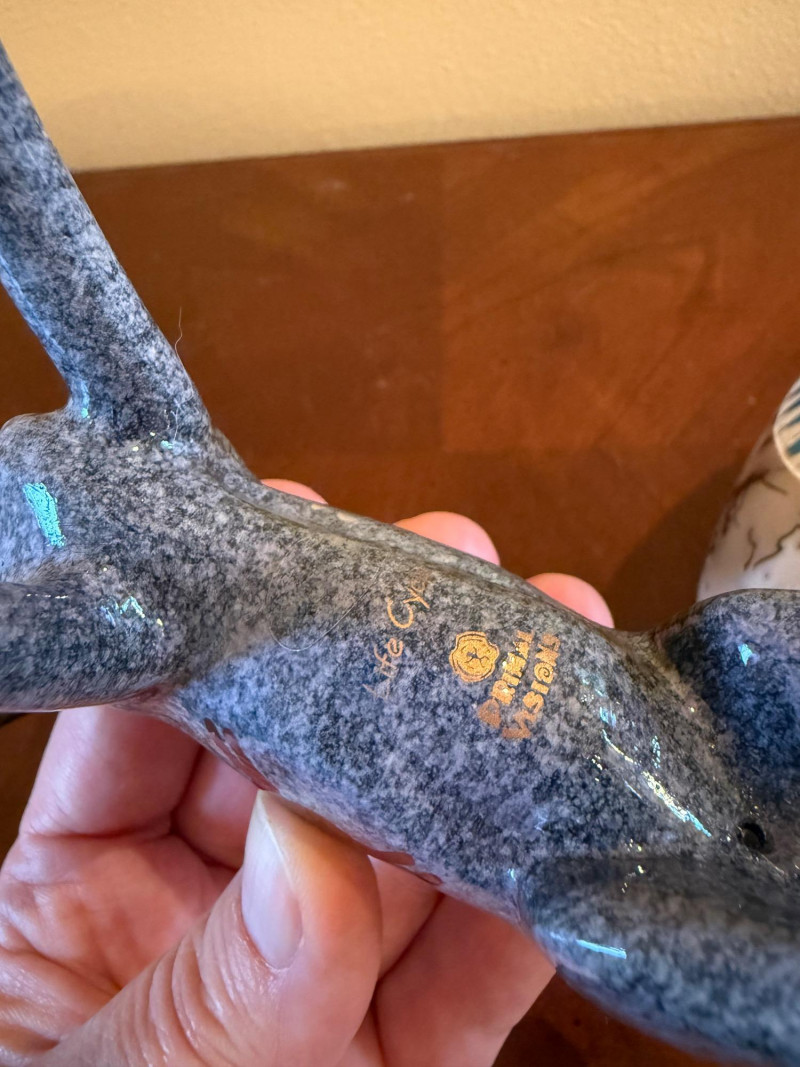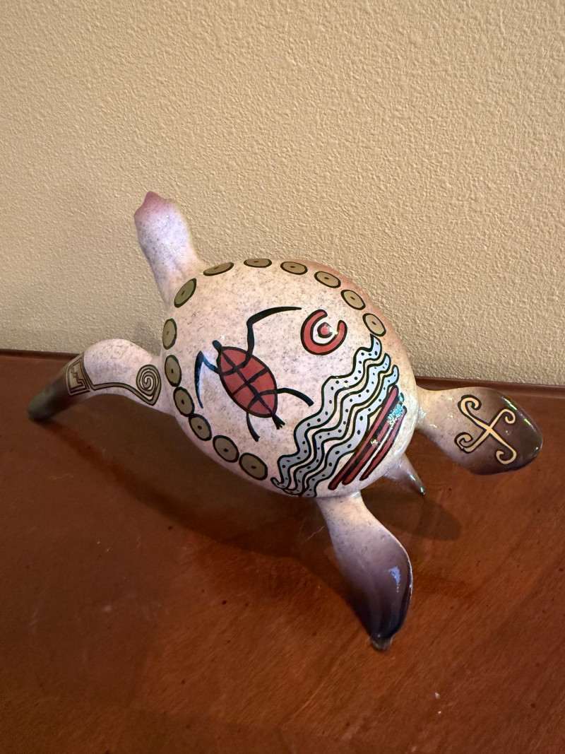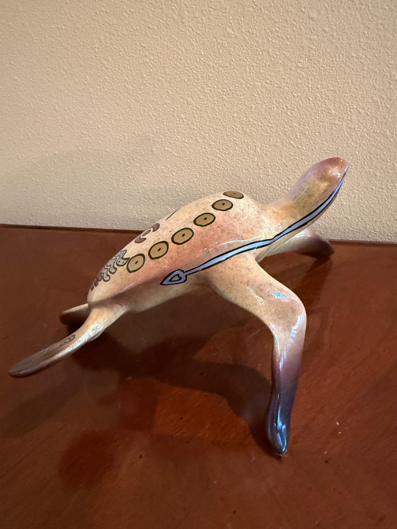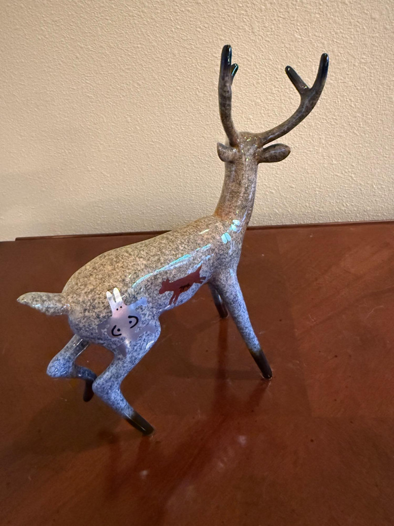 A sculptural trio of decorative stone animal figures featuring a Primal Visions “Life Cycle” deer, a Primal Visions turtle mother, and an unmarked polar bear. Together, these pieces reflect the symbolic storytelling and Native-inspired design language associated with Primal Visions, combining speckled stone finishes, hand-painted motifs, and stylized animal forms. The grouping presents a cohesive display celebrating themes of nature, continuity, and strength. Series / Model: Life Cycle Date: Circa 2000s (©2008) Dimensions: Approx. 7.5" H × 6" W Mark: Primal Visions (gold mark, Made in China) Color / Finish: Speckled gray-green stone with hand-painted symbolic accents Design: Stylized buck form representing renewal and the passage of time Date: Circa 2000s Dimensions: Approx. 4.5" H × 8" W Mark: Primal Visions (gold mark, Made in China) Color / Finish: Light stone tone with hand-painted geometric and symbolic shell motifs Design: Turtle mother form symbolizing protection, wisdom, and continuity Date: Unknown Dimensions: Approx. 4" H × 6" W Mark: None observed Color / Finish: White stone with marbled gray veining Design: Simplified polar bear form with smooth carved featuresItem Details: