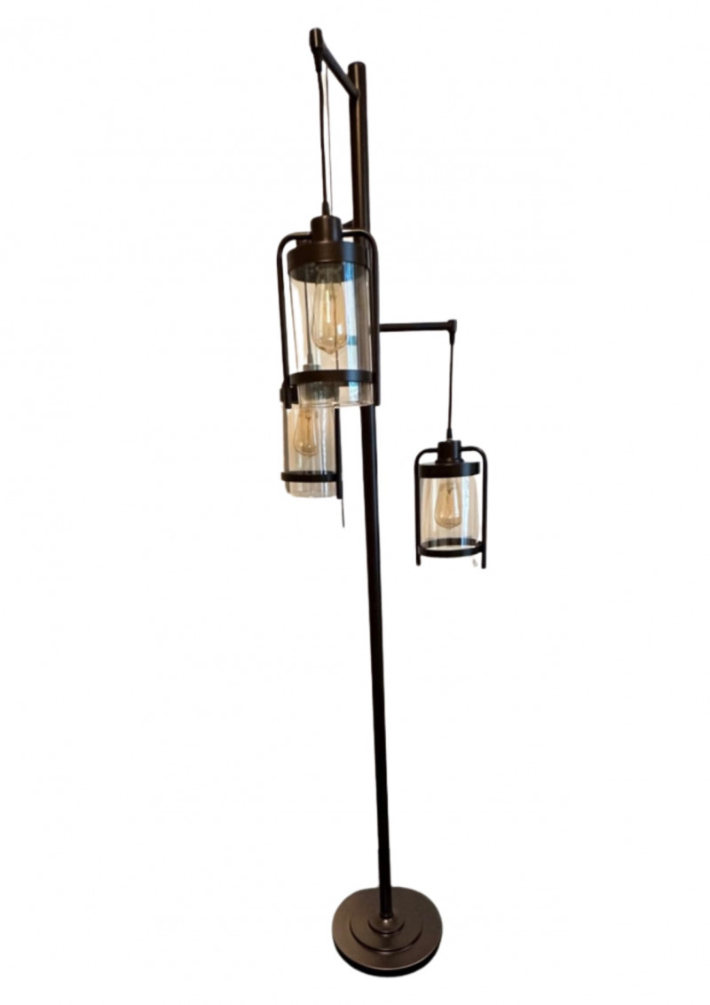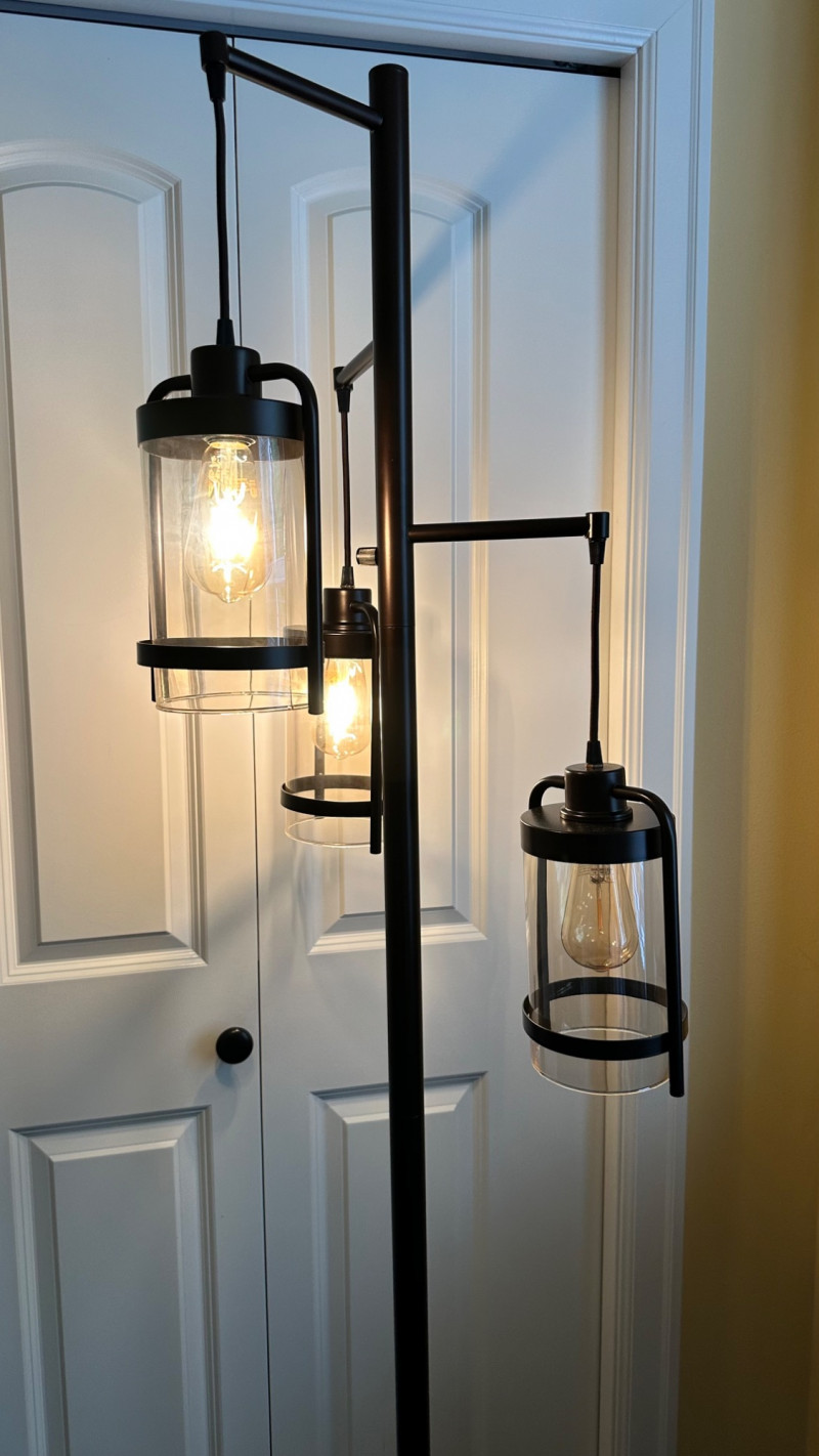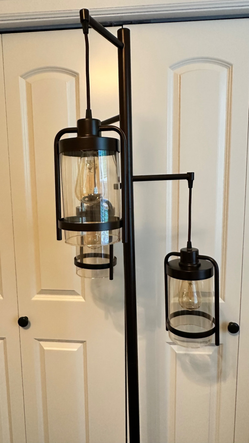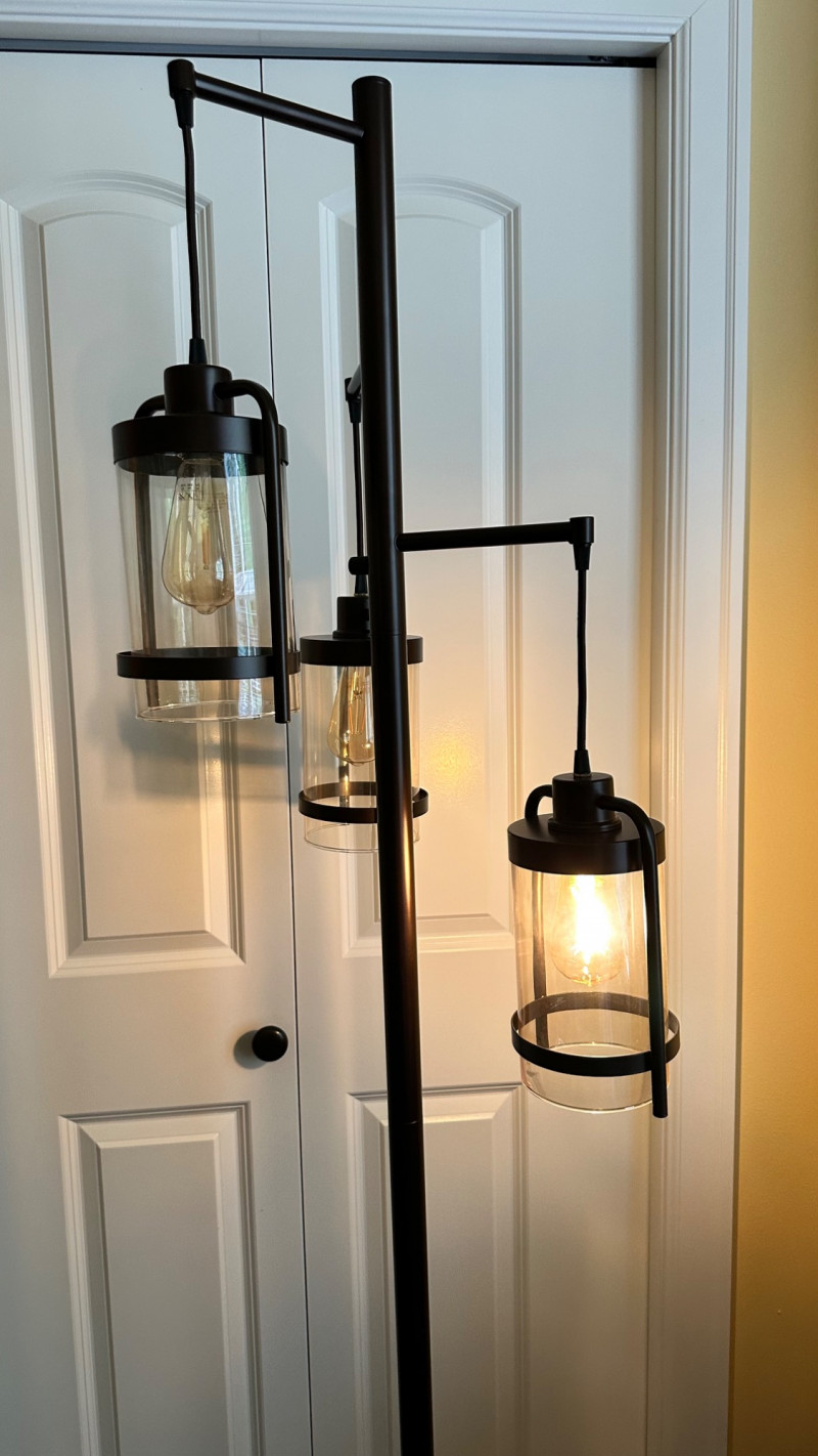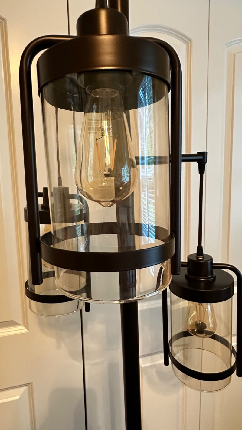 Striking and modern, this three-light tree floor lamp features a clean vertical profile with staggered arms supporting matching glass lantern shades. The dark metal frame pairs beautifully with the clear cylindrical glass, creating an industrial-inspired look that works well in living rooms, reading corners, or bedrooms. Each light hangs at a different height, providing layered illumination and strong visual interest. The lamp is shown working with warm Edison-style bulbs (included as shown), offering both functional lighting and ambient glow. A round weighted base provides stability, while the tall, slim design allows it to fit easily into tighter spaces. Type: Tree floor lamp / multi-light floor lamp Lights: Three (3) individual hanging lantern-style lights Style: Industrial / Modern / Contemporary Materials: Metal frame with clear glass shades Color: Dark bronze / oil-rubbed bronze tone Shade Design: Clear cylindrical glass lanterns with metal framing Bulbs: Edison-style bulbs shown (working at time of photos) Power: Plug-in floor lamp Overall Height: ~72" Base Diameter: ~10–11" Shade Height: ~10–11" eachItem Details: