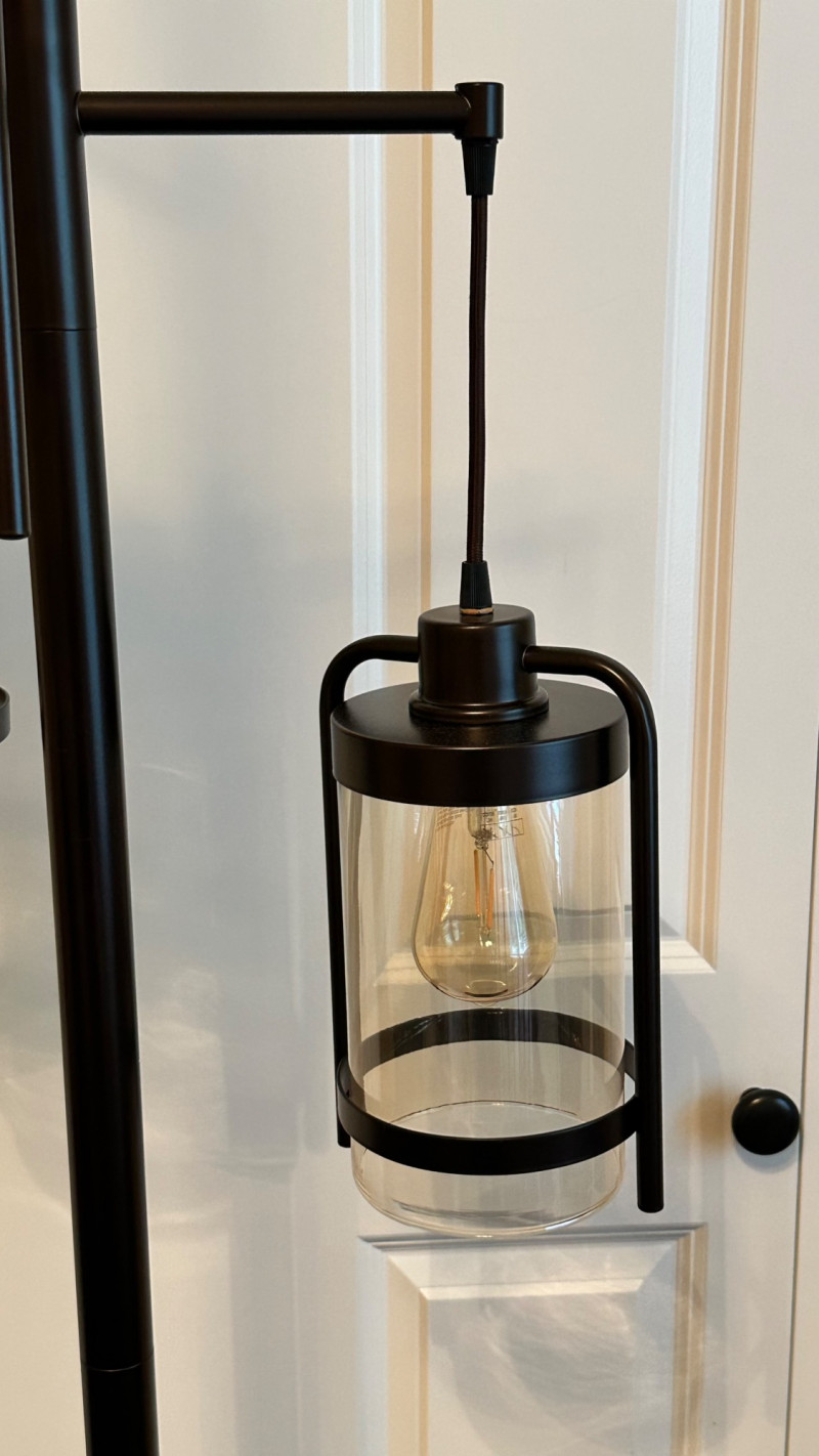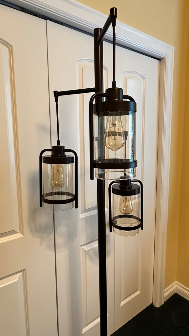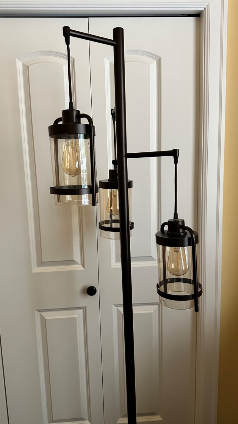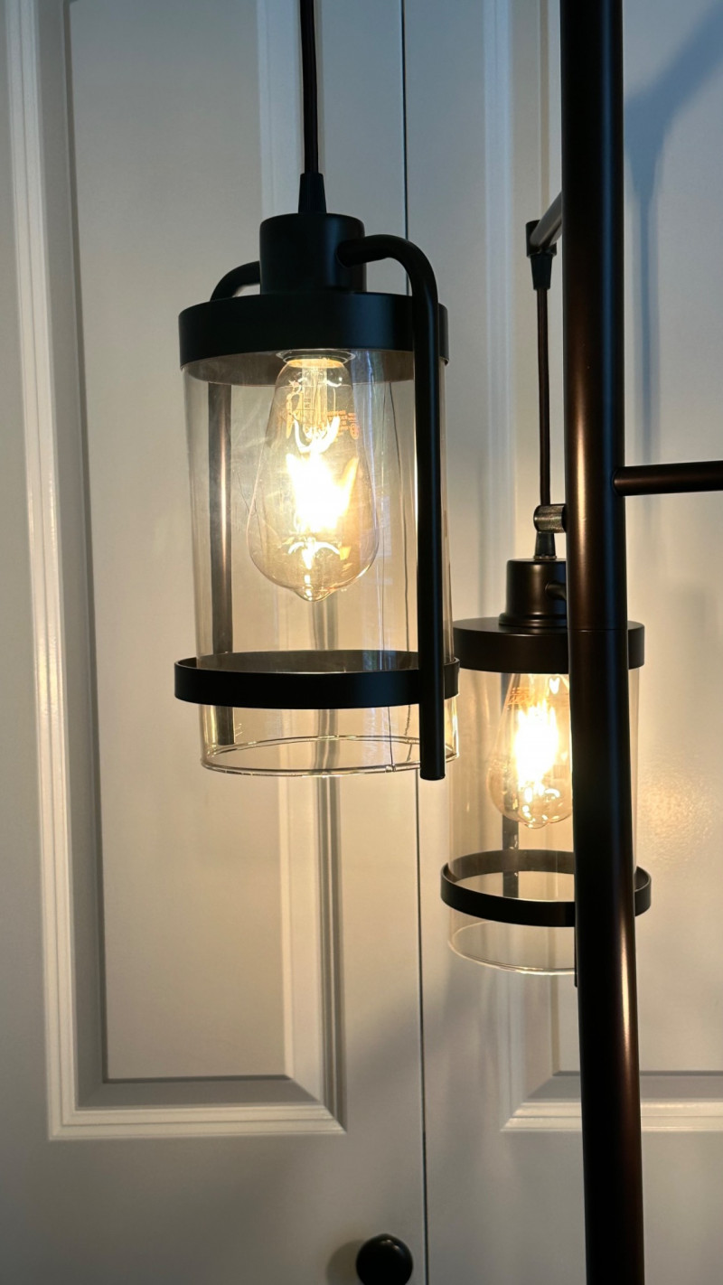Striking and modern, this three-light tree floor lamp features a clean vertical profile with staggered arms supporting matching glass lantern shades. The dark metal frame pairs beautifully with the clear cylindrical glass, creating an industrial-inspired look that works well in living rooms, reading corners, or bedrooms. Each light hangs at a different height, providing layered illumination and strong visual interest. The lamp is shown working with warm Edison-style bulbs (included as shown), offering both functional lighting and ambient glow. A round weighted base provides stability, while the tall, slim design allows it to fit easily into tighter spaces. Type: Tree floor lamp / multi-light floor lamp Lights: Three (3) individual hanging lantern-style lights Style: Industrial / Modern / Contemporary Materials: Metal frame with clear glass shades Color: Dark bronze / oil-rubbed bronze tone Shade Design: Clear cylindrical glass lanterns with metal framing Bulbs: Edison-style bulbs shown (working at time of photos) Power: Plug-in floor lamp Overall Height: ~72" Base Diameter: ~10–11" Shade Height: ~10–11" eachItem Details: