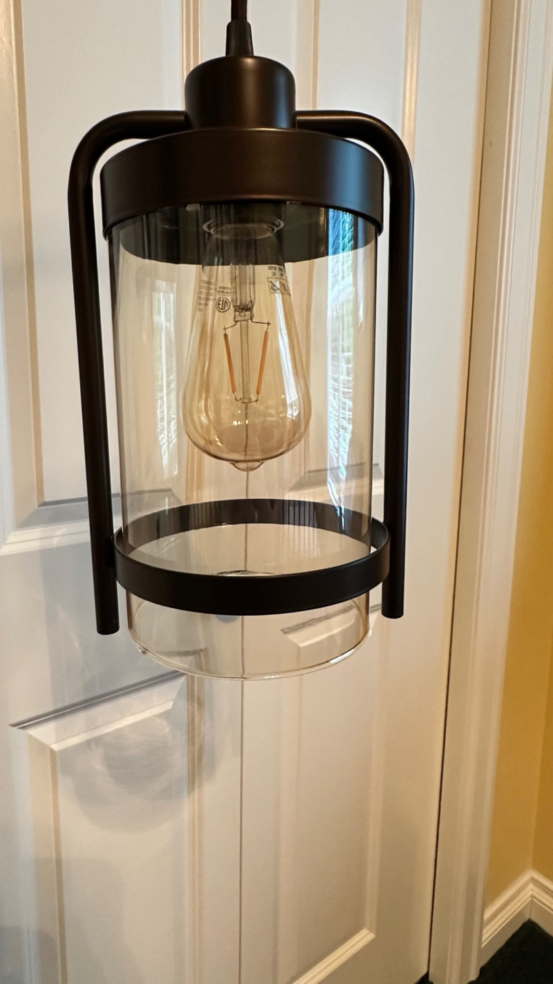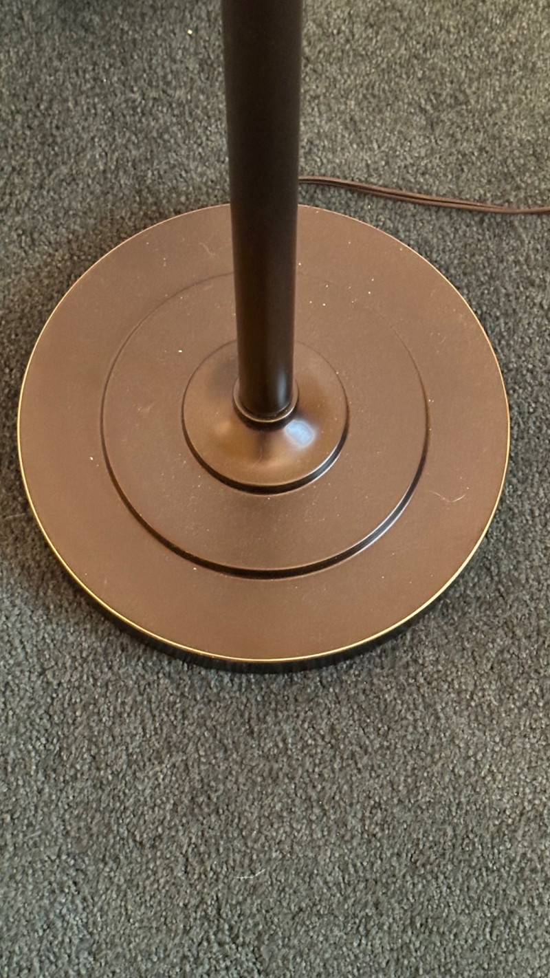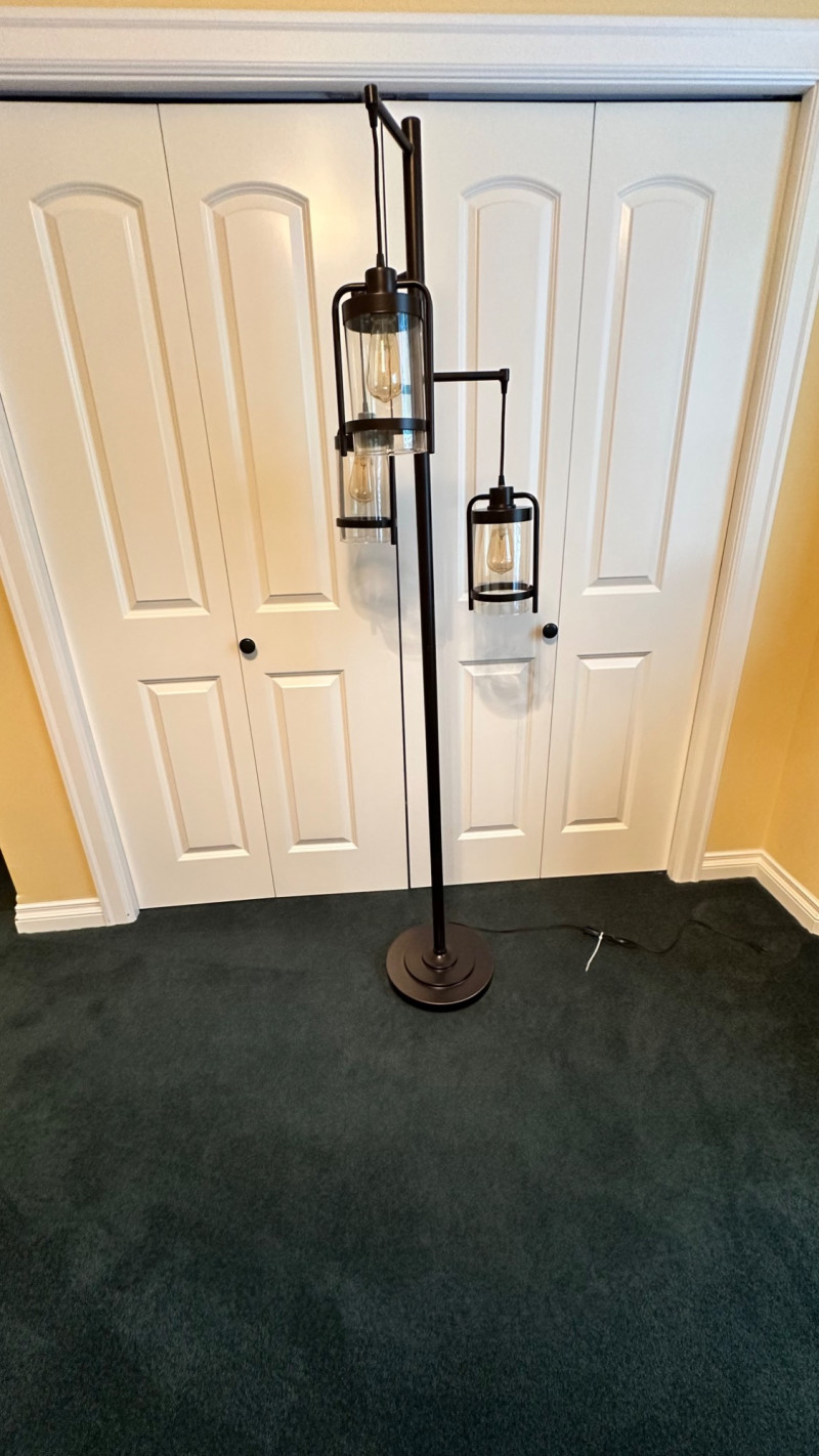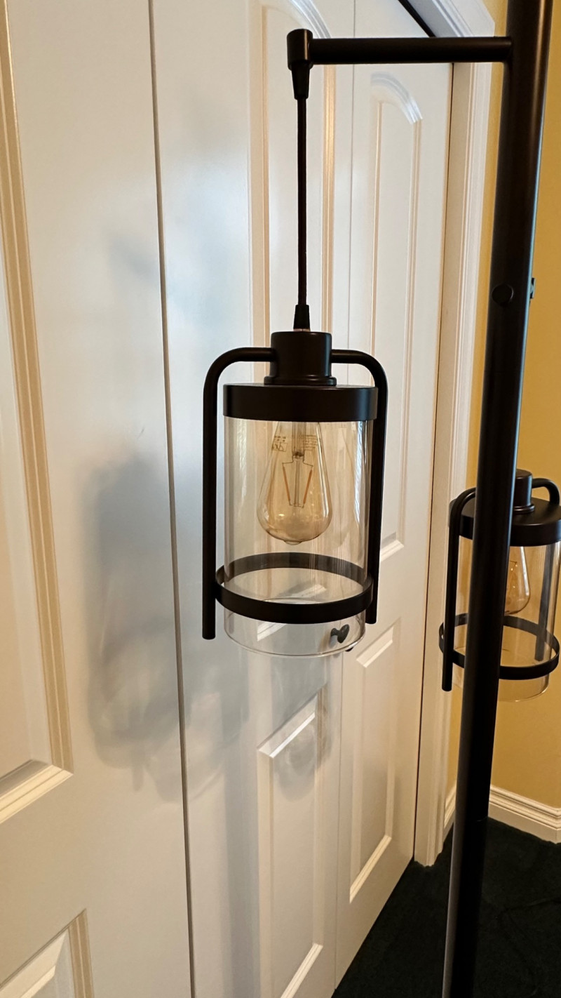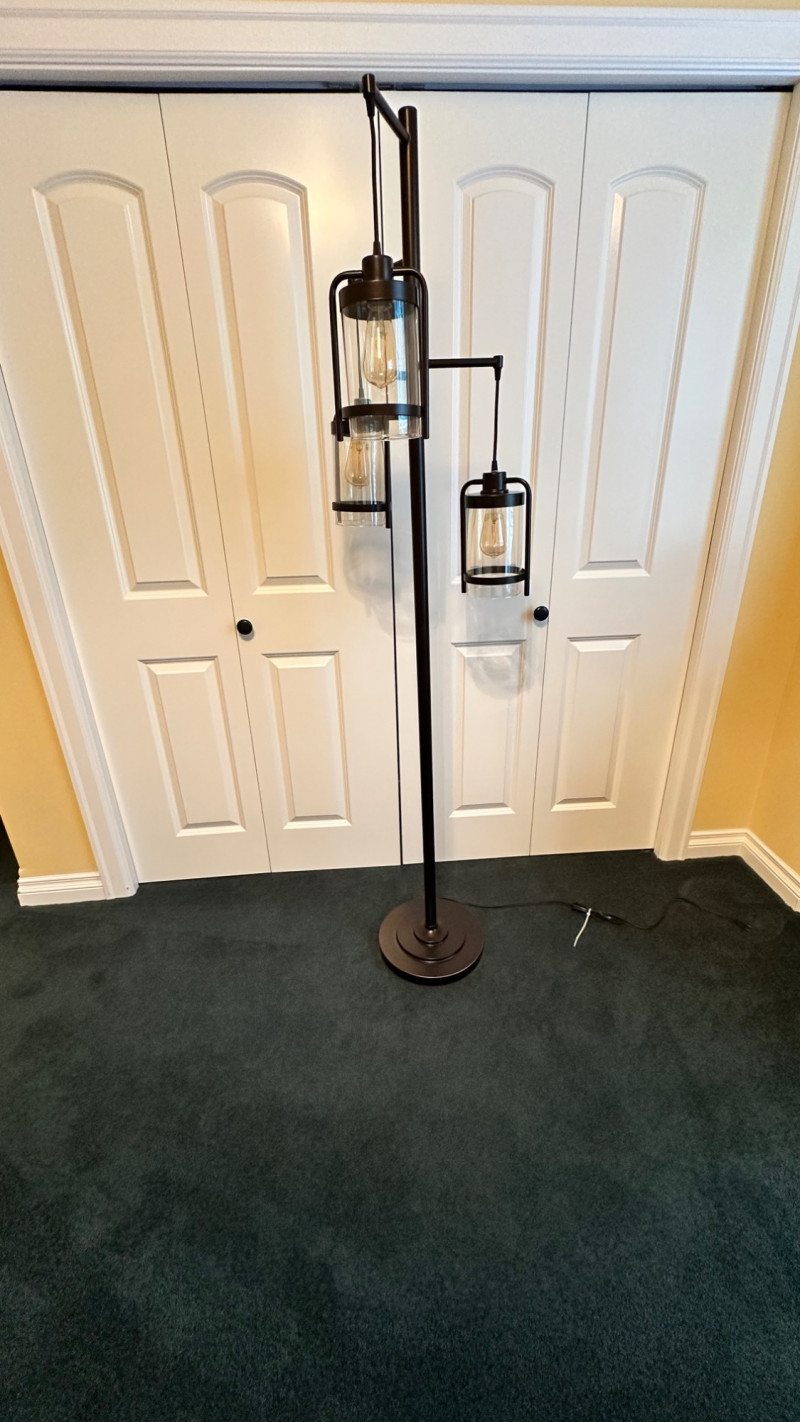 Striking and modern, this three-light tree floor lamp features a clean vertical profile with staggered arms supporting matching glass lantern shades. The dark metal frame pairs beautifully with the clear cylindrical glass, creating an industrial-inspired look that works well in living rooms, reading corners, or bedrooms. Each light hangs at a different height, providing layered illumination and strong visual interest. The lamp is shown working with warm Edison-style bulbs (included as shown), offering both functional lighting and ambient glow. A round weighted base provides stability, while the tall, slim design allows it to fit easily into tighter spaces. Type: Tree floor lamp / multi-light floor lamp Lights: Three (3) individual hanging lantern-style lights Style: Industrial / Modern / Contemporary Materials: Metal frame with clear glass shades Color: Dark bronze / oil-rubbed bronze tone Shade Design: Clear cylindrical glass lanterns with metal framing Bulbs: Edison-style bulbs shown (working at time of photos) Power: Plug-in floor lamp Overall Height: ~72" Base Diameter: ~10–11" Shade Height: ~10–11" eachItem Details: