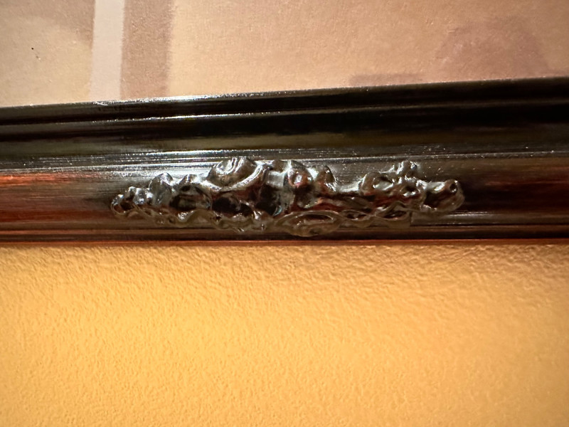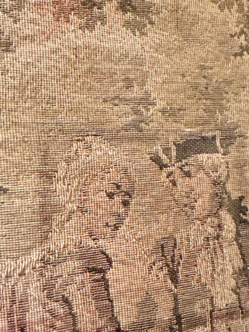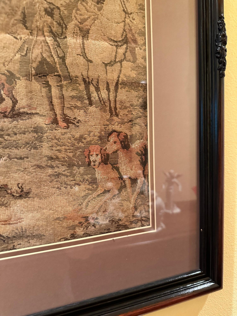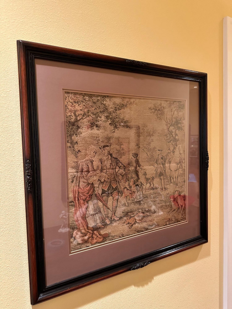 Decorative framed tapestry textile artwork depicting a traditional colonial-era hunting scene. The woven tapestry shows finely detailed figures in period attire accompanied by hounds within a wooded landscape, rendered in soft, muted earth tones typical of classic European-inspired tapestries. The piece is attractively presented in a dark, ornate wood frame with carved accents and double matting in complementary neutral tones, making it well-suited for traditional, rustic, or Old World–style interiors. A handwritten label on the reverse identifies the piece as a “Framed Colonial Tapestry” and notes the dimensions. Type: Framed tapestry wall art Subject: Colonial / European hunting scene with figures and dogs Medium: Woven tapestry textile Frame: Dark wood frame with decorative carved details Matting: Double mat, neutral tones Overall Size: Approximately 26.5" x 26.5" Orientation: Square Hanging: Ready to hangDetails: