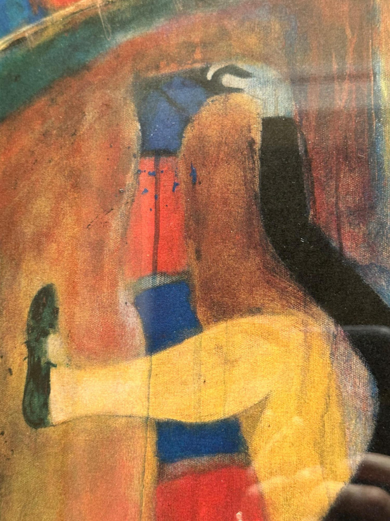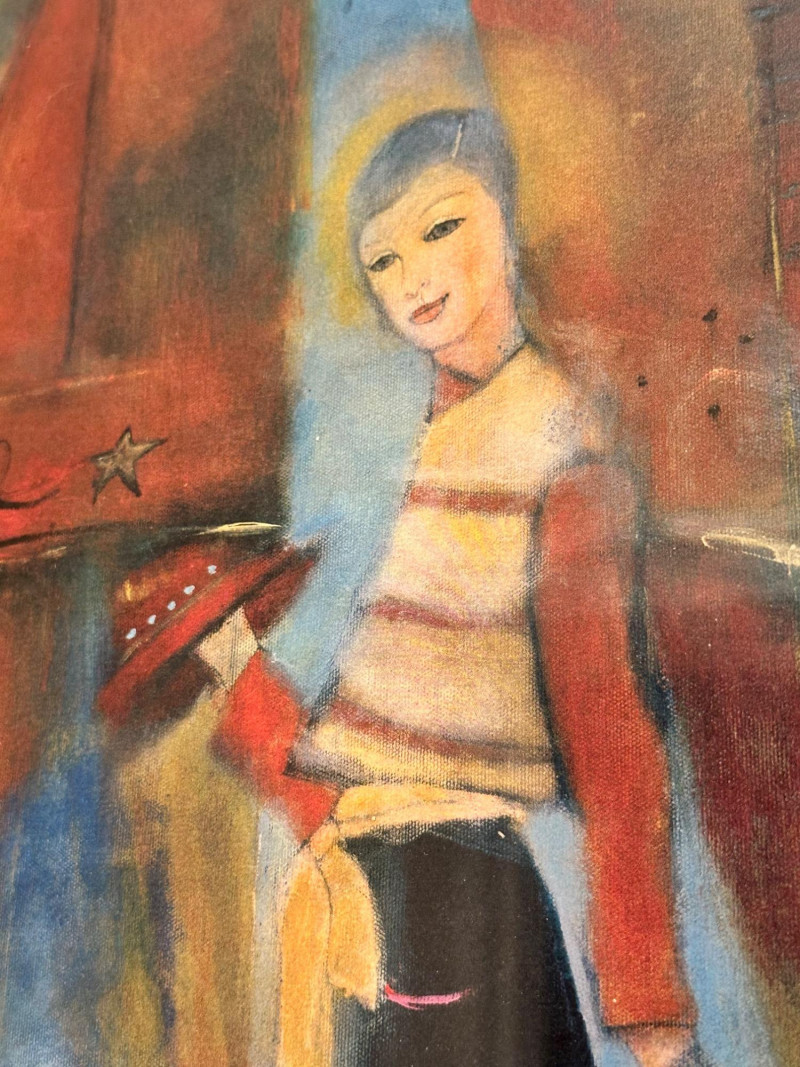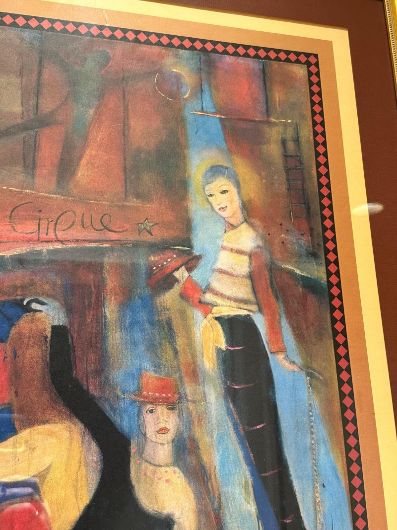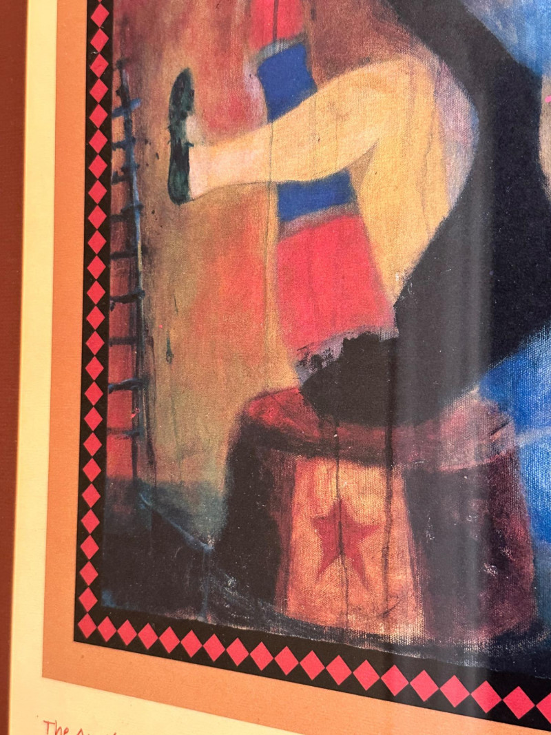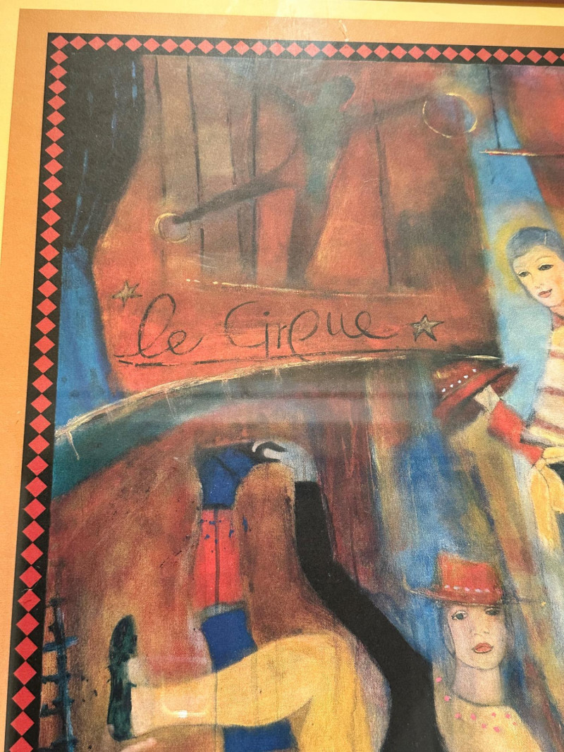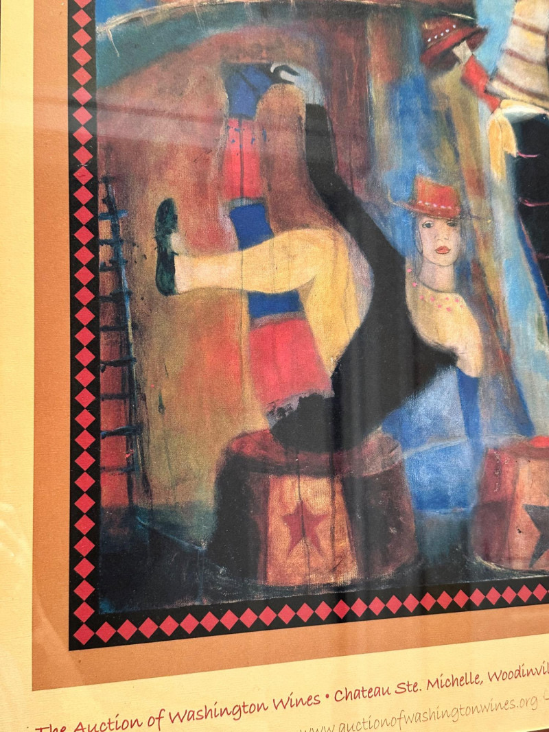 Vibrant and whimsical framed art print titled “Le Cirque,” featuring a colorful circus-themed scene with stylized performers rendered in rich reds, blues, and warm earth tones. The composition includes playful figures, circus props, and decorative border elements that enhance its theatrical charm. This print was produced for The Auction of Washington Wines, held at Chateau Ste. Michelle, Woodinville, WA, August 11–13, 2005, and includes the event details printed along the lower margin. The artwork bears an artist signature within the image (printed signature), and is professionally matted and framed, making it a striking wall display piece. Title: Le Cirque Artist: Signed in image (printed signature) Medium: Offset lithograph / art print Event: The Auction of Washington Wines Location & Date: Chateau Ste. Michelle, Woodinville, WA – August 11–13, 2005 Presentation: Framed with wide mat and gold-tone frame Dimensions (approx.): Overall size: 22.5" W × 30.75" HItem Details: