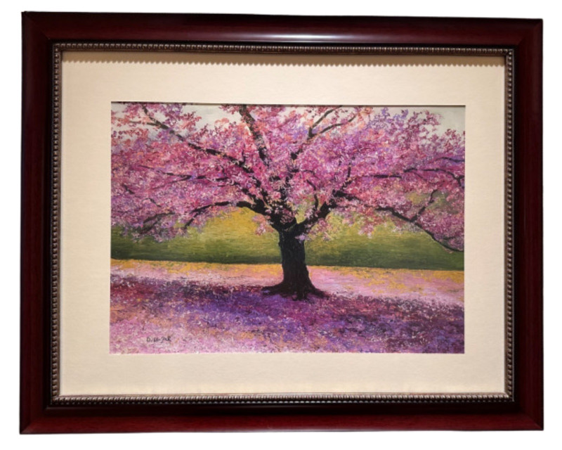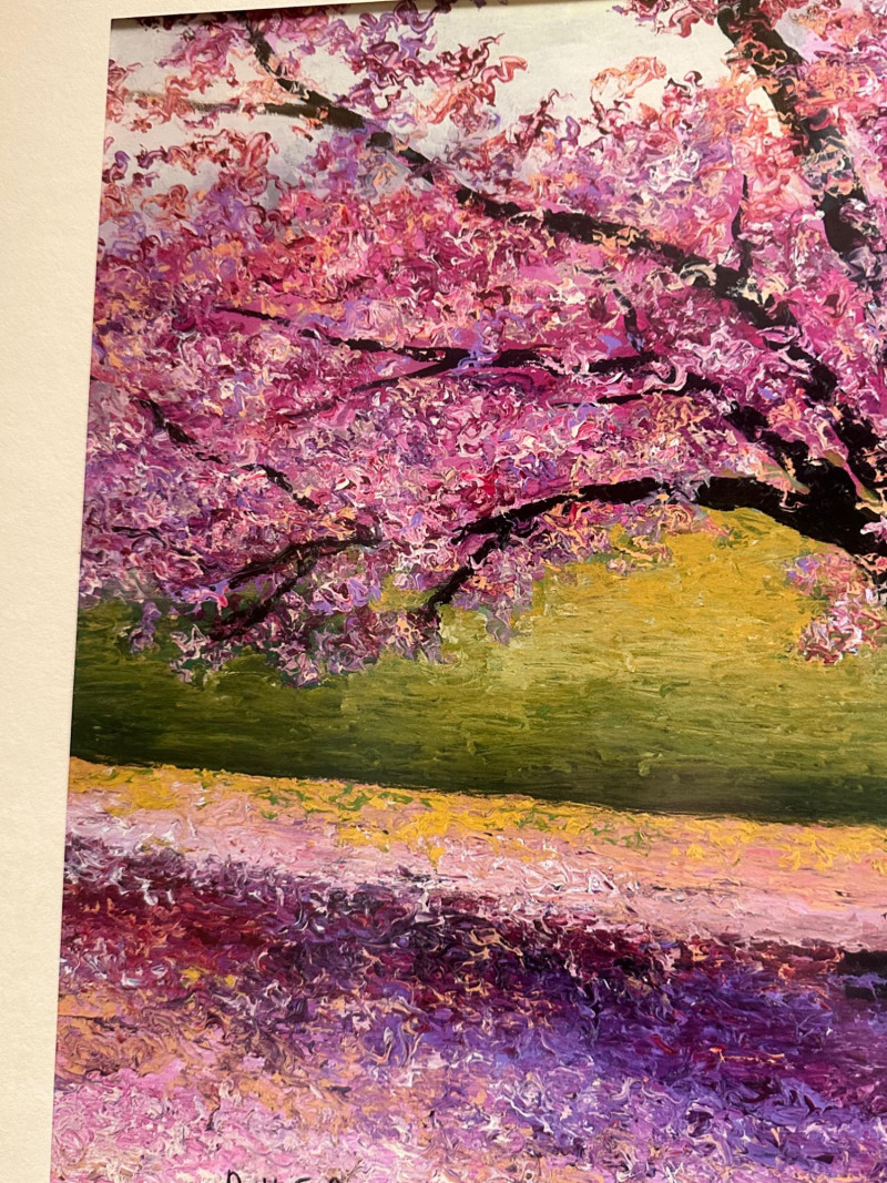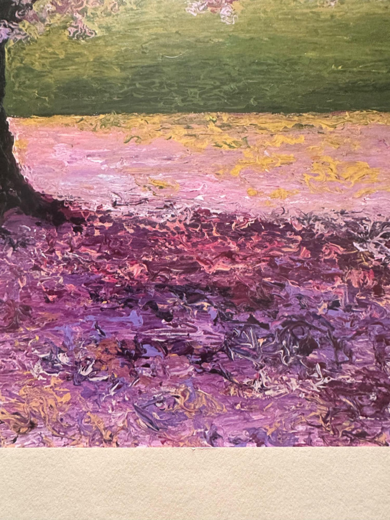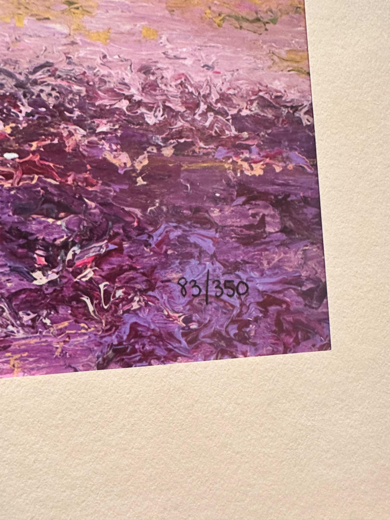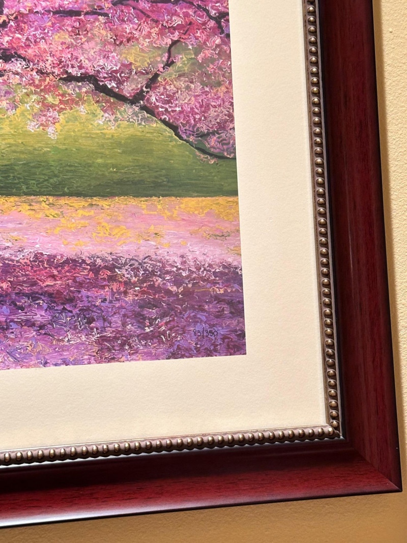 Limited edition giclée print by David Najar, a contemporary Israeli artist known for his vibrant, color-saturated landscapes. Titled Lavender Day, this work features a solitary flowering tree in full bloom, rendered in expressive tones of pink, lavender, and violet. The richly textured appearance and layered coloration evoke fallen petals carpeting the ground beneath the tree, creating a calm, luminous, and atmospheric scene. The artwork is signed “D. Najar” within the image and is professionally presented with a wide cream mat and an ornate gold-tone frame, ready to hang. Artist: David Najar (Israeli, born 1962) Title: Lavender Day Medium: Limited Edition Giclée Print Signature: Signed in image Edition: Limited edition (edition number not verified; see photos) Subject: Blossom tree landscape Orientation: Horizontal Framed: Yes Overall Framed Size: 30 in. wide x 23.5 in. highItem Details: