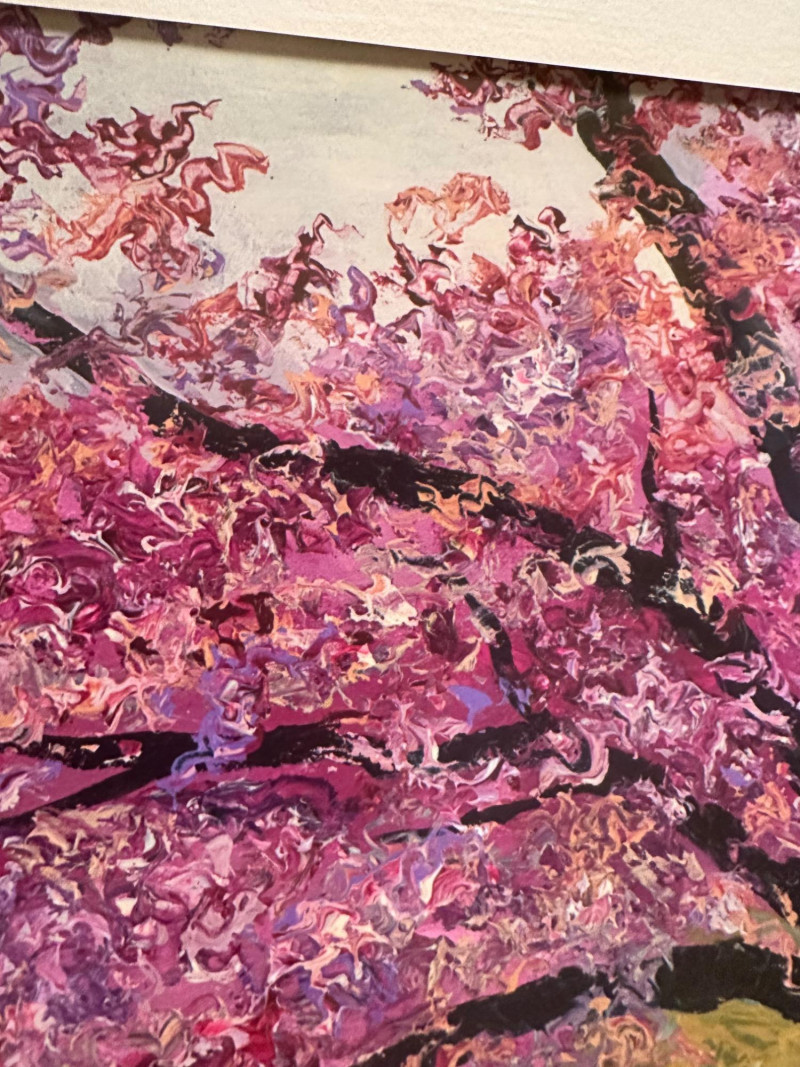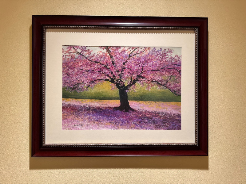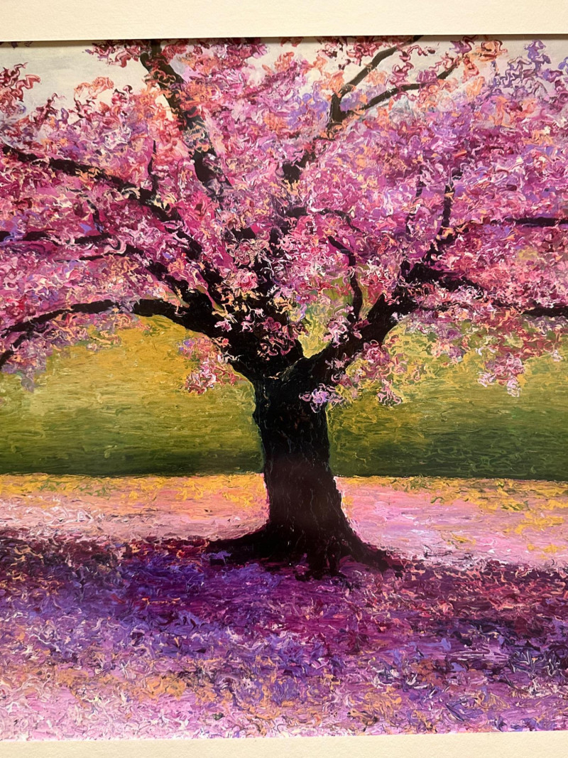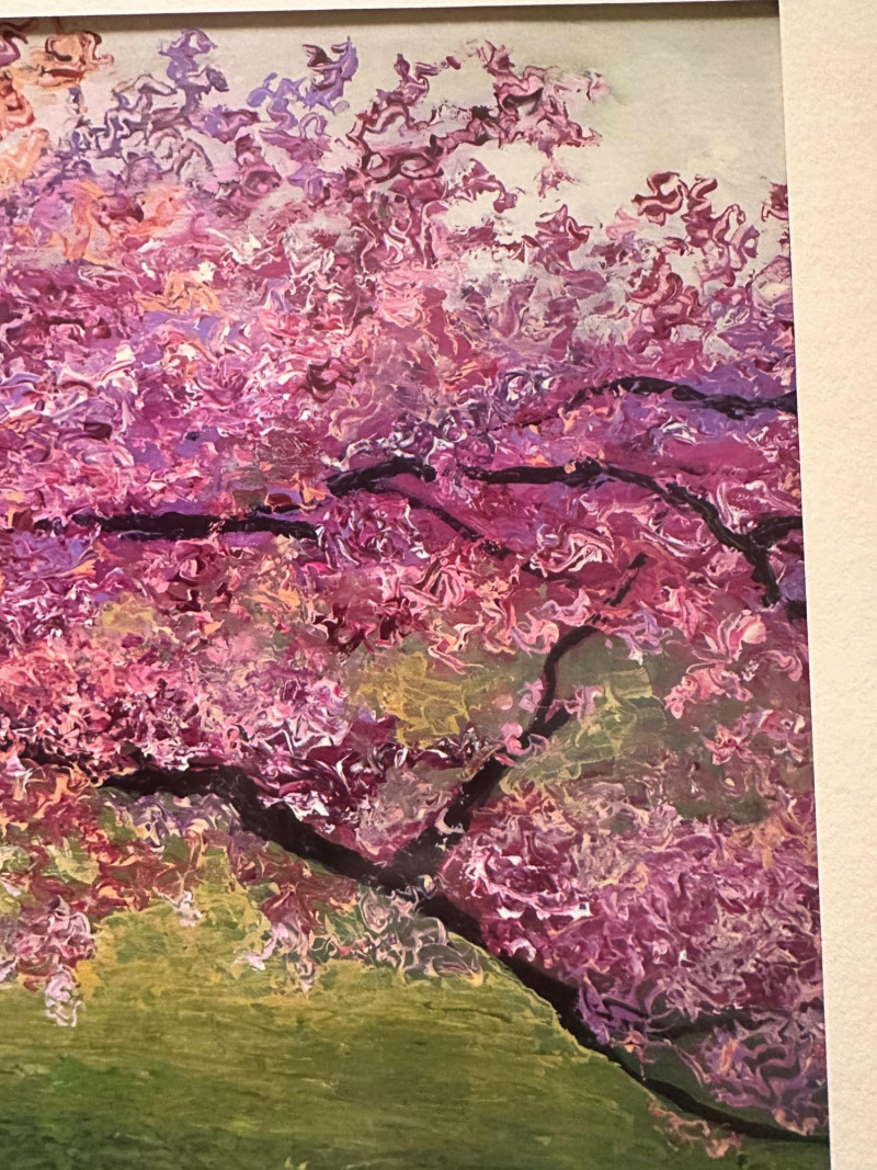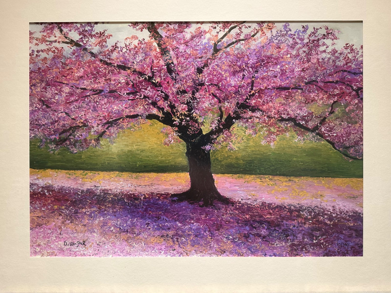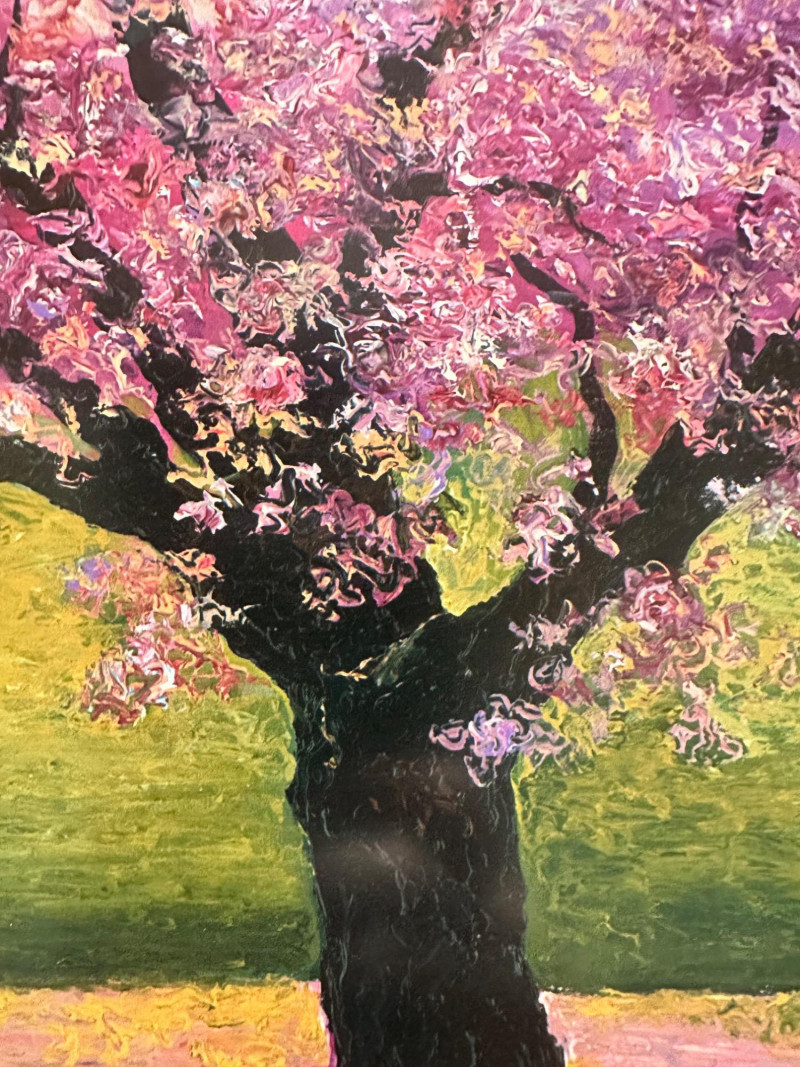 Limited edition giclée print by David Najar, a contemporary Israeli artist known for his vibrant, color-saturated landscapes. Titled Lavender Day, this work features a solitary flowering tree in full bloom, rendered in expressive tones of pink, lavender, and violet. The richly textured appearance and layered coloration evoke fallen petals carpeting the ground beneath the tree, creating a calm, luminous, and atmospheric scene. The artwork is signed “D. Najar” within the image and is professionally presented with a wide cream mat and an ornate gold-tone frame, ready to hang. Artist: David Najar (Israeli, born 1962) Title: Lavender Day Medium: Limited Edition Giclée Print Signature: Signed in image Edition: Limited edition (edition number not verified; see photos) Subject: Blossom tree landscape Orientation: Horizontal Framed: Yes Overall Framed Size: 30 in. wide x 23.5 in. highItem Details: