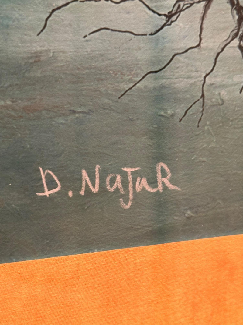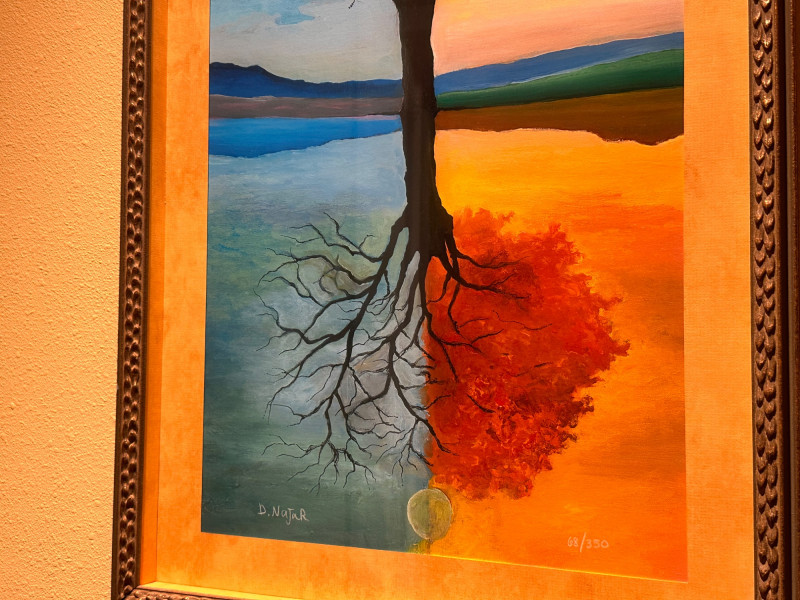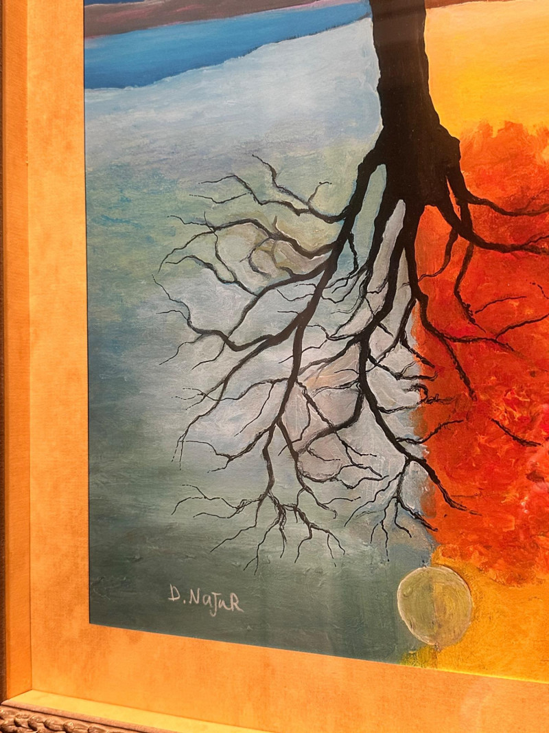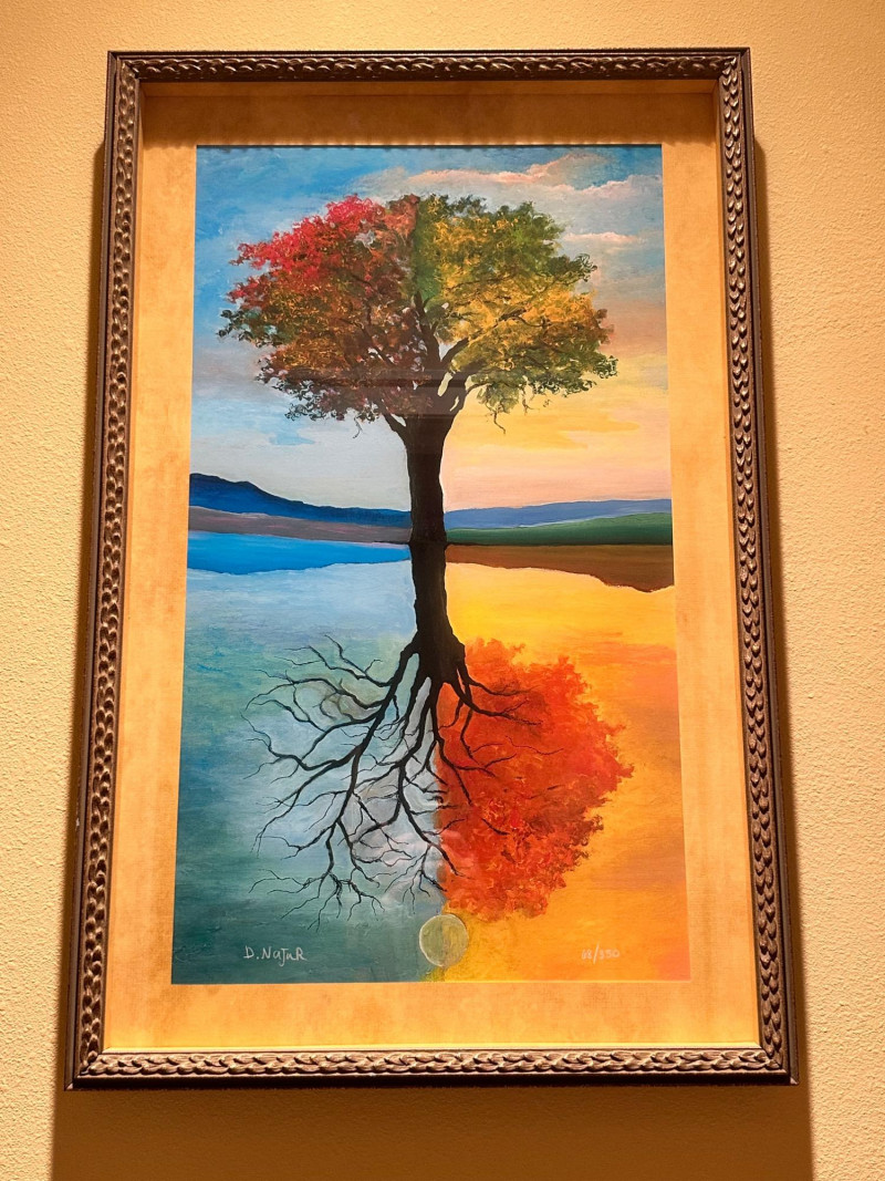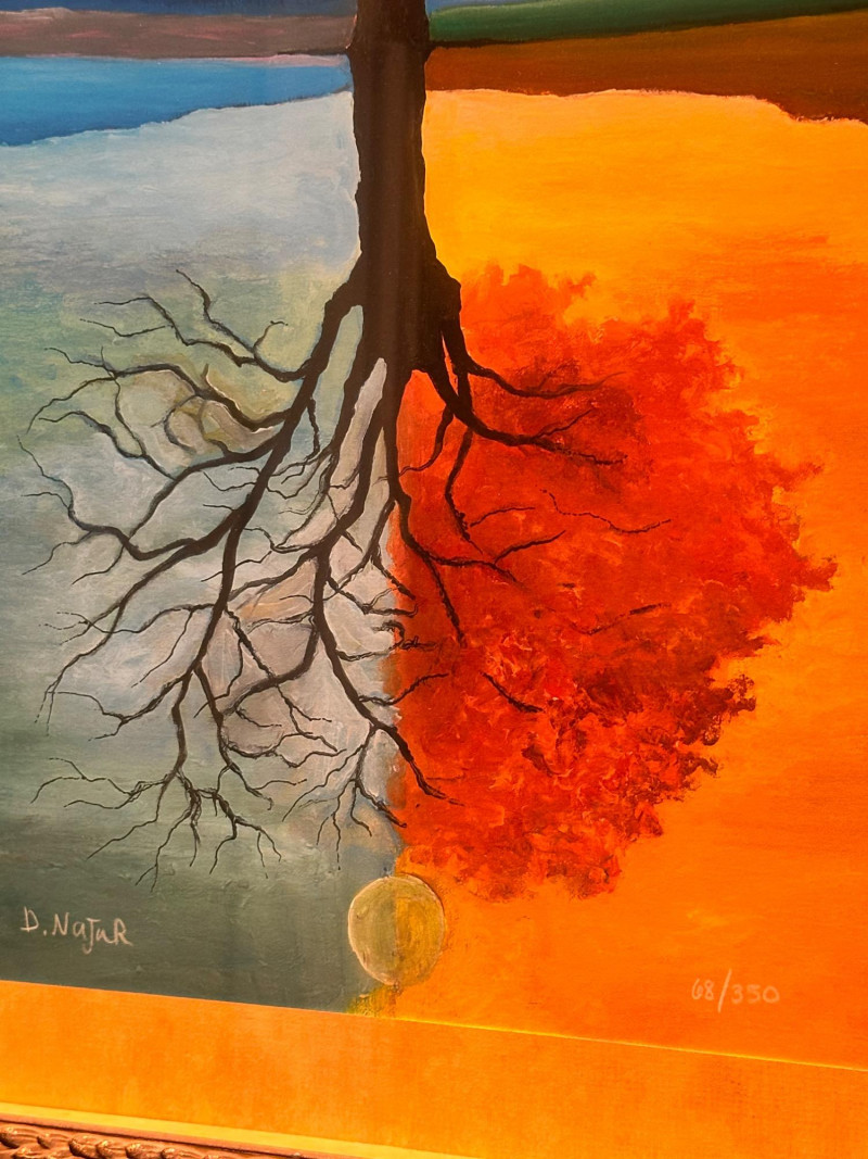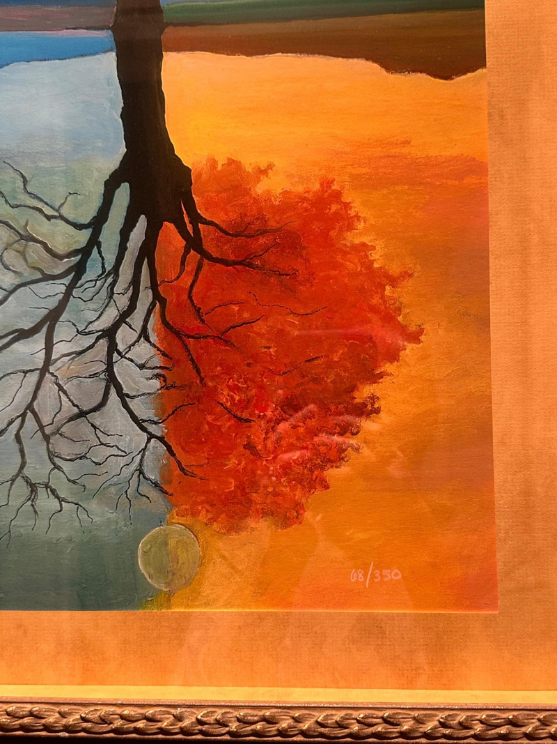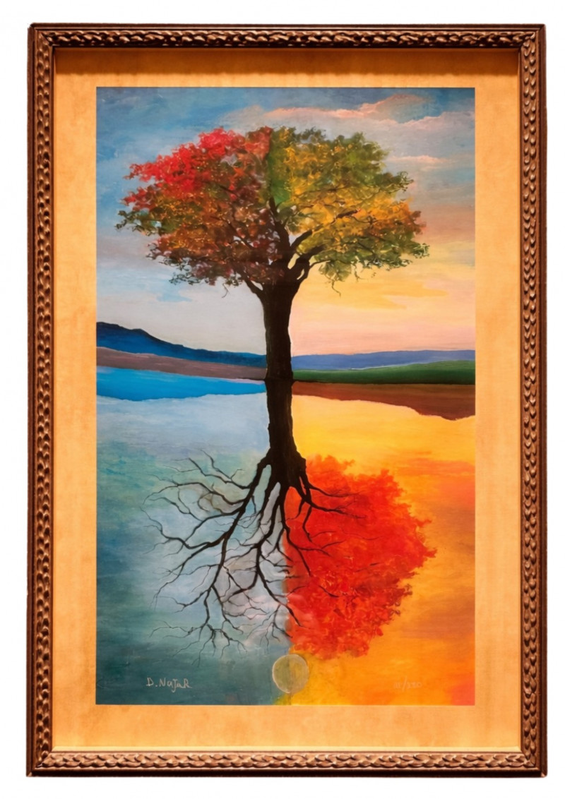 This is a framed giclée print of Season Illusion by David Najar, an Israeli artist known for symbolic landscape compositions and themes of reflection and transformation. The artwork depicts all four seasons simultaneously within a single tree, divided into contrasting color fields. Warm autumnal and golden tones transition into cooler blues and greens, while the tree’s reflection below mirrors the seasonal transformation, extending into exposed roots beneath the surface. The balanced composition emphasizes duality, change, and continuity in nature. This example is a limited edition giclée print, numbered 68/350, as visible in the lower right corner. The piece is presented in a wide mat and decorative frame, making it ready for display. Artist: David Najar Title: Season Illusion Medium: Giclée print (high-quality fine art print) Edition: Limited edition, 68/350 Signature: Signed “D. Najar” within the image Framing: Framed with wide mat and decorative frame Orientation: Vertical Subject / Style: Symbolic landscape, seasons, reflection, contemporary artItem Details: