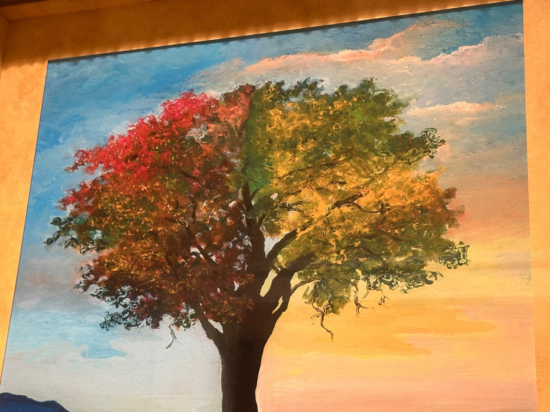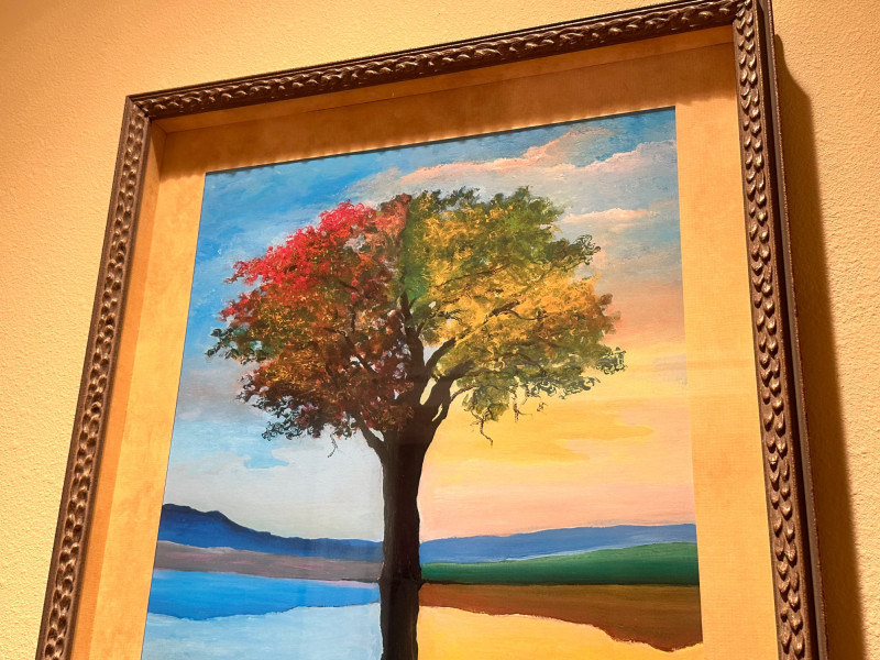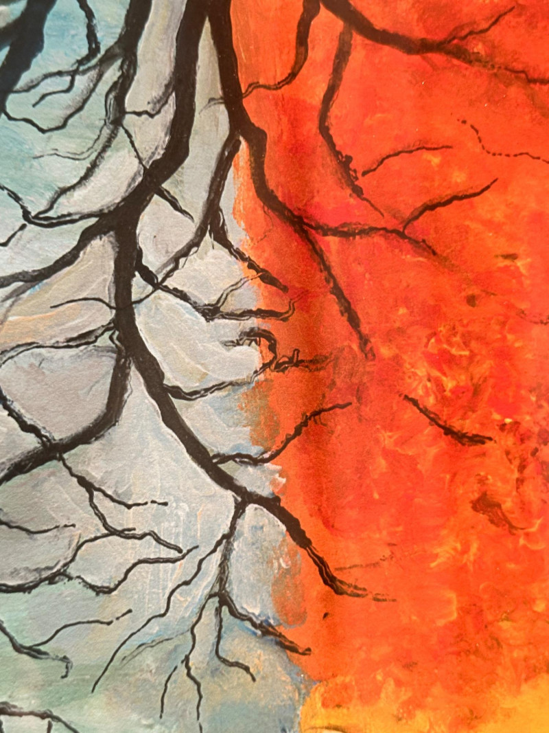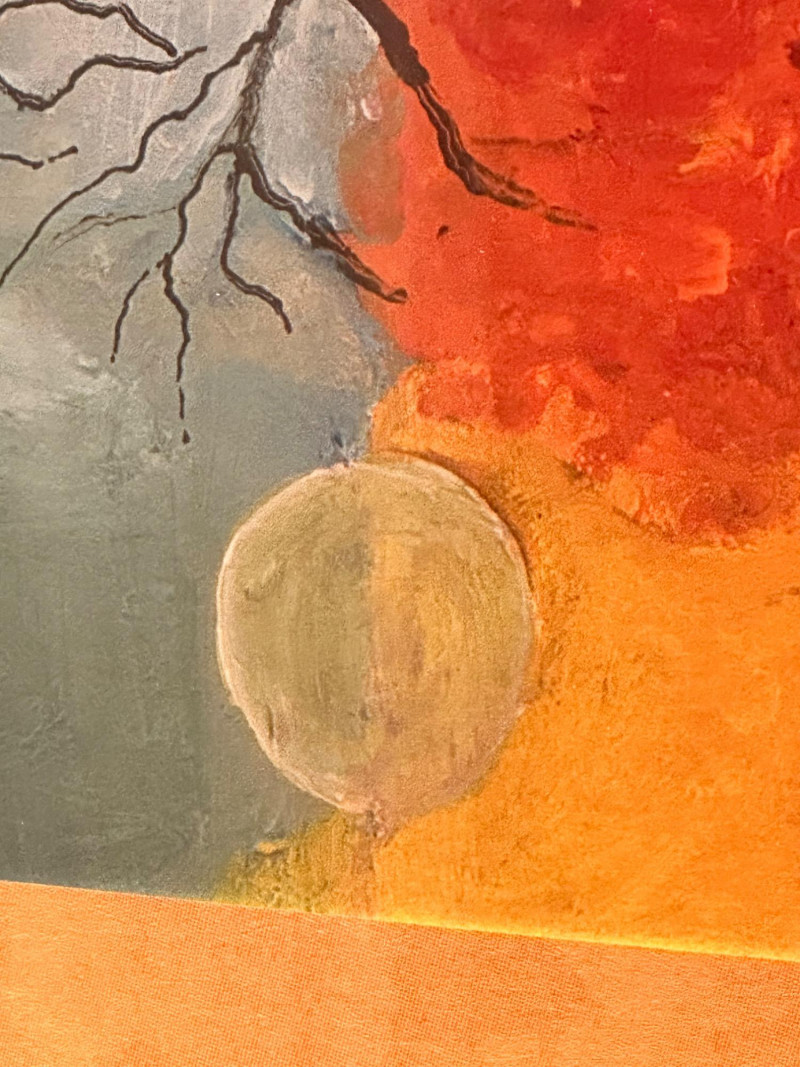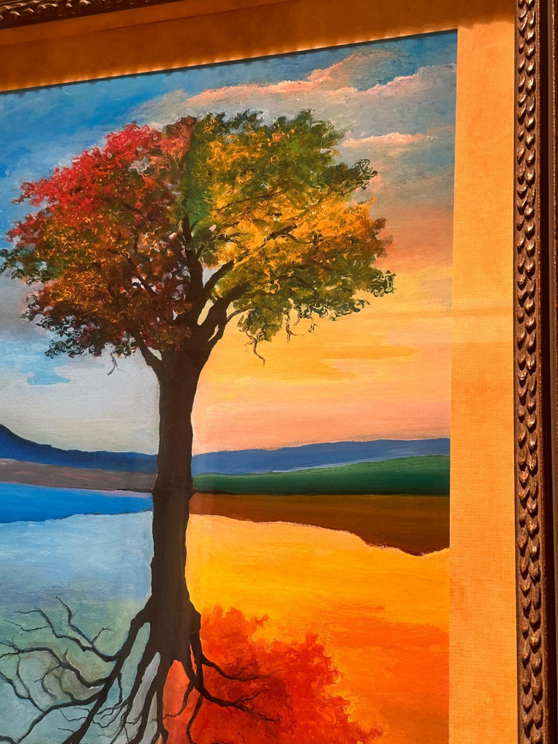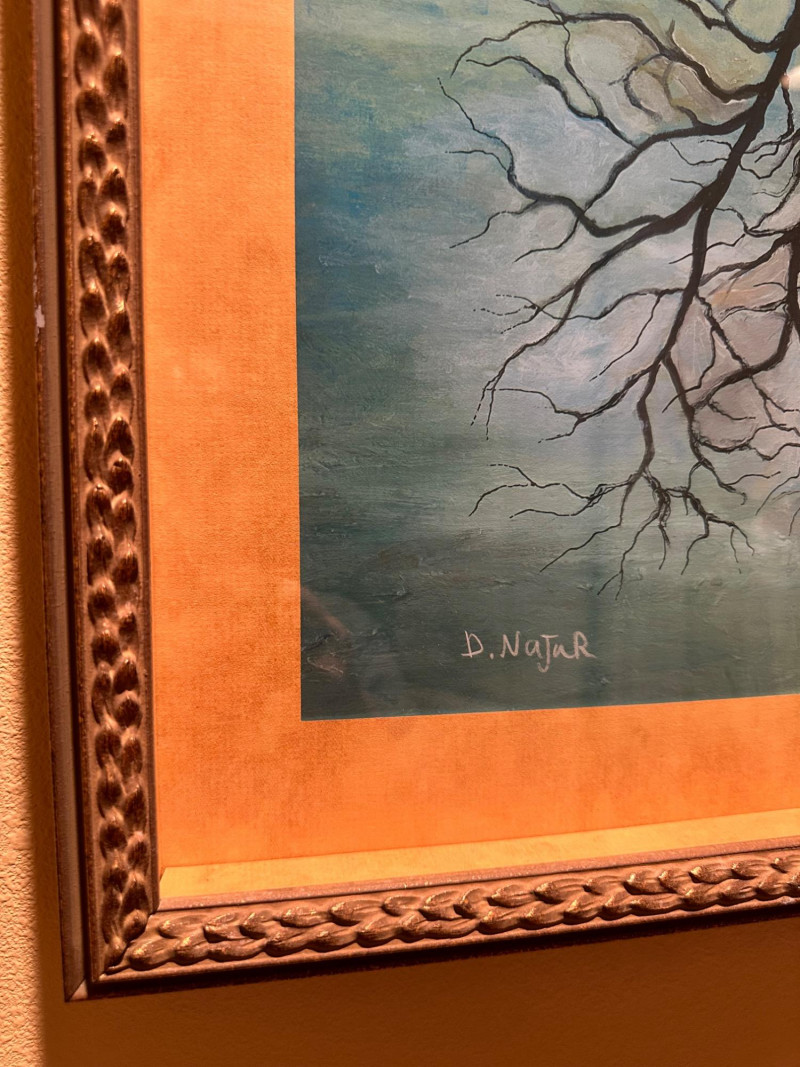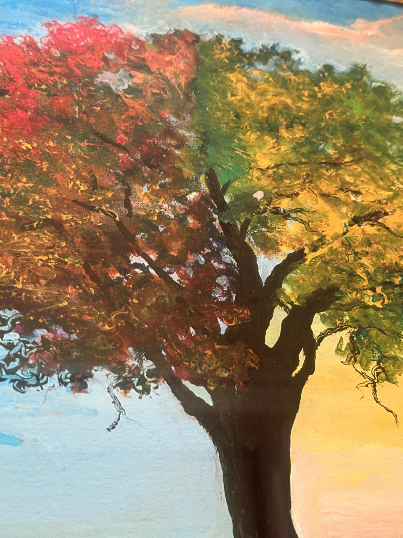 This is a framed giclée print of Season Illusion by David Najar, an Israeli artist known for symbolic landscape compositions and themes of reflection and transformation. The artwork depicts all four seasons simultaneously within a single tree, divided into contrasting color fields. Warm autumnal and golden tones transition into cooler blues and greens, while the tree’s reflection below mirrors the seasonal transformation, extending into exposed roots beneath the surface. The balanced composition emphasizes duality, change, and continuity in nature. This example is a limited edition giclée print, numbered 68/350, as visible in the lower right corner. The piece is presented in a wide mat and decorative frame, making it ready for display. Artist: David Najar Title: Season Illusion Medium: Giclée print (high-quality fine art print) Edition: Limited edition, 68/350 Signature: Signed “D. Najar” within the image Framing: Framed with wide mat and decorative frame Orientation: Vertical Subject / Style: Symbolic landscape, seasons, reflection, contemporary artItem Details: