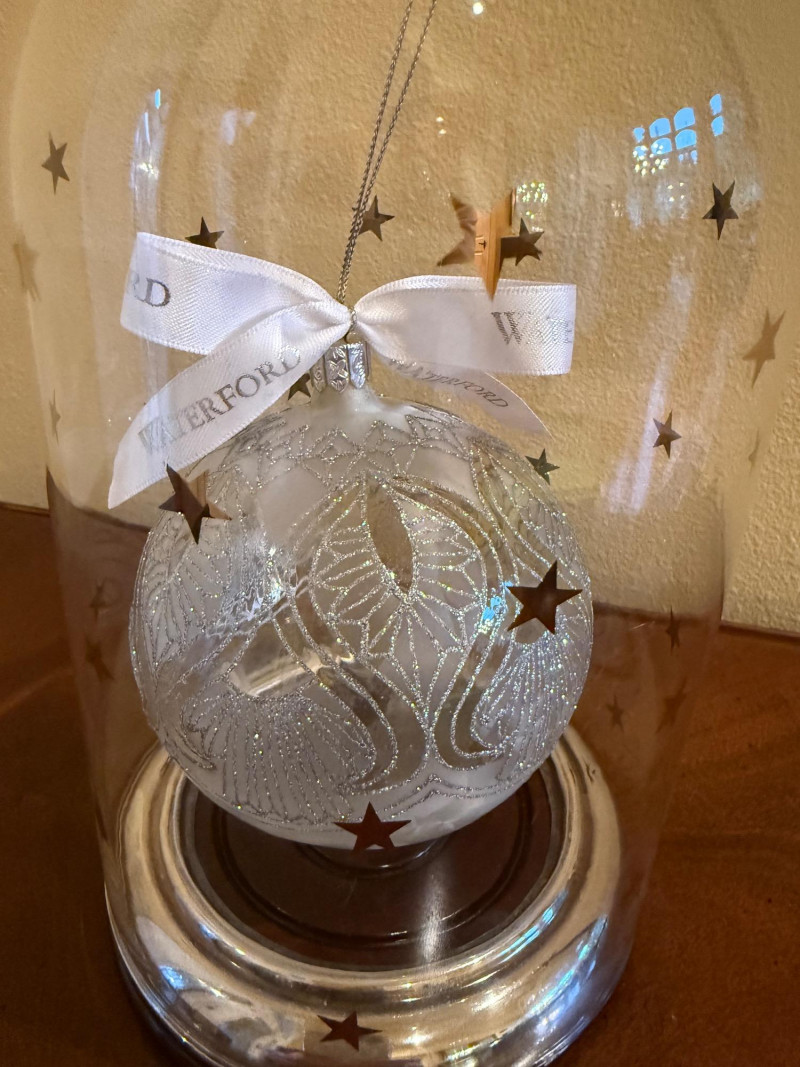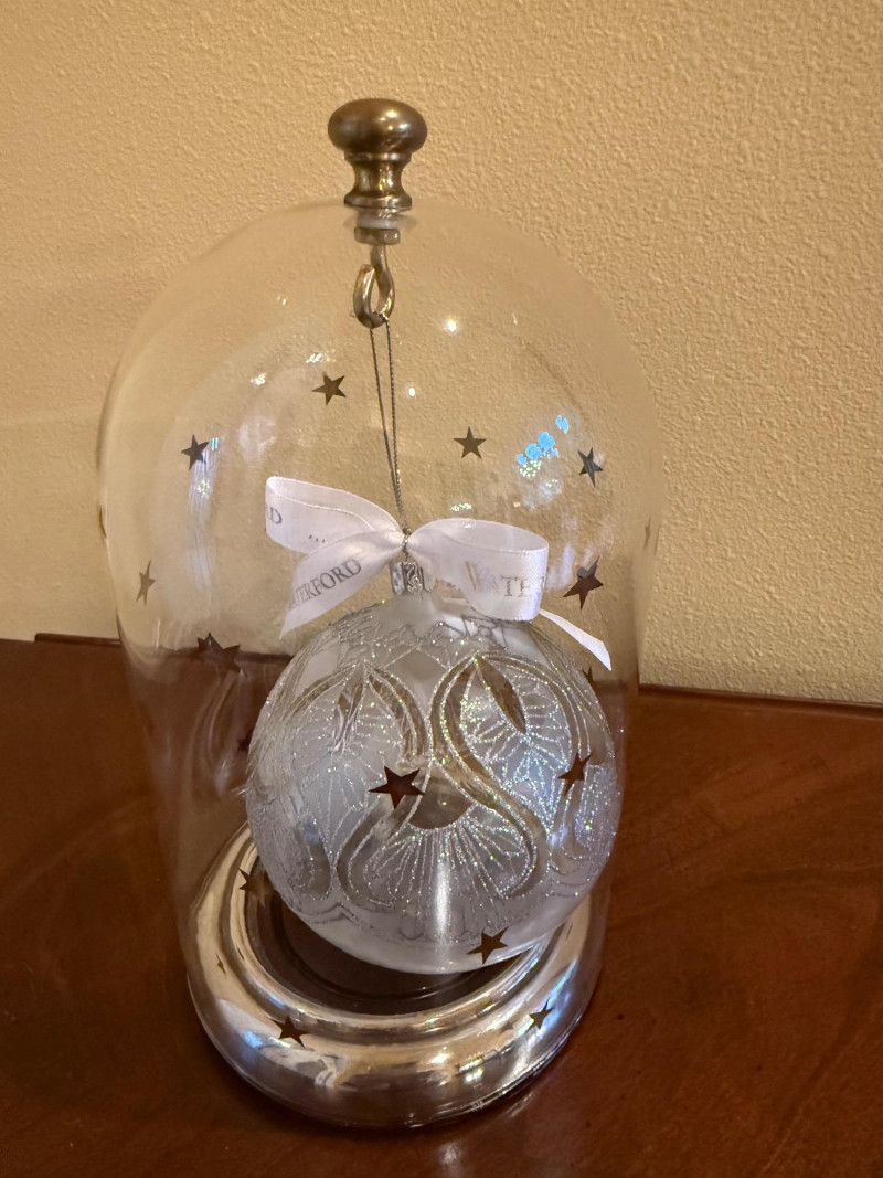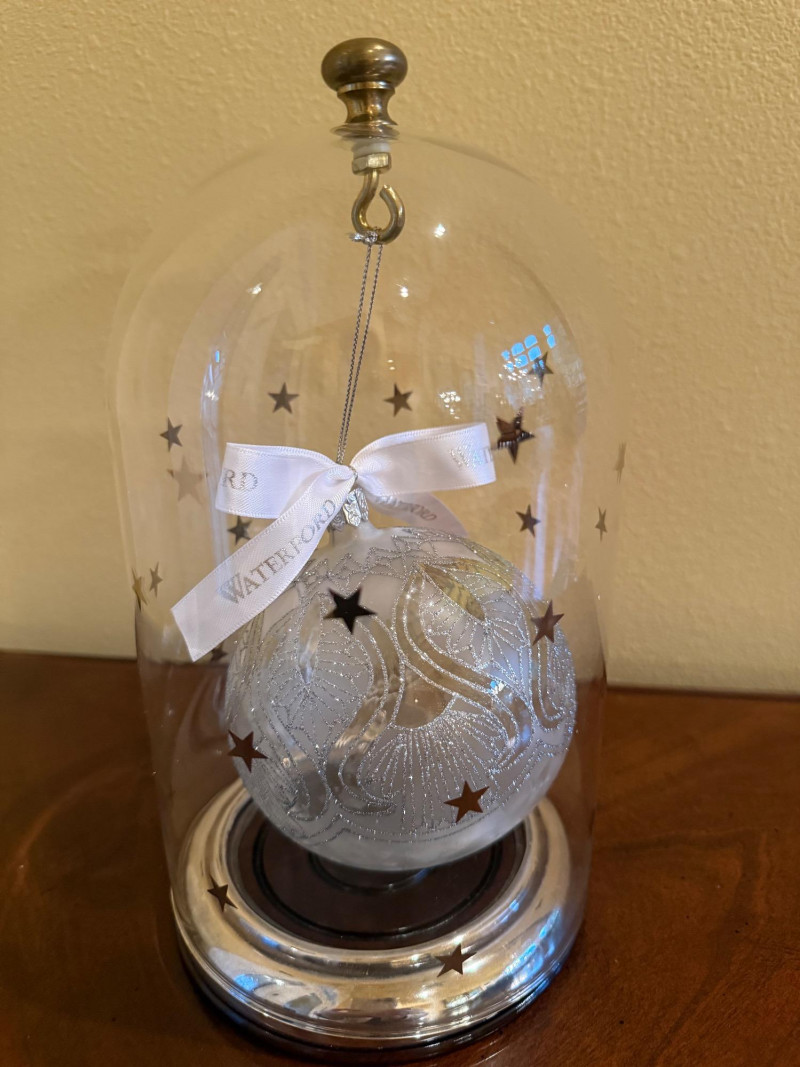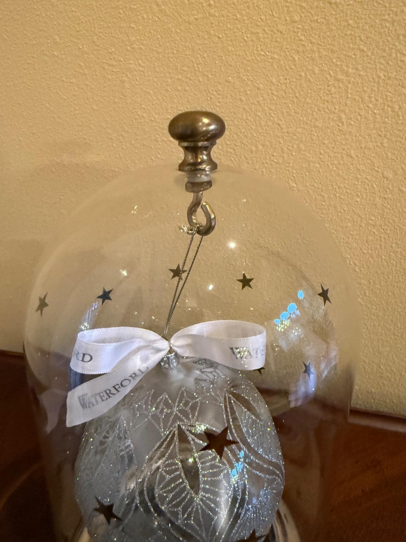 Elegant Waterford crystal ornament presented in a clear glass dome display case with star accents and a polished metal base. The ornament features a frosted and clear crystal finish with intricate etched scroll and leaf motifs, finished with a white ribbon marked “Waterford.” The glass dome creates a refined presentation, ideal for holiday décor or year-round display. A sophisticated decorative piece showcasing classic Waterford style. Brand: Waterford Item Type: Crystal ornament with display dome case Materials: Crystal ornament; glass dome; metal base Design: Etched scroll and leaf pattern; star-accented dome Color: Clear, frosted crystal with silver-tone accents Markings: Waterford ribbon attached to ornament Display: Freestanding glass dome with removable cover Overall Height (with dome): 16″ Base Diameter: 5″ Ornament Diameter: 4″Item Details: