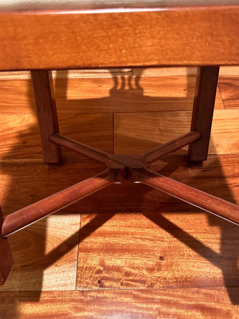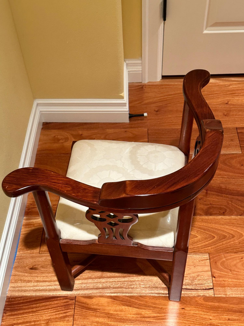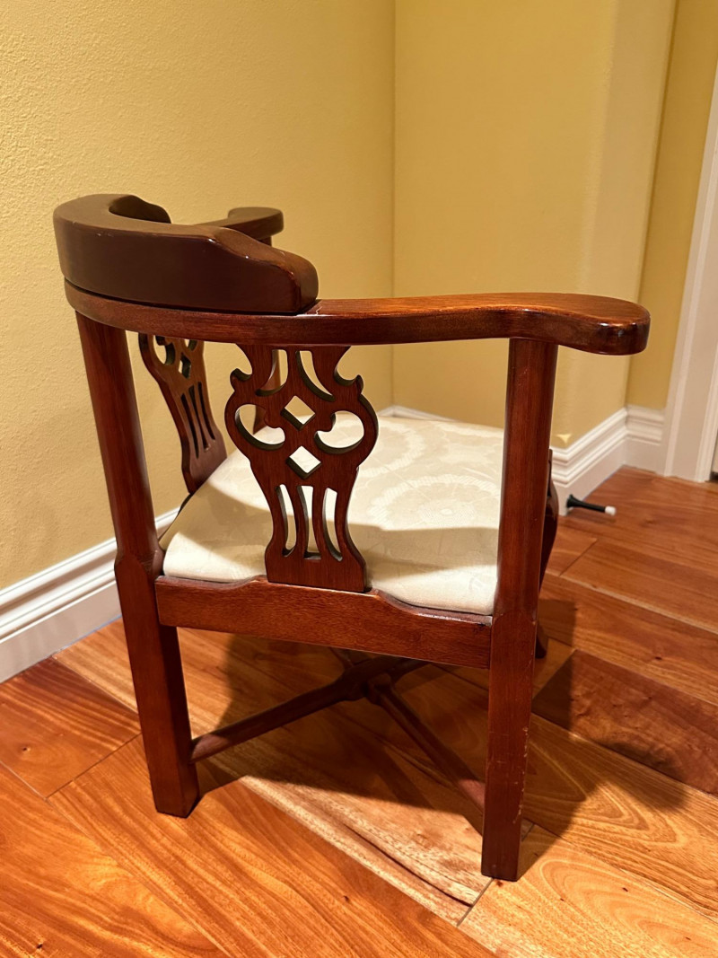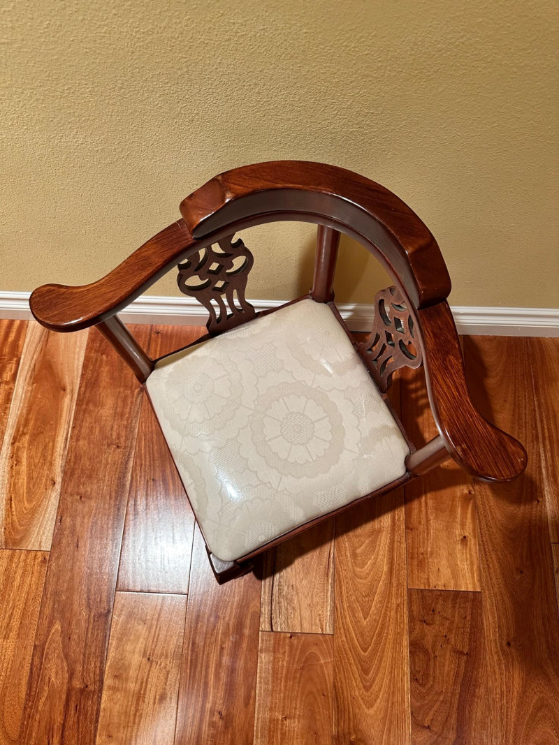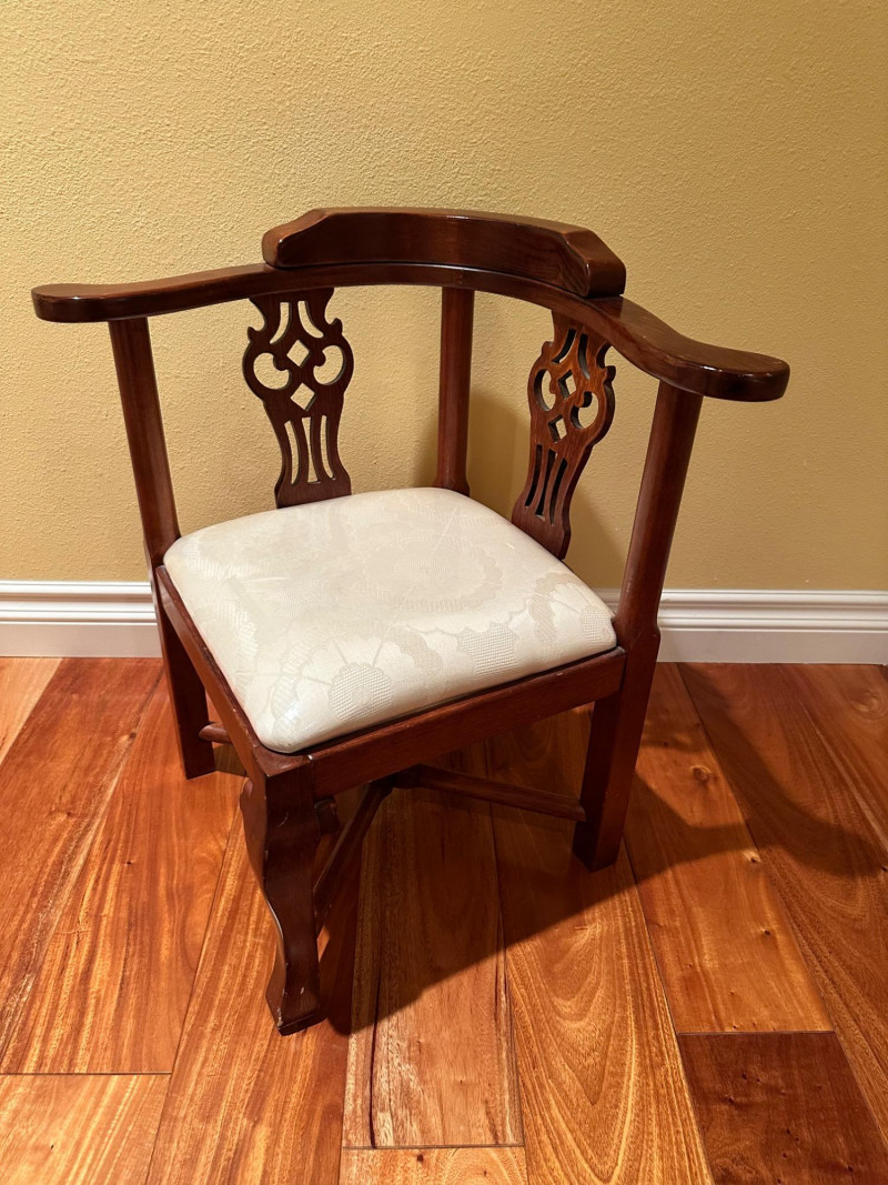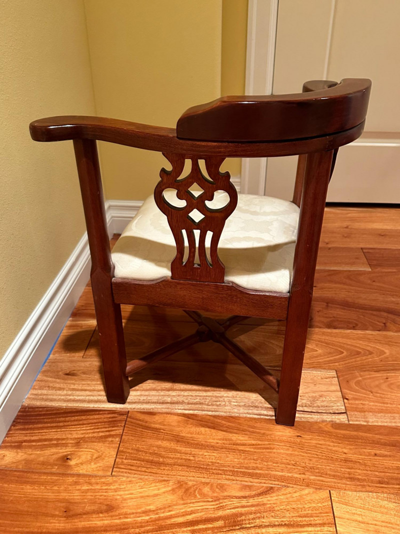 Elegant vintage George III–style corner chair crafted from richly finished wood, featuring gracefully curved arms and decorative pierced splats on each side of the back. Designed to fit neatly into a corner, this classic form blends refined Georgian styling with practical function. The chair is fitted with a removable upholstered seat cushion in a neutral cream fabric with a subtle floral pattern, complementing the warm wood tones. The base features sturdy legs joined by crossed stretchers, providing both stability and visual interest. A handsome accent piece suitable for a study, bedroom, hallway, or traditional living space. Style: George III–style Type: Corner chair Material: Solid wood frame Finish: Warm medium-brown wood tone Seat: Upholstered cushion (removable) Upholstery Color: Cream with subtle floral pattern Back: Pierced decorative splats Base: Cross-stretcher supportDetails: