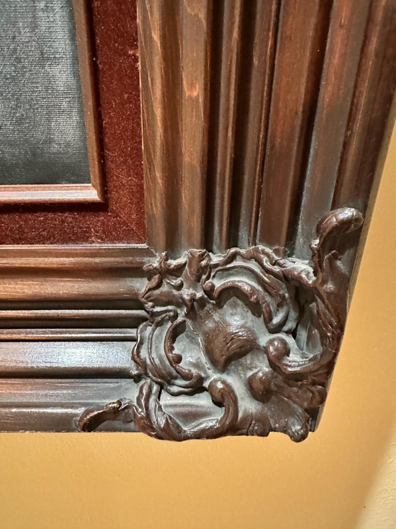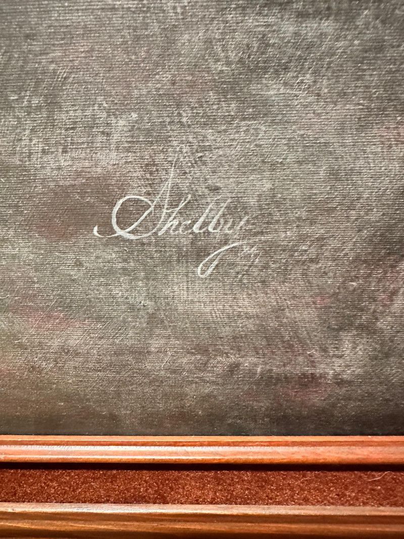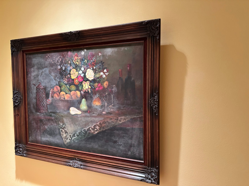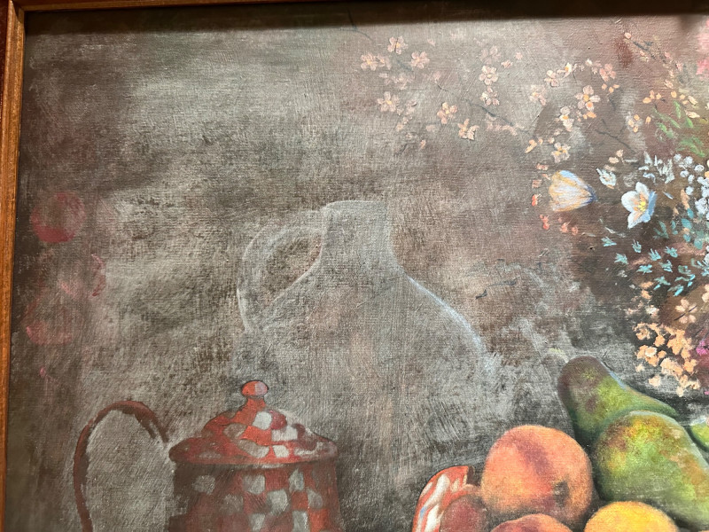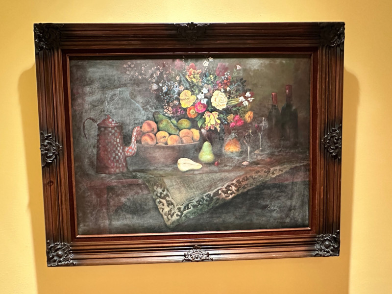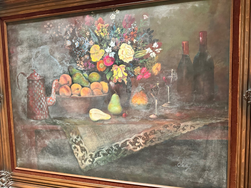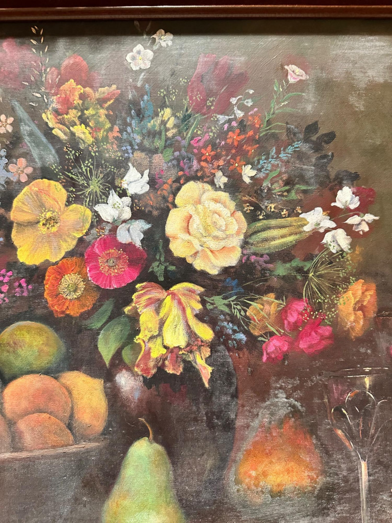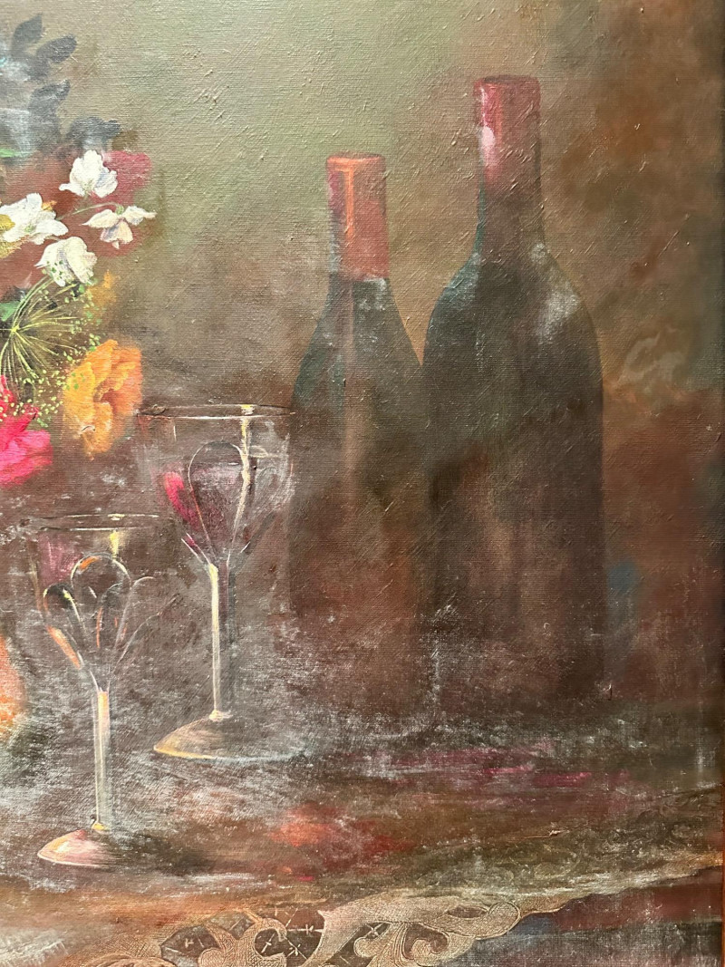 Elegant still life painting depicting a richly arranged tabletop scene featuring a vibrant floral bouquet, assorted fruit, wine bottles, and stemware. The composition is rendered in warm, muted tones with soft, atmospheric shading, evoking a classic European still-life aesthetic. The artwork is signed “Shelly” at the lower right and is presented in an impressive, ornate carved wood frame that enhances its traditional character and visual presence. Artist: Signed “Shelly” (lower right) Medium: Appears to be oil or oil-style painting on canvas (textured surface visible) Subject: Still life with flowers, fruit, wine bottles, glasses, and table setting Frame: Heavy, decorative carved wood frame with corner and center embellishments Presentation: Ready to hang; frame included Style: Traditional / Classic still lifeDetails:
