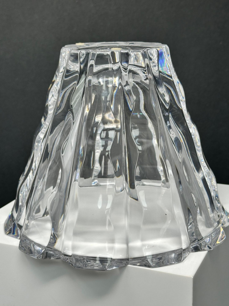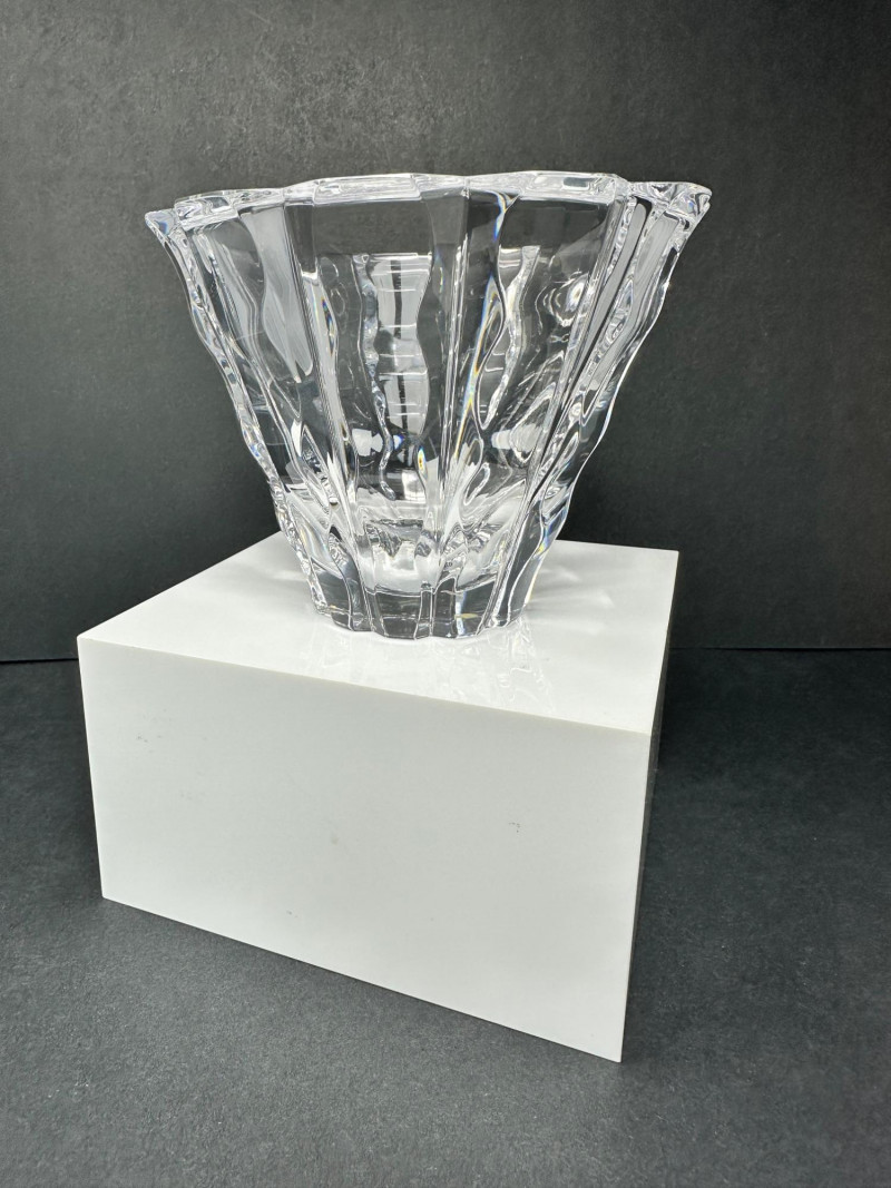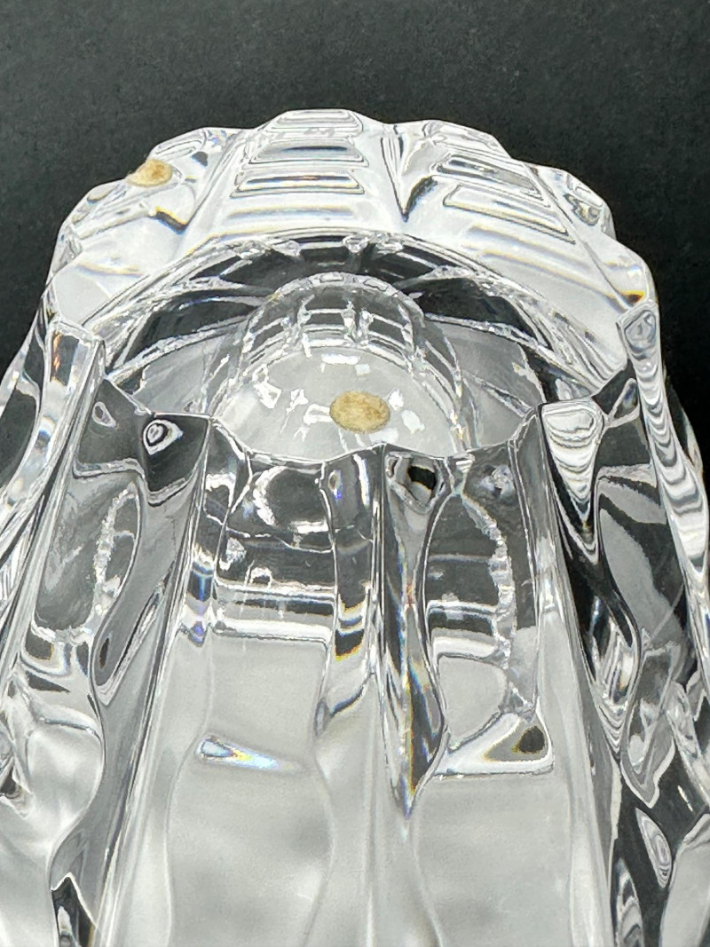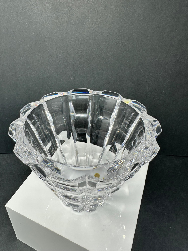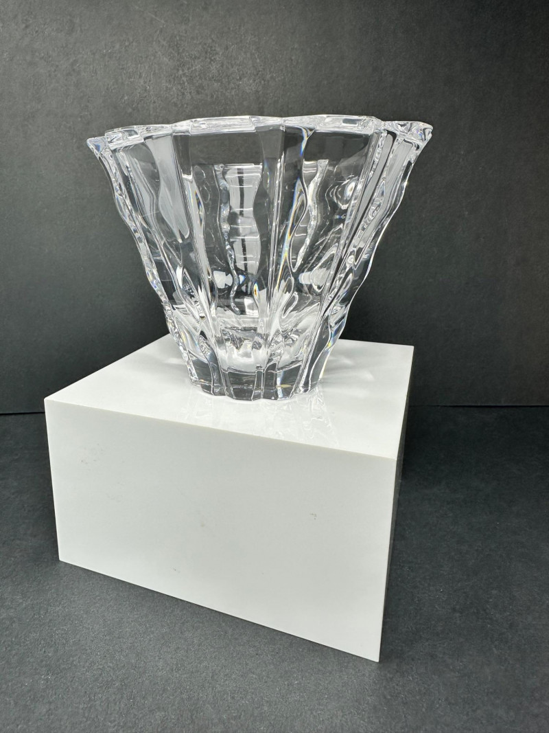 Striking cut crystal bowl in Style 4701-12, featuring deep vertical facets and a sculptural scalloped base. The bold architectural cuts create strong light refraction and visual depth, giving the piece a refined modern presence while maintaining exceptional clarity. Based on documented examples and close visual comparison, this piece is likely produced by Orrefors, Sweden. The form, proportions, and cutting style align with known Orrefors designs from the late 20th century. The bowl flares outward from a solid, polished base to a wide rim, allowing it to function as a decorative bowl, centerpiece, or low-profile vase. The underside shows handwritten inventory markings consistent with cataloged or retail stock, along with minor residue from a former label. Likely Maker: Orrefors Country of Origin: Sweden Style: 4701-12 Material: Cut crystal Design: Vertical faceting with scalloped base Color: Clear Height: Approx. 5″ Diameter (top): Approx. 6.5″ Base: Polished with rounded centerItem Details: