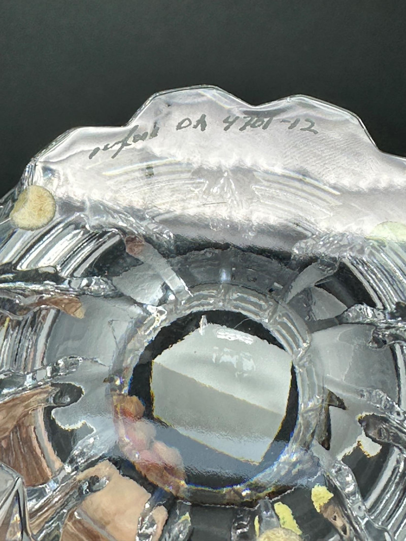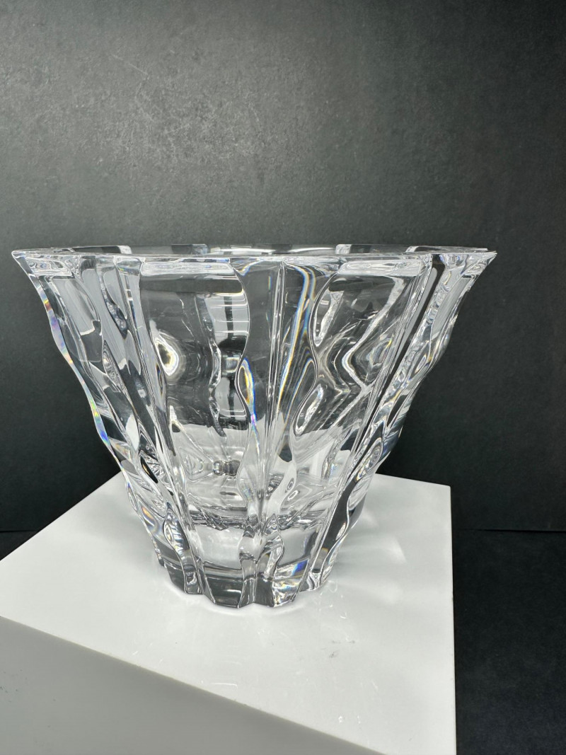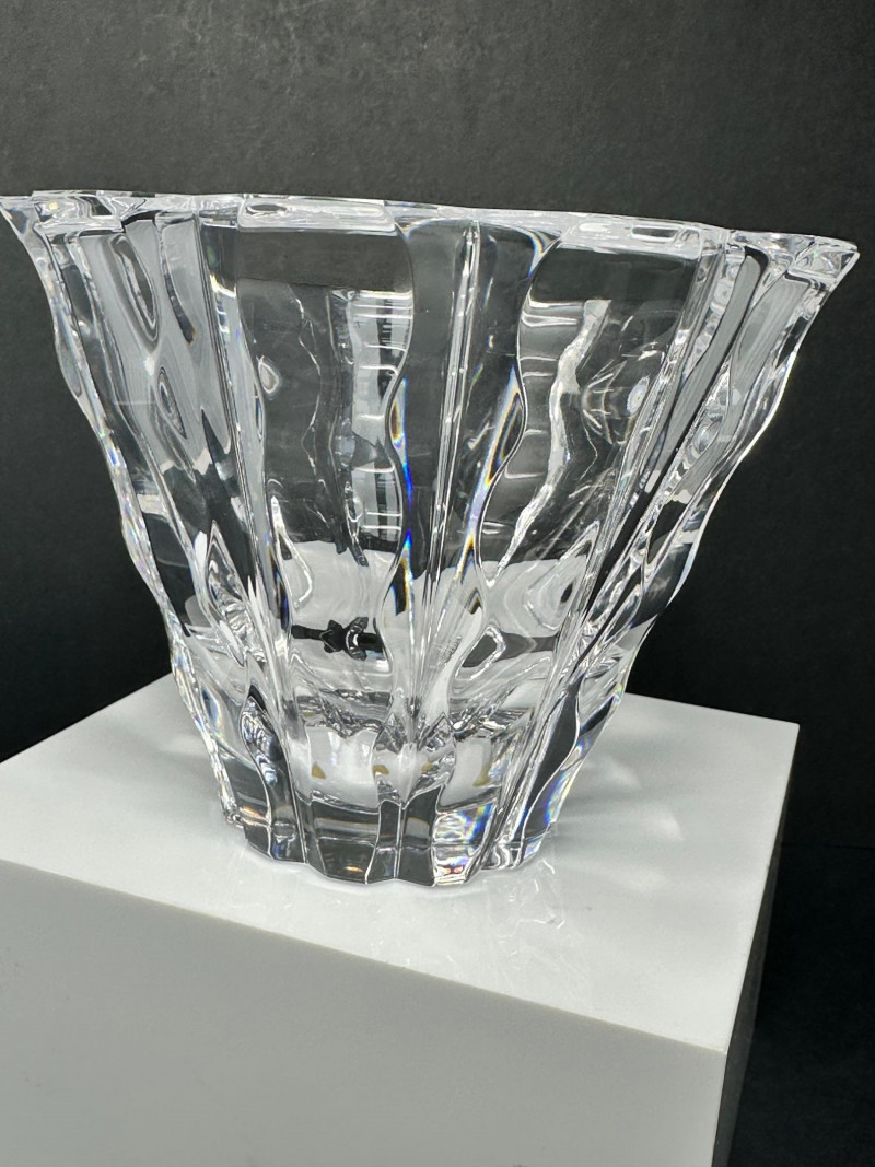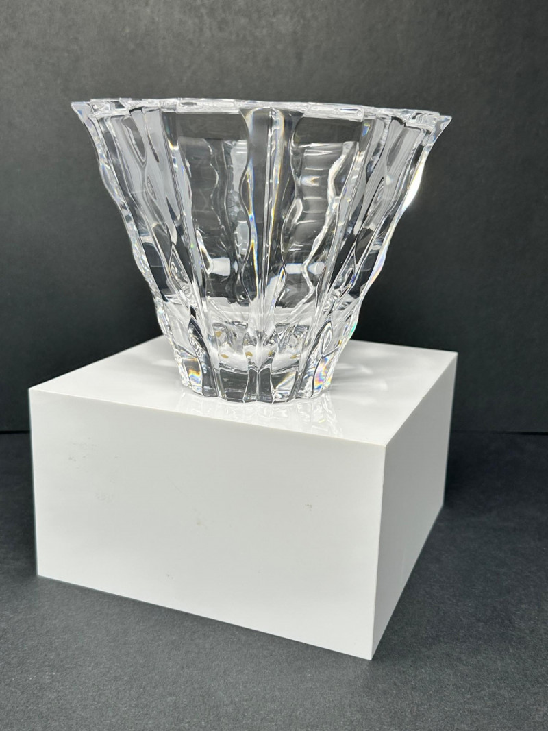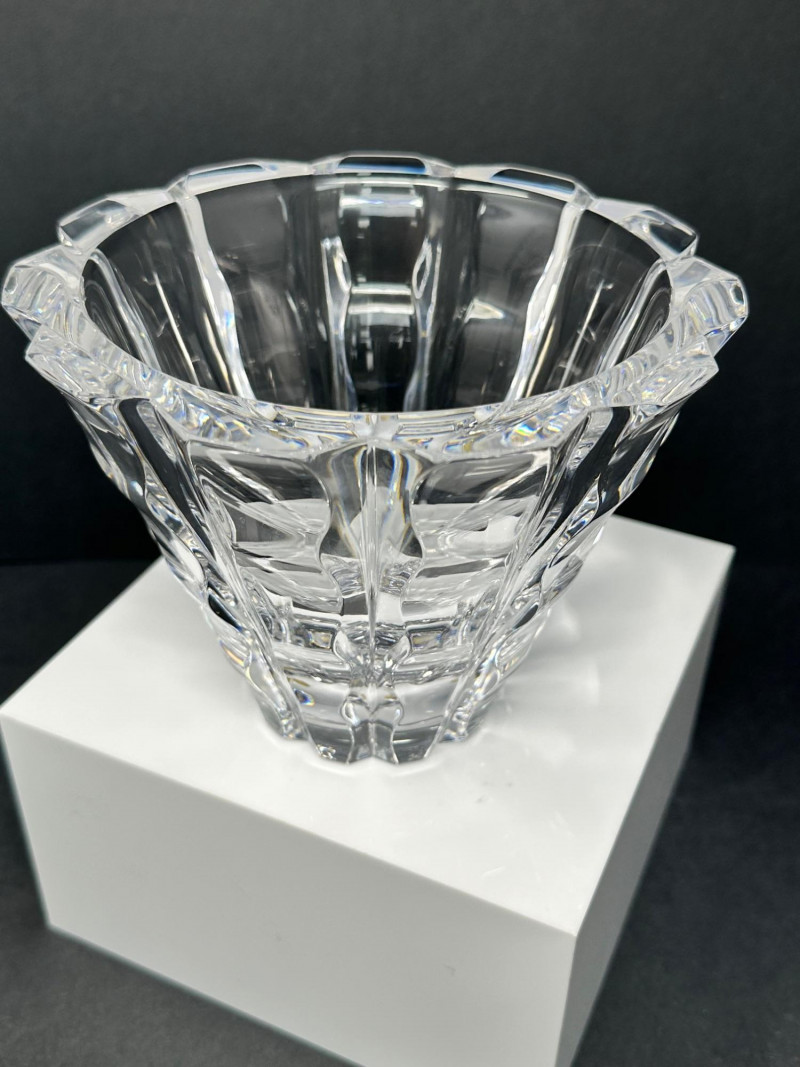 Striking cut crystal bowl in Style 4701-12, featuring deep vertical facets and a sculptural scalloped base. The bold architectural cuts create strong light refraction and visual depth, giving the piece a refined modern presence while maintaining exceptional clarity. Based on documented examples and close visual comparison, this piece is likely produced by Orrefors, Sweden. The form, proportions, and cutting style align with known Orrefors designs from the late 20th century. The bowl flares outward from a solid, polished base to a wide rim, allowing it to function as a decorative bowl, centerpiece, or low-profile vase. The underside shows handwritten inventory markings consistent with cataloged or retail stock, along with minor residue from a former label. Likely Maker: Orrefors Country of Origin: Sweden Style: 4701-12 Material: Cut crystal Design: Vertical faceting with scalloped base Color: Clear Height: Approx. 5″ Diameter (top): Approx. 6.5″ Base: Polished with rounded centerItem Details: