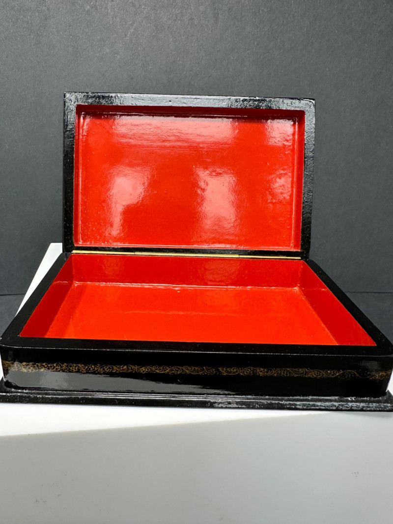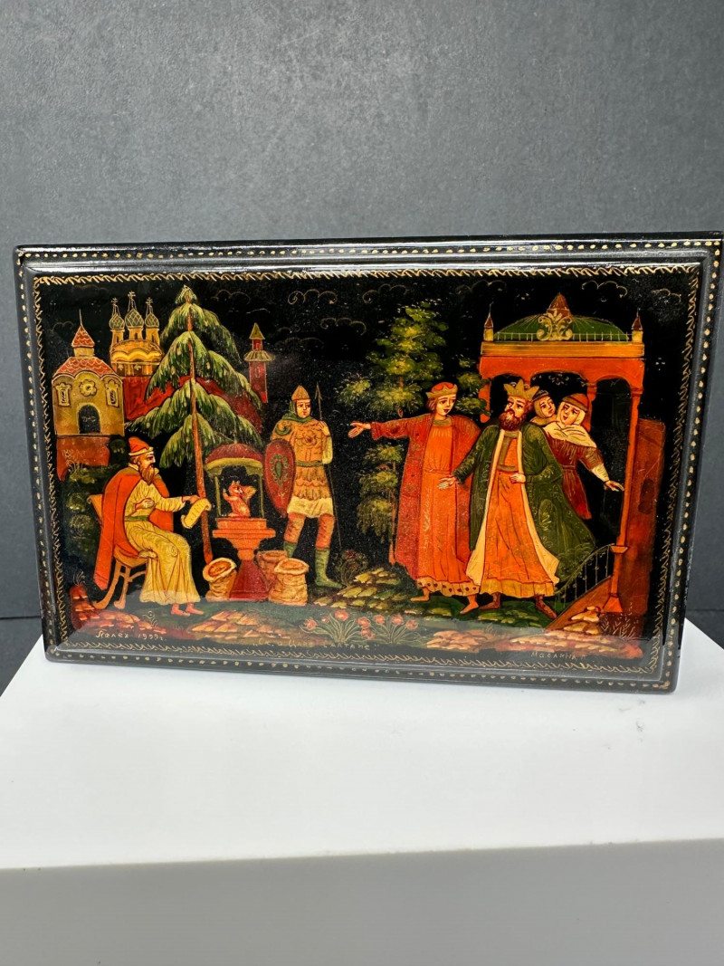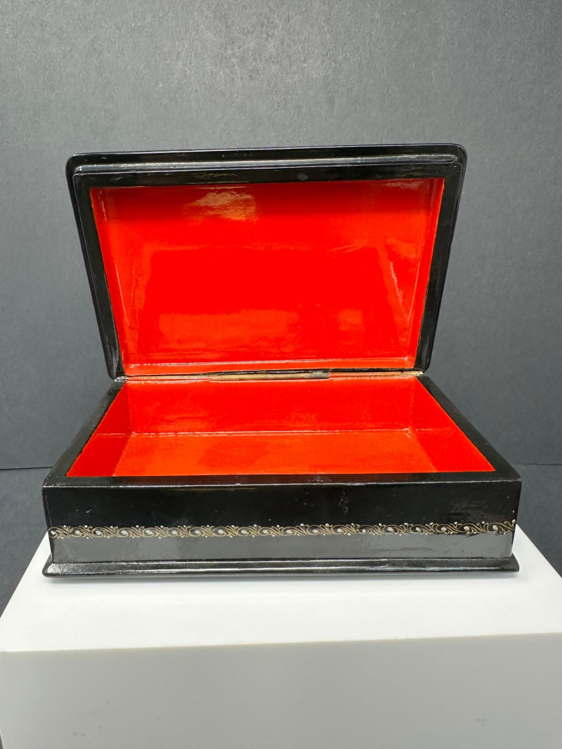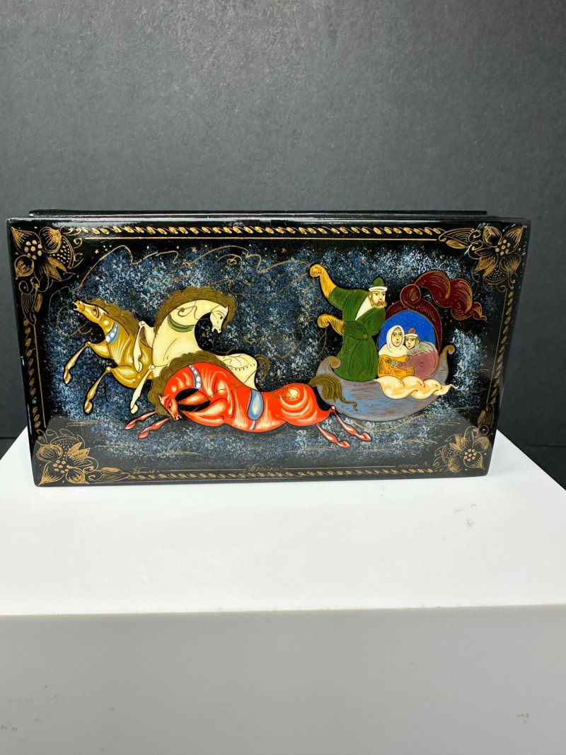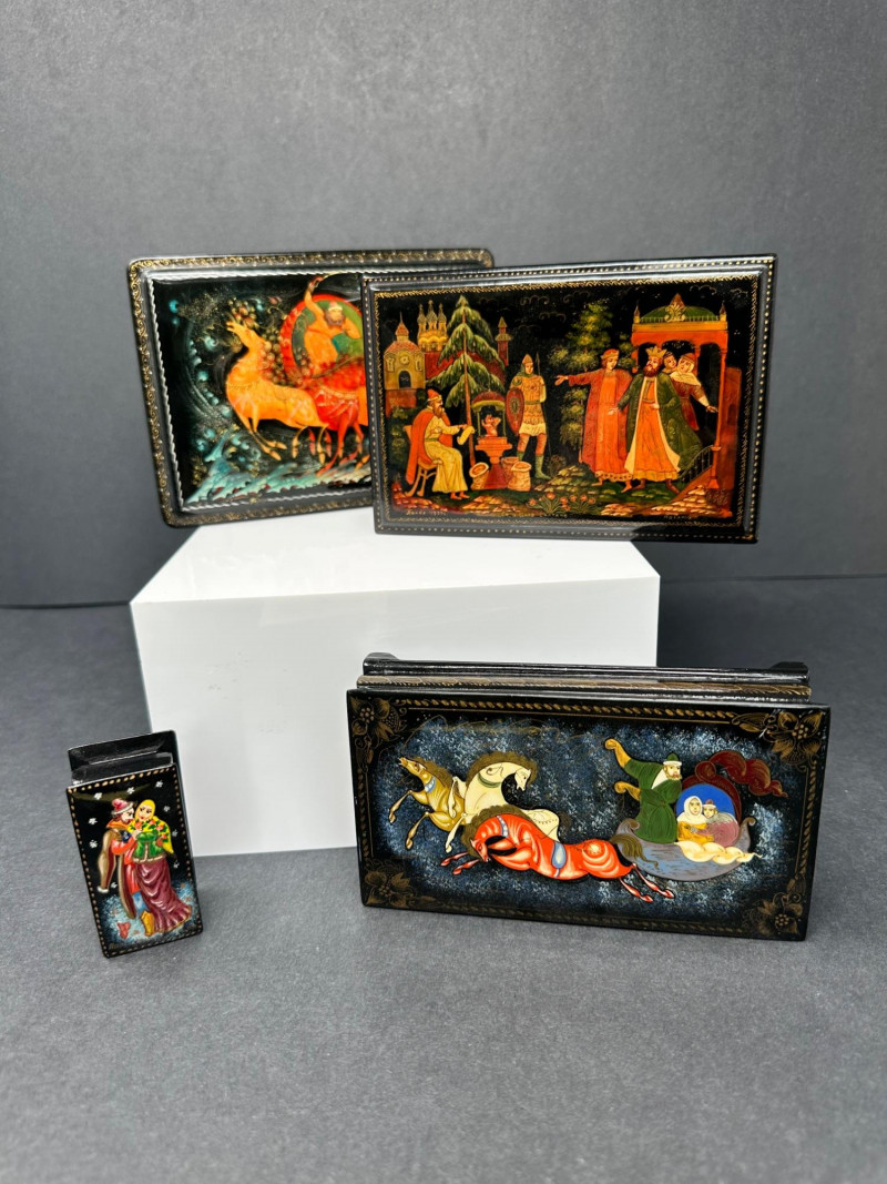 This distinctive set features four Russian-style lacquer boxes, each hand-painted with richly detailed narrative scenes inspired by traditional folklore and fairy tales. Executed on glossy black lacquer grounds, the compositions showcase vivid colors, gold accents, and fine line work characteristic of classic Russian decorative arts. The collection includes three rectangular hinged boxes with red lacquer interiors and one smaller vertical box, each presenting a different storytelling tableau—ranging from heroic figures and horse-drawn scenes to romantic and village-inspired imagery. Together, they form a visually striking and culturally evocative display, ideal for collectors of folk art, lacquerware, or decorative keepsakes. Type: Decorative lacquer boxes Quantity: Set of 4 Material: Lacquered wood Finish: High-gloss black lacquer exterior Interior: Red lacquer interiors (rectangular boxes) Decoration: Hand-painted folkloric and fairy tale scenes with gold detailing Style: Russian folk / fairy tale inspired Closure: Hinged lids Large rectangular lacquer box – dramatic multi-figure scene with horses Medium rectangular lacquer box – narrative village or court scene Rectangular lacquer box with raised base – dynamic storytelling composition Small vertical lacquer box – romantic couple sceneItem Details: