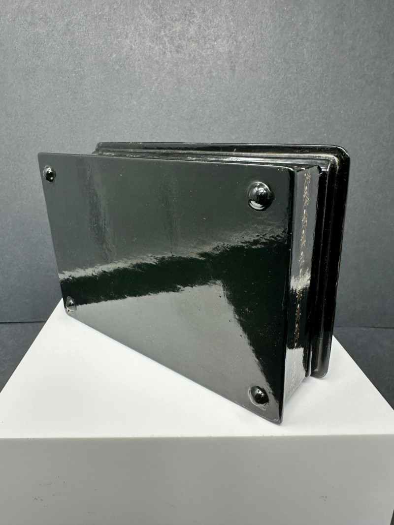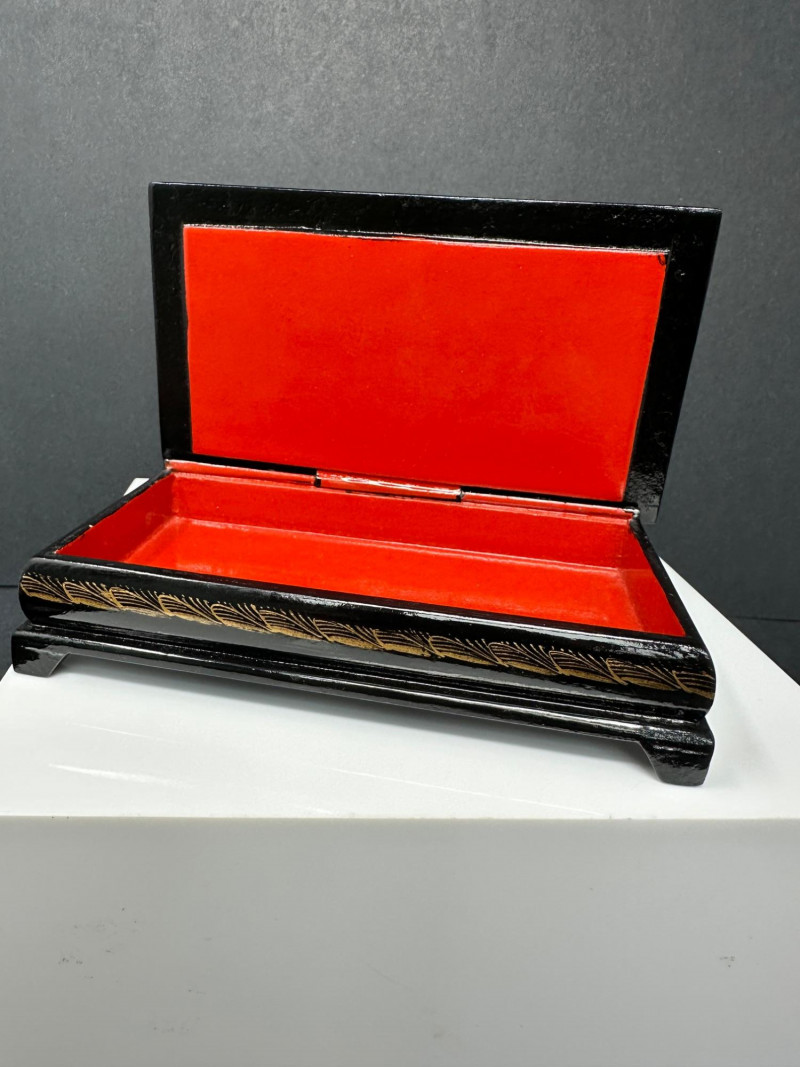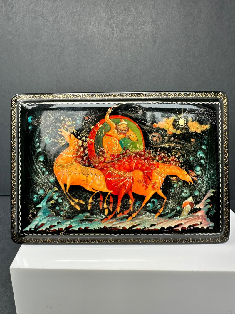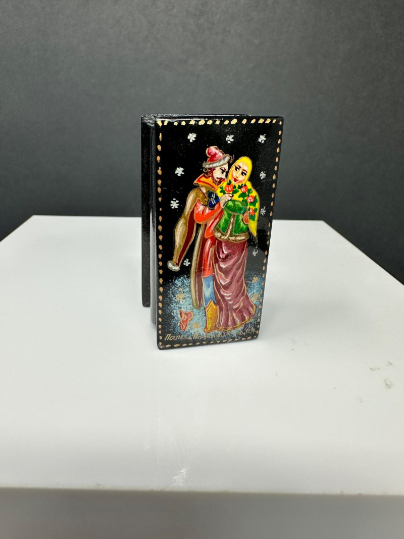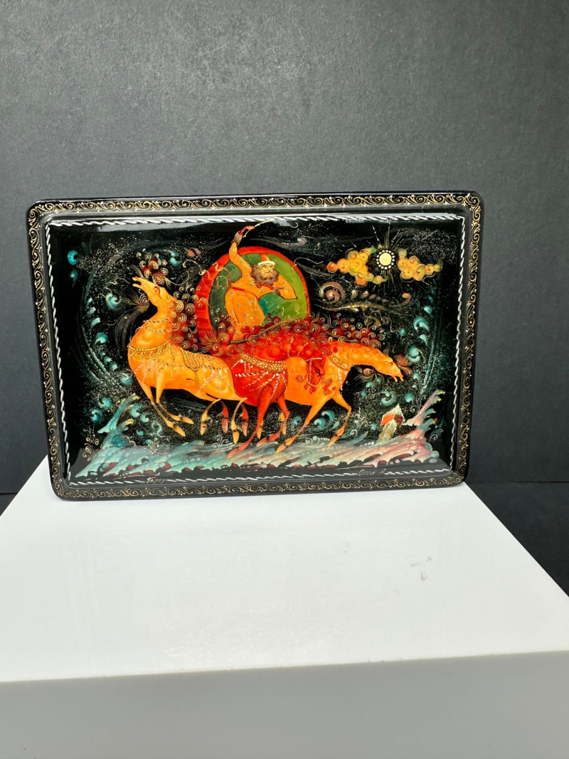 This distinctive set features four Russian-style lacquer boxes, each hand-painted with richly detailed narrative scenes inspired by traditional folklore and fairy tales. Executed on glossy black lacquer grounds, the compositions showcase vivid colors, gold accents, and fine line work characteristic of classic Russian decorative arts. The collection includes three rectangular hinged boxes with red lacquer interiors and one smaller vertical box, each presenting a different storytelling tableau—ranging from heroic figures and horse-drawn scenes to romantic and village-inspired imagery. Together, they form a visually striking and culturally evocative display, ideal for collectors of folk art, lacquerware, or decorative keepsakes. Type: Decorative lacquer boxes Quantity: Set of 4 Material: Lacquered wood Finish: High-gloss black lacquer exterior Interior: Red lacquer interiors (rectangular boxes) Decoration: Hand-painted folkloric and fairy tale scenes with gold detailing Style: Russian folk / fairy tale inspired Closure: Hinged lids Large rectangular lacquer box – dramatic multi-figure scene with horses Medium rectangular lacquer box – narrative village or court scene Rectangular lacquer box with raised base – dynamic storytelling composition Small vertical lacquer box – romantic couple sceneItem Details: