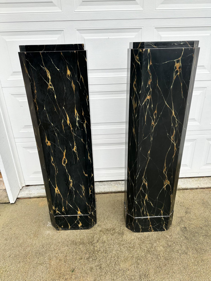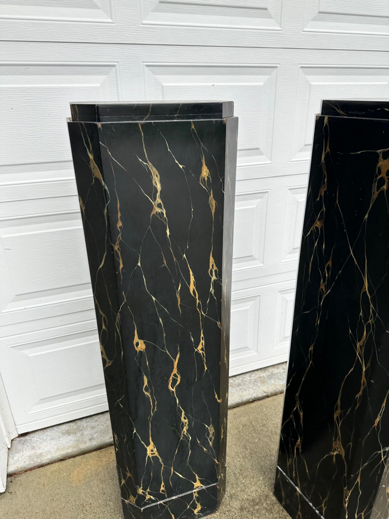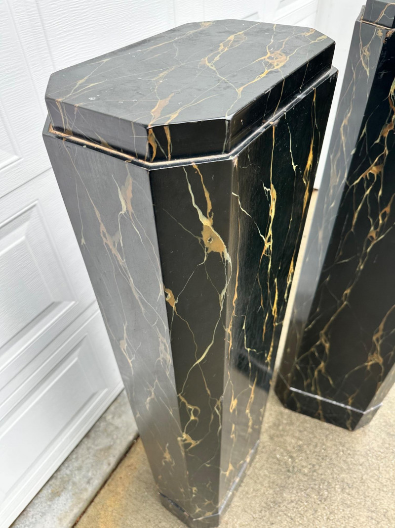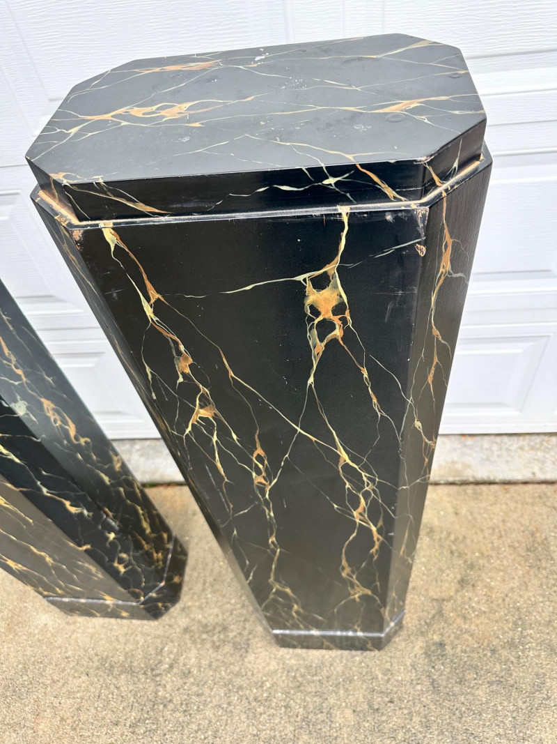 Striking pair of tall pillar stands constructed of wood with a laminate covering featuring a marble look, accented by dramatic gold veining. The tapered column design and octagonal tops create a strong architectural presence, ideal for displaying sculpture, art glass, plants, or decorative objects. These pillars offer the visual impact of marble while remaining lighter and easier to place, making them well suited for gallery-style displays, entryways, or statement décor. Quantity: Pair (2) Construction: Wood core with marble-look laminate covering Finish: Black laminate with gold marble-style veining Top Shape: Octagonal Form: Tapered pillar / display pedestal Use: Display stands, décor columns, sculpture pedestals Height: approx. 52″ Top: approx. 14″ W × 9.5″ DItem Details: