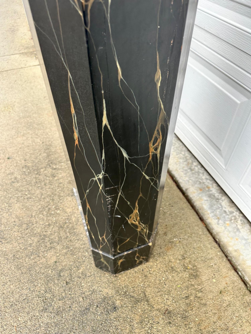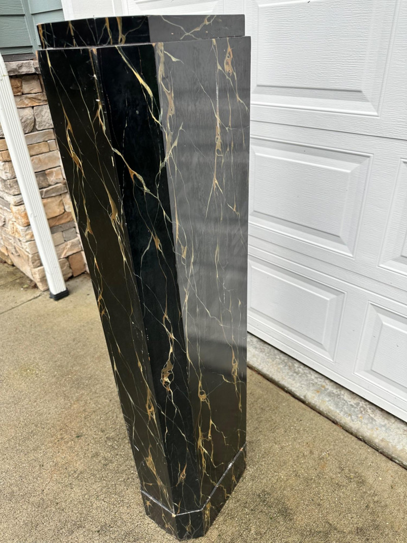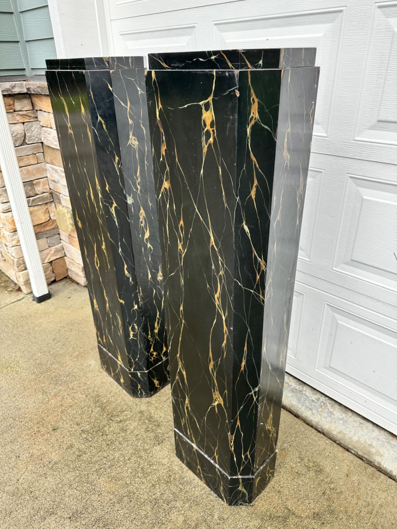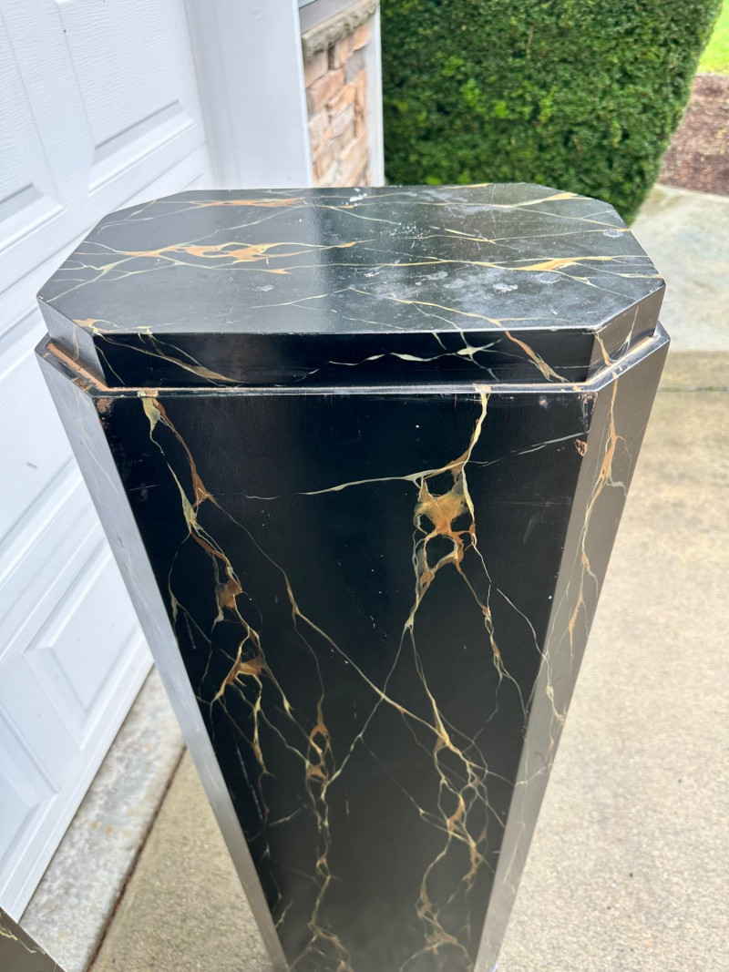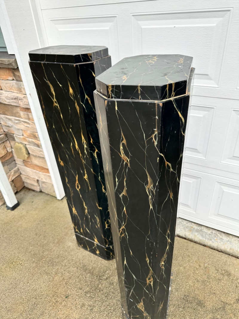 Striking pair of tall pillar stands constructed of wood with a laminate covering featuring a marble look, accented by dramatic gold veining. The tapered column design and octagonal tops create a strong architectural presence, ideal for displaying sculpture, art glass, plants, or decorative objects. These pillars offer the visual impact of marble while remaining lighter and easier to place, making them well suited for gallery-style displays, entryways, or statement décor. Quantity: Pair (2) Construction: Wood core with marble-look laminate covering Finish: Black laminate with gold marble-style veining Top Shape: Octagonal Form: Tapered pillar / display pedestal Use: Display stands, décor columns, sculpture pedestals Height: approx. 52″ Top: approx. 14″ W × 9.5″ DItem Details: