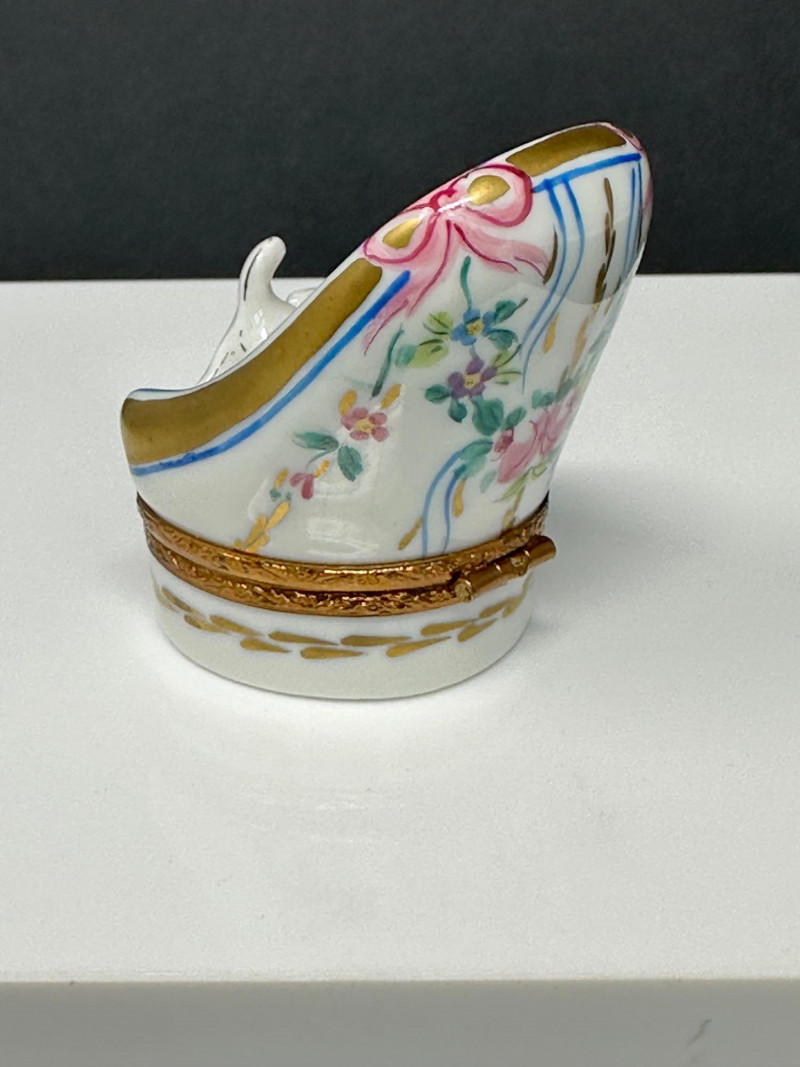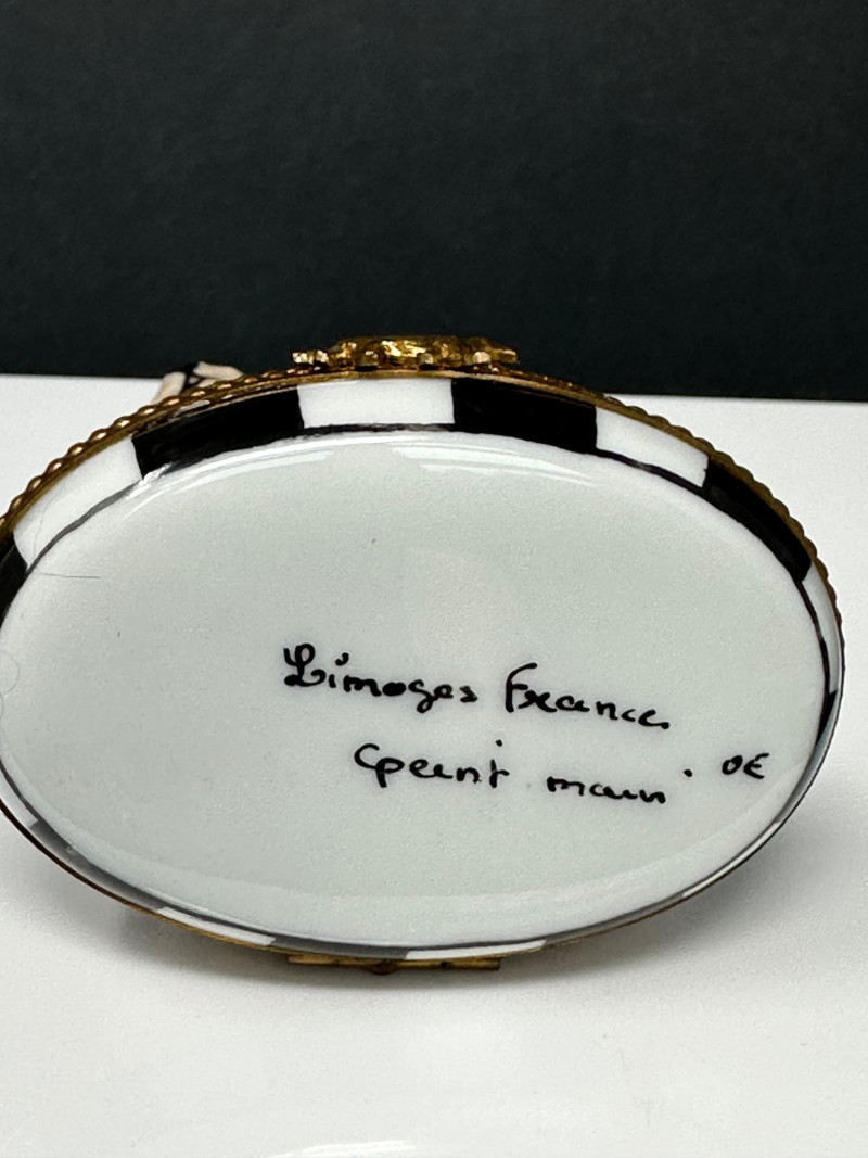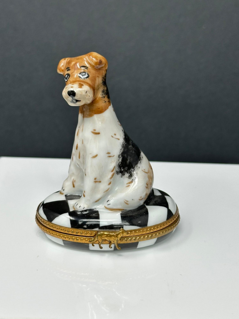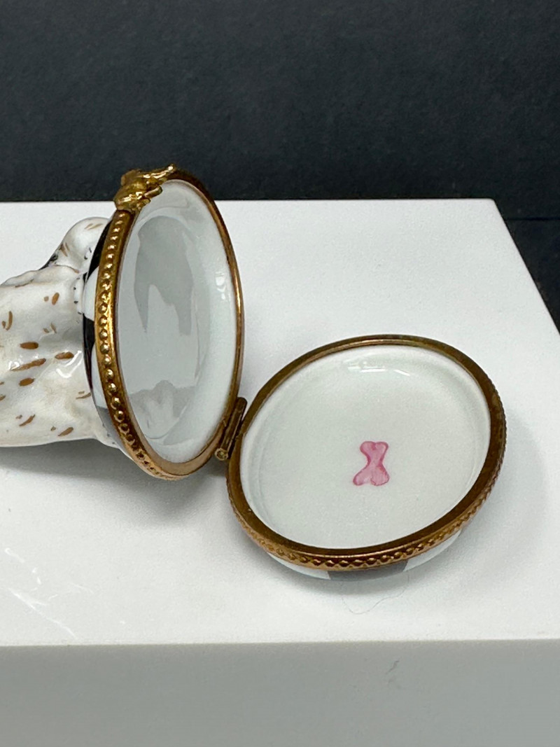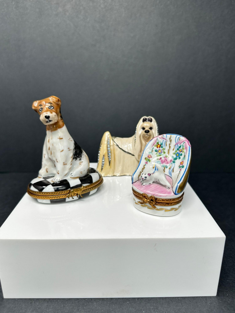 A charming three-piece lot of porcelain animal trinket boxes, featuring a combination of dog and cat figural designs. The group includes two Limoges France–marked examples and one unmarked Maltese-style dog trinket box. Each piece is finely formed, hand-painted, and fitted with hinged metal mounts, offering whimsical character and classic European decorative appeal. Ideal for collectors of Limoges porcelain, animal figures, or decorative trinket boxes. Form / Design: Seated dog on checker-pattern base Origin: France Mark: Limoges France (handwritten on base) Dimensions: Approx. 3.5″ x 3″ Color / Finish: White, brown, and black enamel with checker base and gilt trim Features: Hinged lid with decorative clasp Form / Design: Reclining cat in floral alcove Origin: France Mark: Limoges France (handwritten on base) Dimensions: Approx. 2.5″ x 2.5″ Color / Finish: White porcelain with pastel floral decoration and gold accents Features: Hinged lid with bow-form clasp; hand-painted interior detail Form / Design: Long-haired Maltese-style dog figure Mark: Unmarked Dimensions: Approx. 2.5″ x 1.5″ Color / Finish: Cream and ivory tones with dark facial accents Features: Hinged lid; sculpted fur texture; rhinestone-style accentsItem Details: