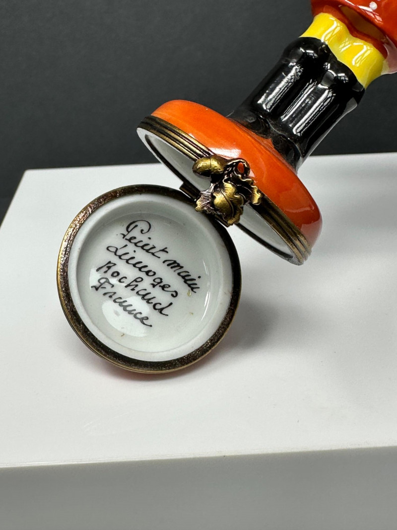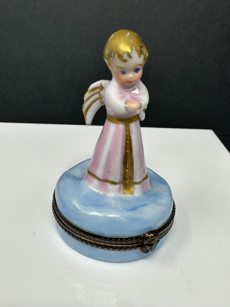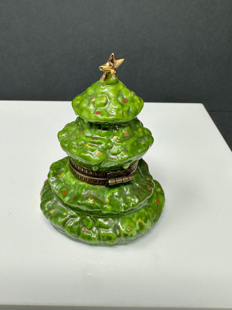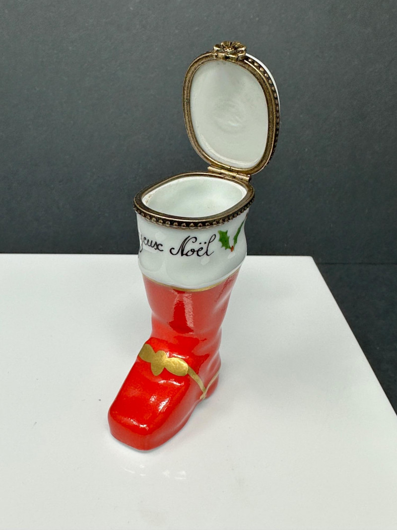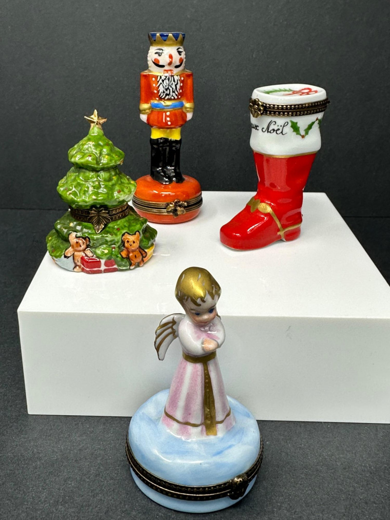 A festive grouping of four porcelain holiday trinket boxes, featuring a Studio USA Christmas tree box, a Limoges Noël boot, a Limoges nutcracker figure, and a Limoges angel form. Together, the assortment showcases a range of sculptural holiday motifs, hand-painted decoration, and metal-mounted hinged construction. The group blends whimsical Christmas imagery with traditional porcelain craftsmanship, offering an appealing seasonal collection suitable for display or curated holiday décor. Maker / Mark: Studio USA (hand-marked on underside) Maker / Mark: Peint main Limoges France, PH ’94 (hand-painted mark visible) Maker / Mark: Peint main Limoges France (hand-painted mark visible) Maker / Mark: Peint main Limoges B.R.C. (hand-painted mark visible)Item Details: