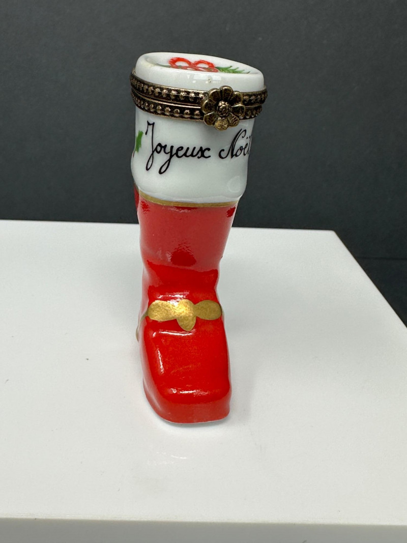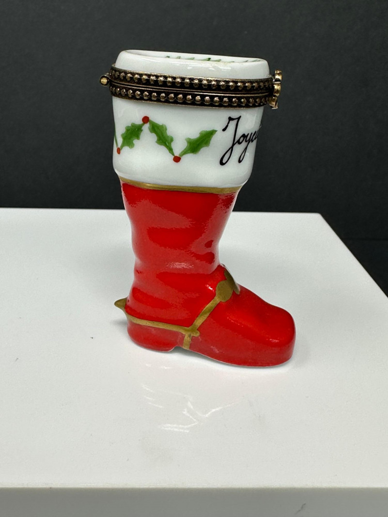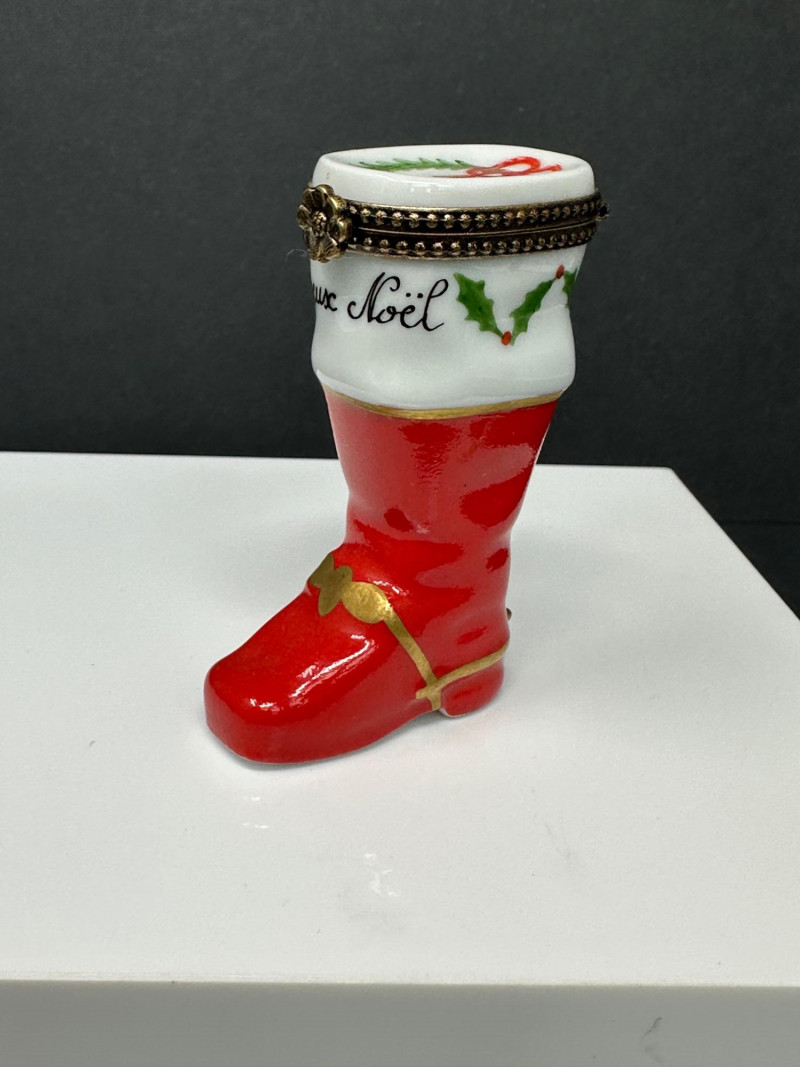 Color / Finish: Red boot form with white cuff, holly decoration, and “Joyeux Noël” inscription