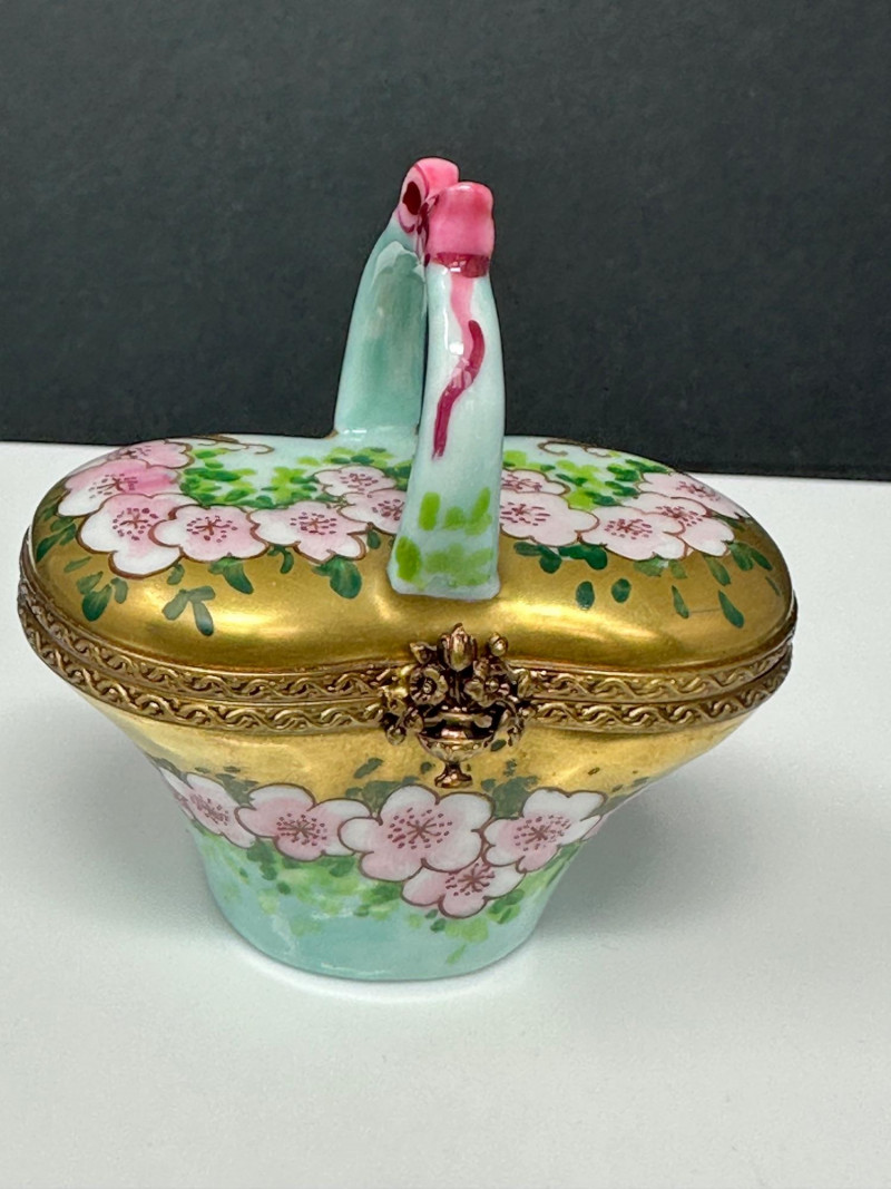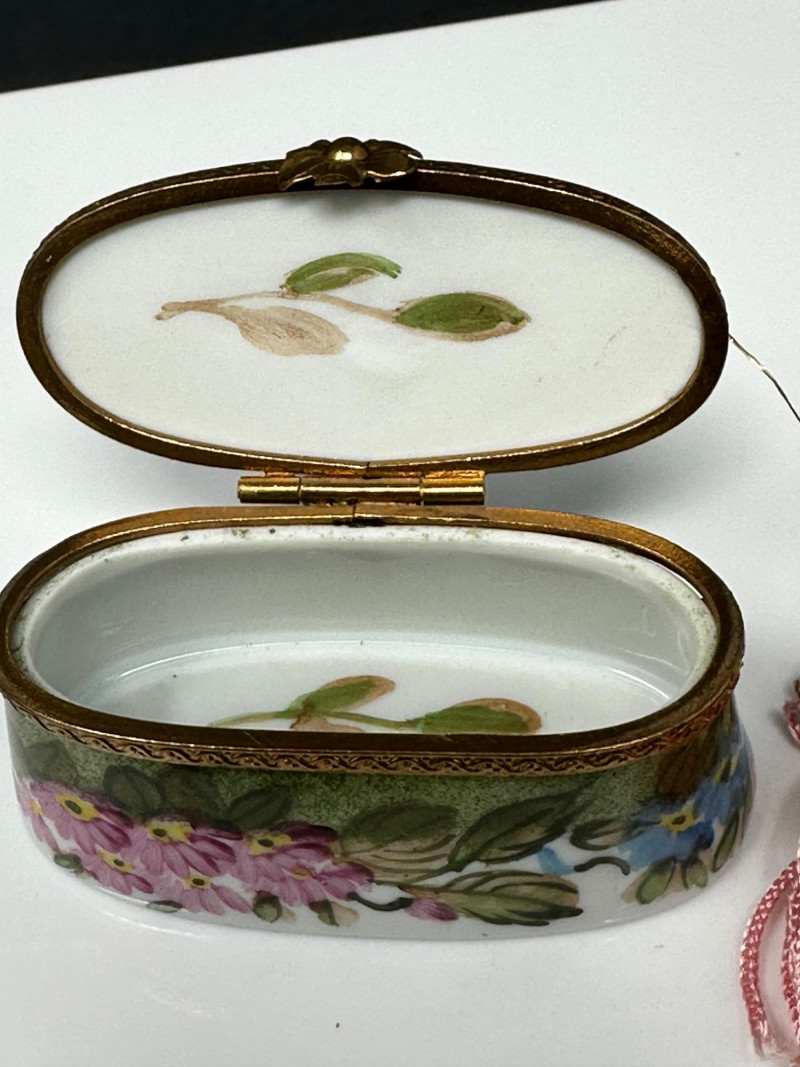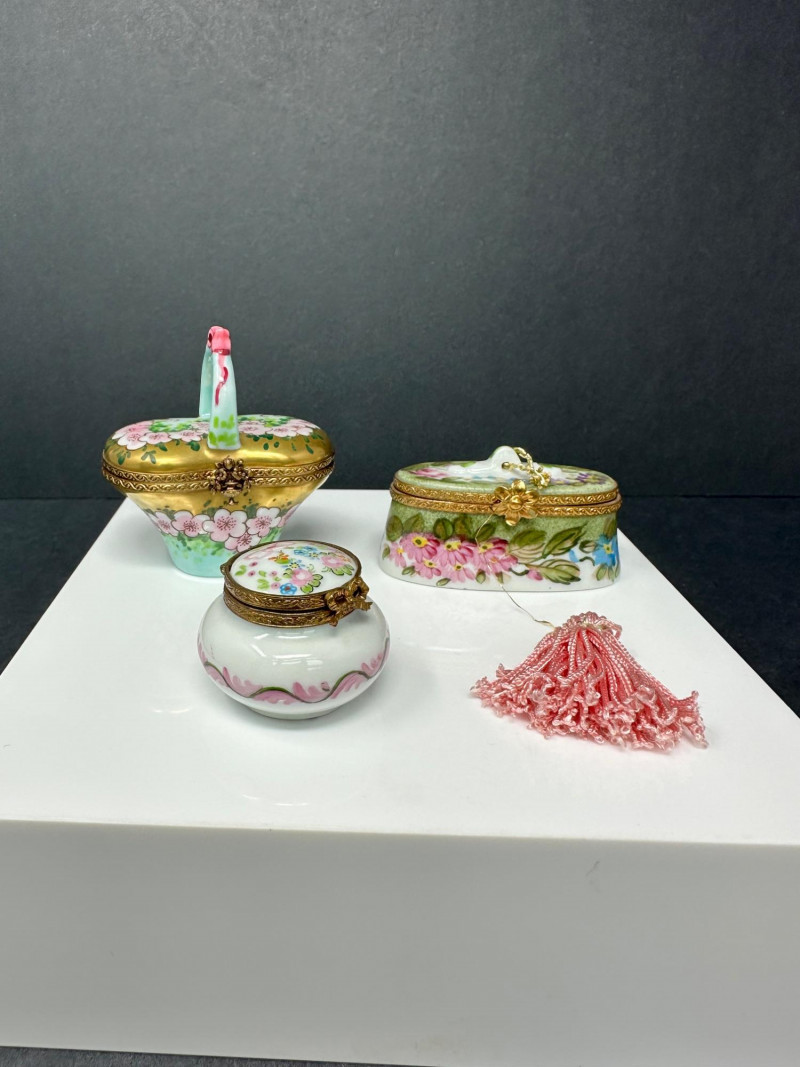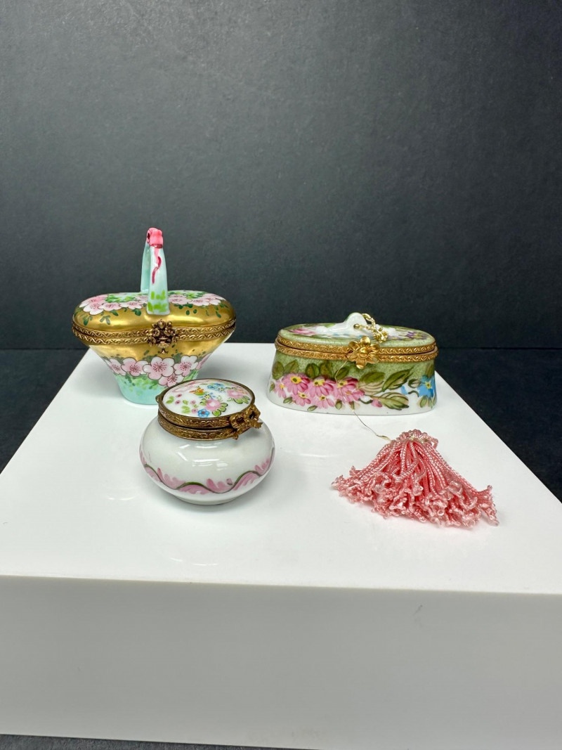 A charming three-piece set of Limoges Peint Main porcelain trinket boxes, hand-painted with delicate floral motifs in soft pinks, greens, and pastel tones. This coordinated trio includes a sculptural basket-form box with raised handle, an oval floral box with tassel accent, and a rounded floral box with gilt metal trim. Each piece features a hinged lid with ornate brass mounts and opens to a clean white porcelain interior. Together, the set showcases the refined craftsmanship and decorative elegance associated with traditional Limogesporcelain, making it an ideal grouping for collectors, display, or gifting. Mark: Peint Main – Limoges France Design: Basket form with sculptural handle Color / Finish: Pink floral decoration with green accents and gold trim Dimensions: Approx. 4" W x 3" D x 3.5" H (including handle) Mark: Peint Main – Limoges France Design: Oval form with hinged lid and tassel accent Color / Finish: Hand-painted florals on green ground with gilt mount Dimensions: Approx. 4" W x 2" D x 2" H Mark: Peint Main – Limoges France Design: Rounded form with hinged lid Color / Finish: White porcelain with pink floral banding, green accents, and gilt trim Dimensions: Approx. 2.5" W x 2" HItem Details: