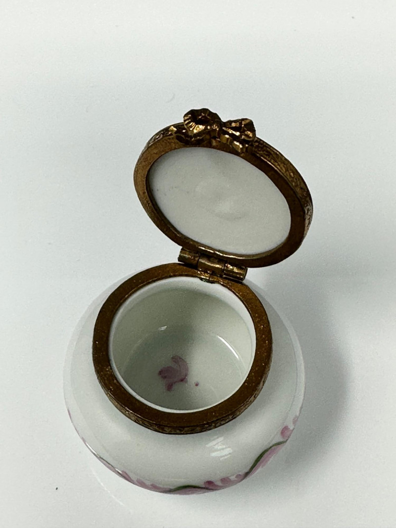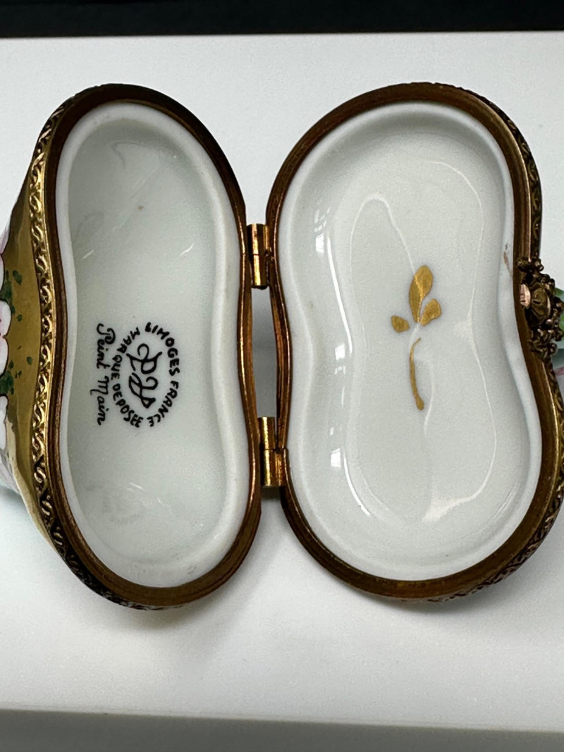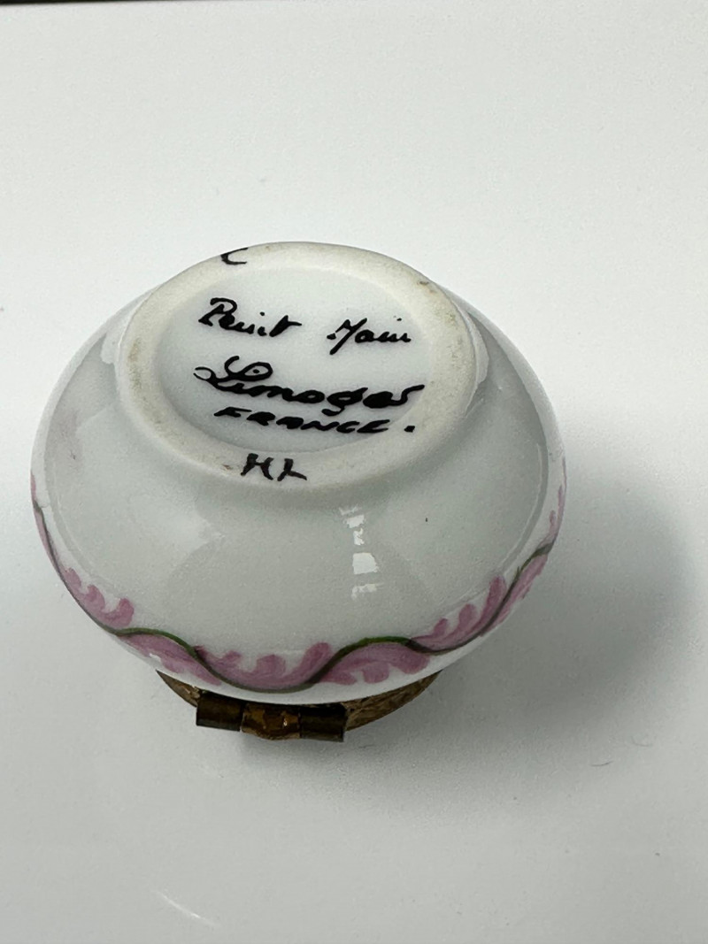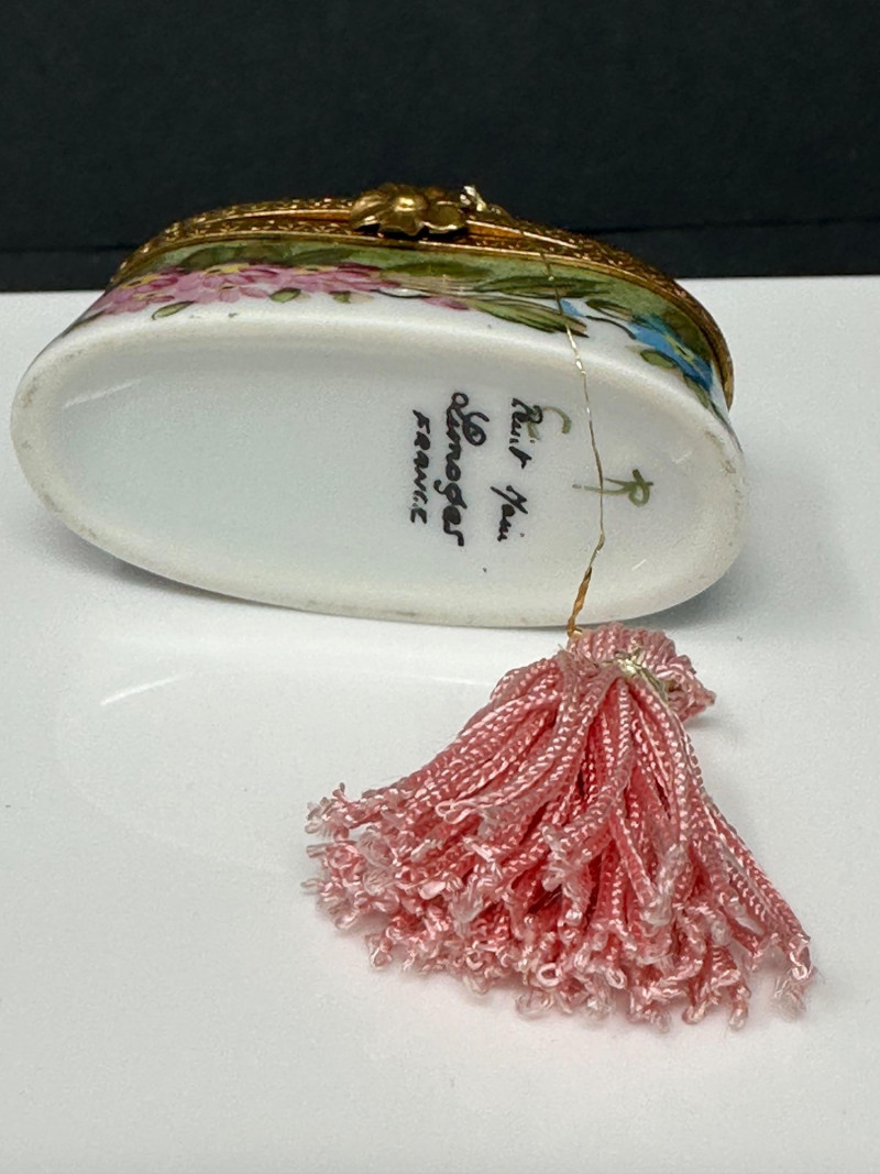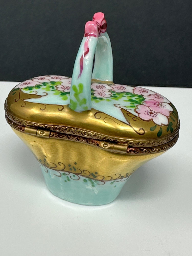 A charming three-piece set of Limoges Peint Main porcelain trinket boxes, hand-painted with delicate floral motifs in soft pinks, greens, and pastel tones. This coordinated trio includes a sculptural basket-form box with raised handle, an oval floral box with tassel accent, and a rounded floral box with gilt metal trim. Each piece features a hinged lid with ornate brass mounts and opens to a clean white porcelain interior. Together, the set showcases the refined craftsmanship and decorative elegance associated with traditional Limogesporcelain, making it an ideal grouping for collectors, display, or gifting. Mark: Peint Main – Limoges France Design: Basket form with sculptural handle Color / Finish: Pink floral decoration with green accents and gold trim Dimensions: Approx. 4" W x 3" D x 3.5" H (including handle) Mark: Peint Main – Limoges France Design: Oval form with hinged lid and tassel accent Color / Finish: Hand-painted florals on green ground with gilt mount Dimensions: Approx. 4" W x 2" D x 2" H Mark: Peint Main – Limoges France Design: Rounded form with hinged lid Color / Finish: White porcelain with pink floral banding, green accents, and gilt trim Dimensions: Approx. 2.5" W x 2" HItem Details: