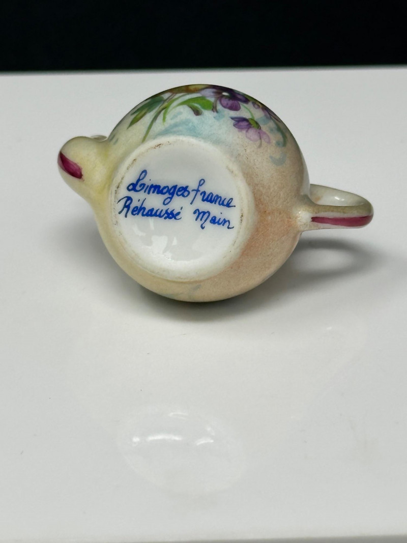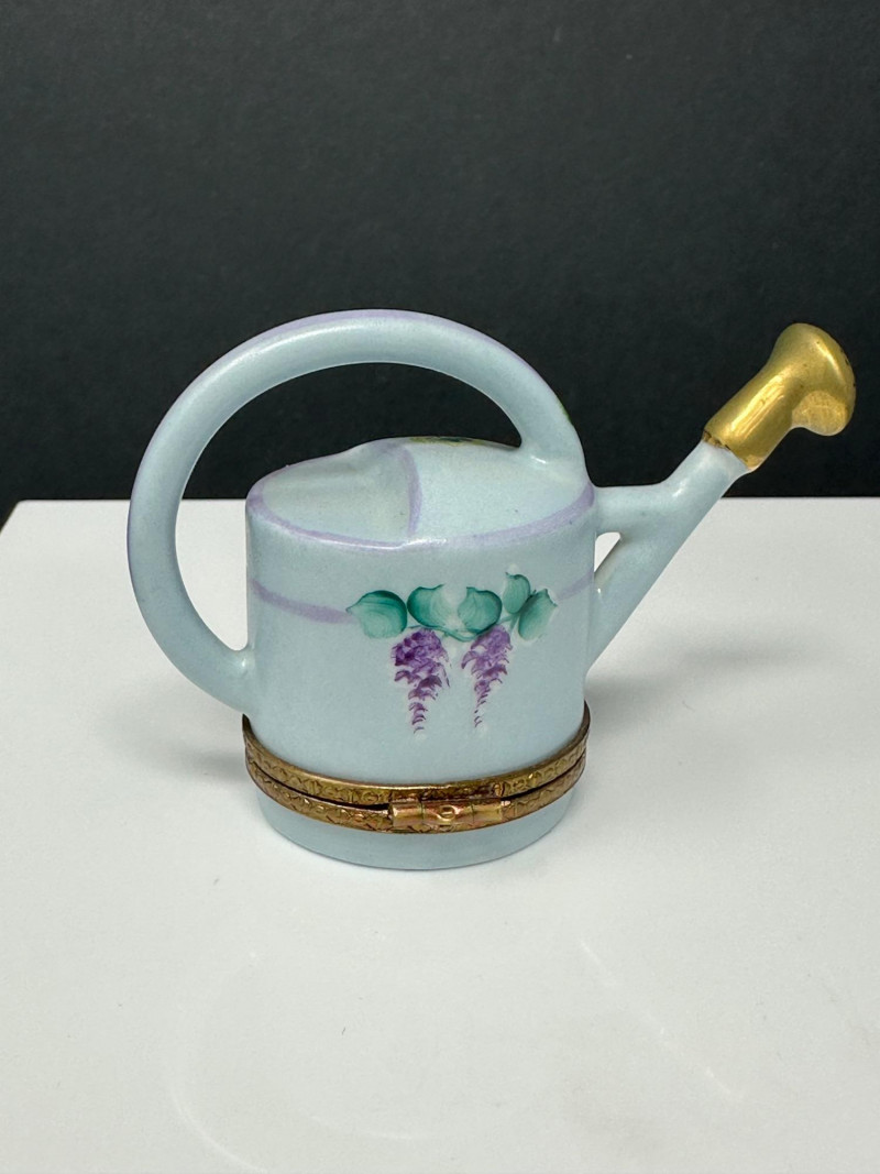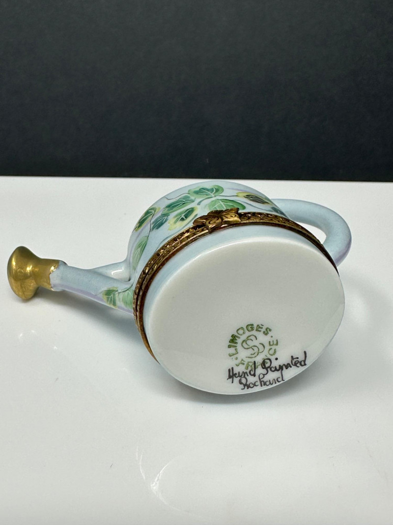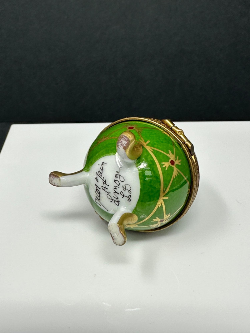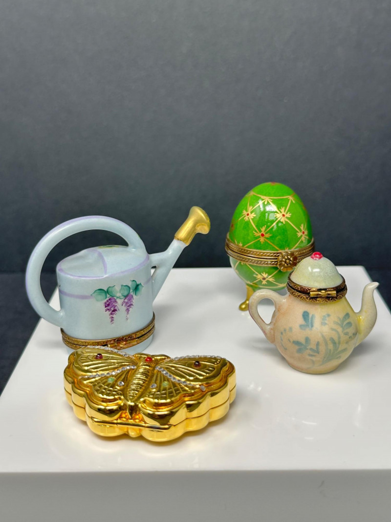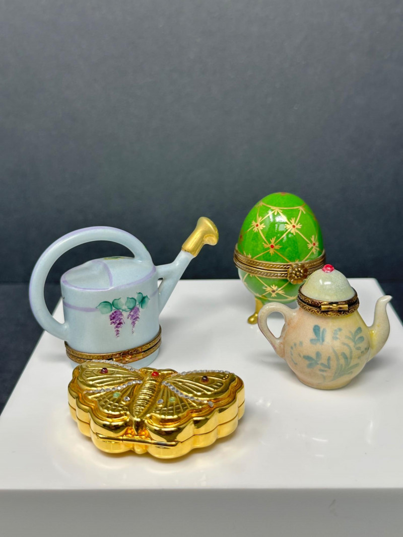 A charming quartet of Limoges France hand-painted porcelain trinket boxes, featuring whimsical figural forms including a butterfly, watering can, teapot, and egg-shaped box on feet. Each piece showcases fine enamel decoration, delicate floral motifs, and gilt metal mounts, reflecting the traditional craftsmanship and decorative elegance associated with Limoges porcelain. Together, the group presents a delightful display of miniature artistry, combining playful design with classic French porcelain refinement. Origin: Limoges, France Decoration: Hand-painted butterfly form with enamel detailing and jewel-tone accents Mounts: Gilt metal hinged construction Mark: Limoges France / Hand Painted (see photos) Dimensions: Approx. 2.5″ W x 1.75″ D Origin: Limoges, France Decoration: Soft blue glaze with hand-painted floral motifs Mounts: Gilt metal hinged base Mark: Limoges France, hand-painted Dimensions: Approx. 2″ H x 1.25″ W Origin: Limoges, France Decoration: Hand-painted floral design with pastel tones and raised enamel accents Mounts: Gilt metal hinge and clasp Mark: Limoges France – Rehaussé Main / Hand Painted Dimensions: Approx. 2.5″ W x 1.75″ D Origin: Limoges, France Decoration: Green ground with hand-painted geometric and floral motifs Mounts: Gilt metal banding and decorative feet Mark: Limoges France – Hand Painted Dimensions: Approx. 2.5″ H x 1.75″ WItem Details: