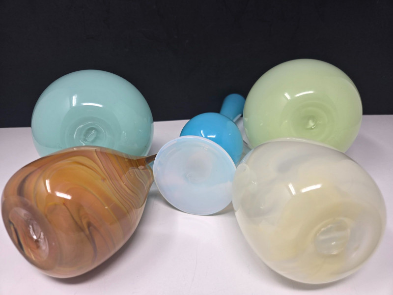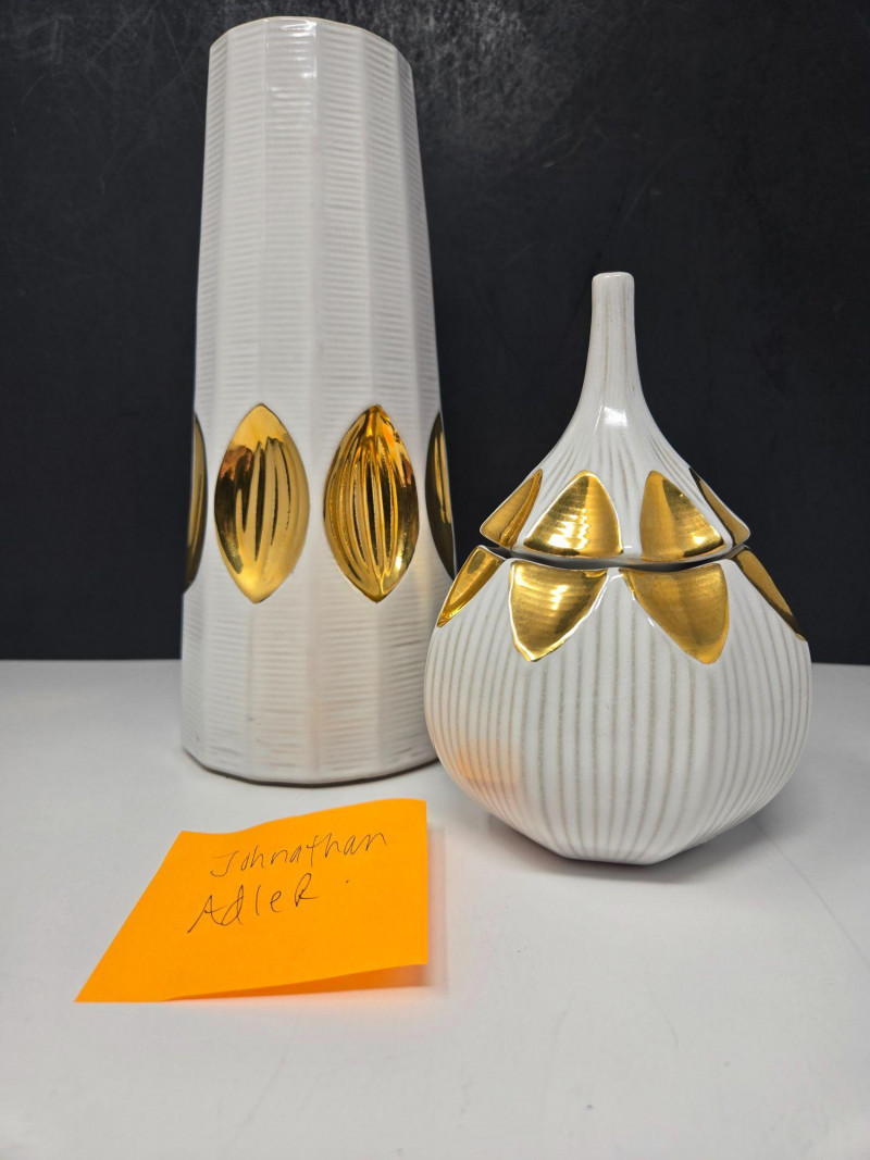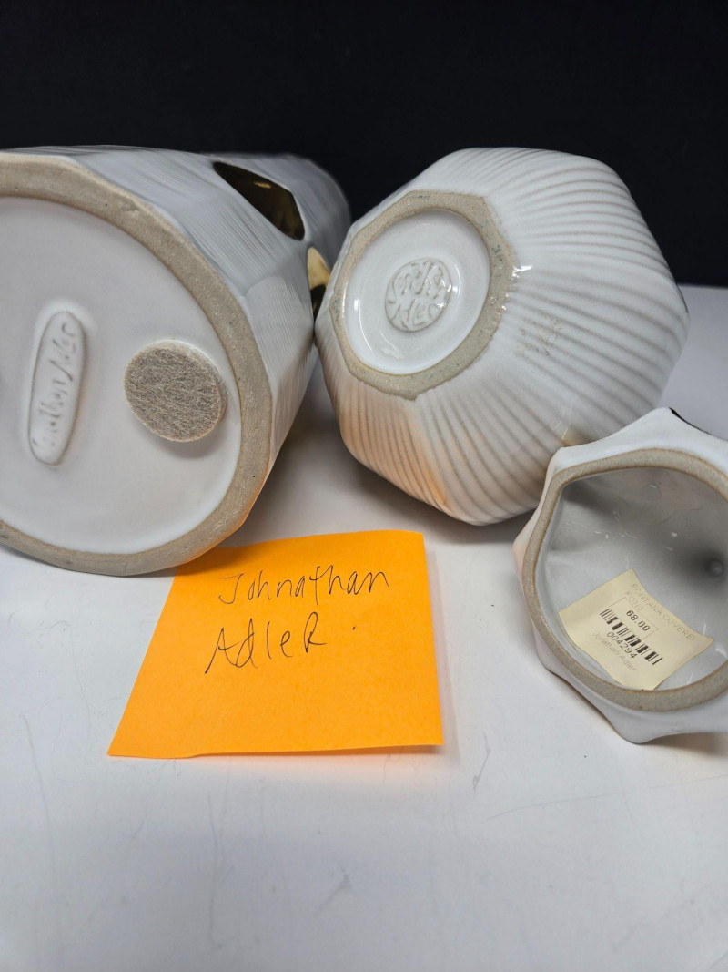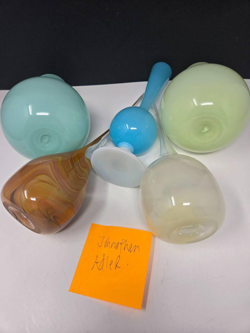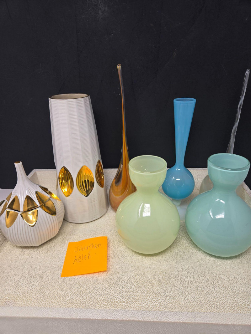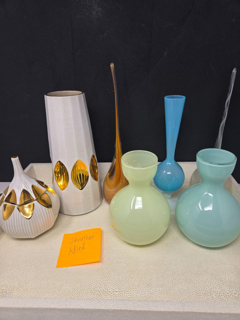 Jonathan Adler Collection: Includes sculptural vases in white, amber, pastel blue, and green tones Features gold leaf accents, ribbed textures, and modern silhouettes Clear twisted glass and bright blue narrow-neck vase add contrast and flair Designer tag included for authenticity Shagreen Serving Tray: Textured black tray with raised edges Provides elegant backdrop for staging or serving Ideal for coffee tables, vanities, or sideboards Presentation: Arranged for visual impact and easy bundling Ready for pickup—bring help if needed for delicate items Auction Notes: Bidding agreement required; pickup must be arranged unless shipping is pre-approved Full payment due by 8:00 p.m. the day after auction closes 10% buyer’s premium and sales tax apply unless re-seller license is provided Vases 5"-11 1/4"Collection of Jonathan Adler & Shagreen Serving Tray – Designer Vases & Glassware