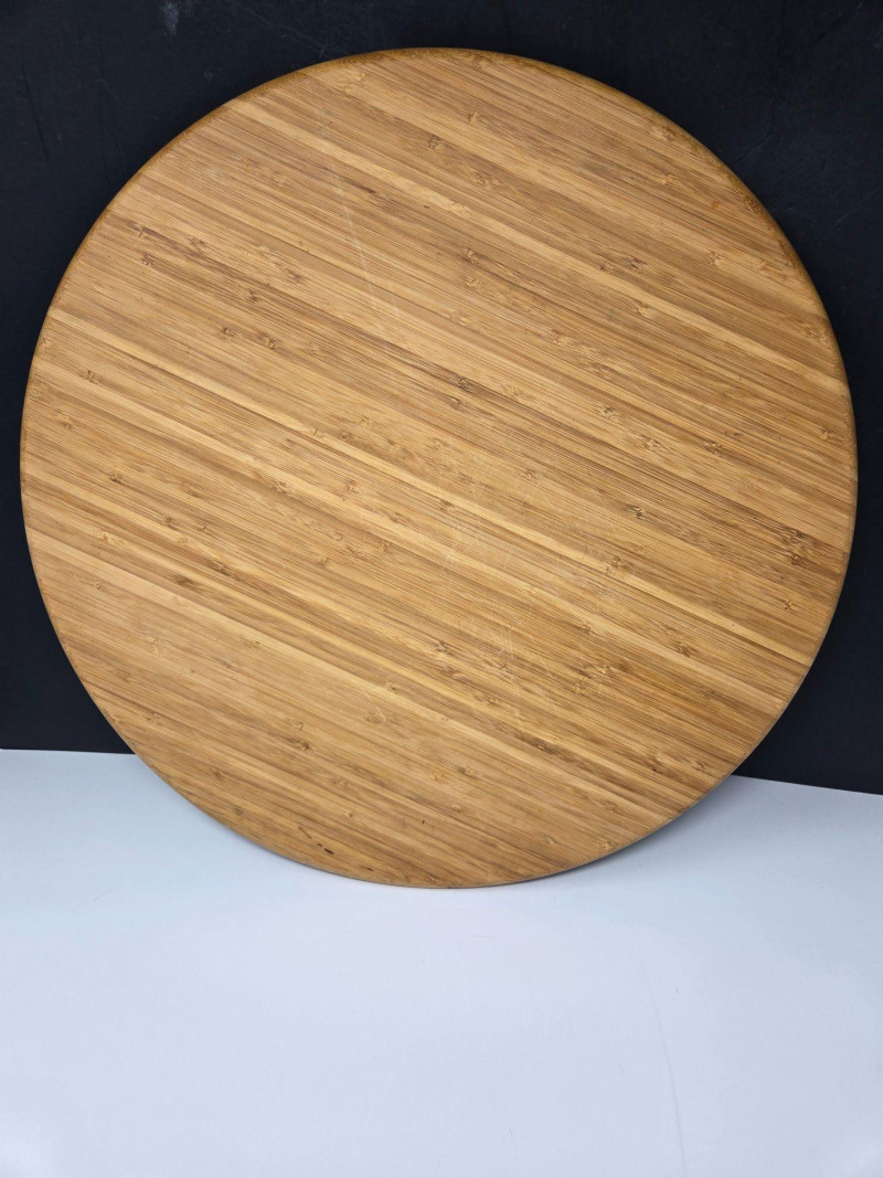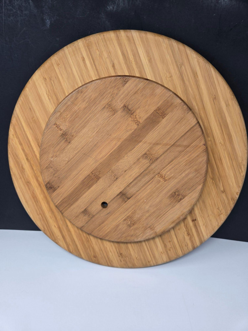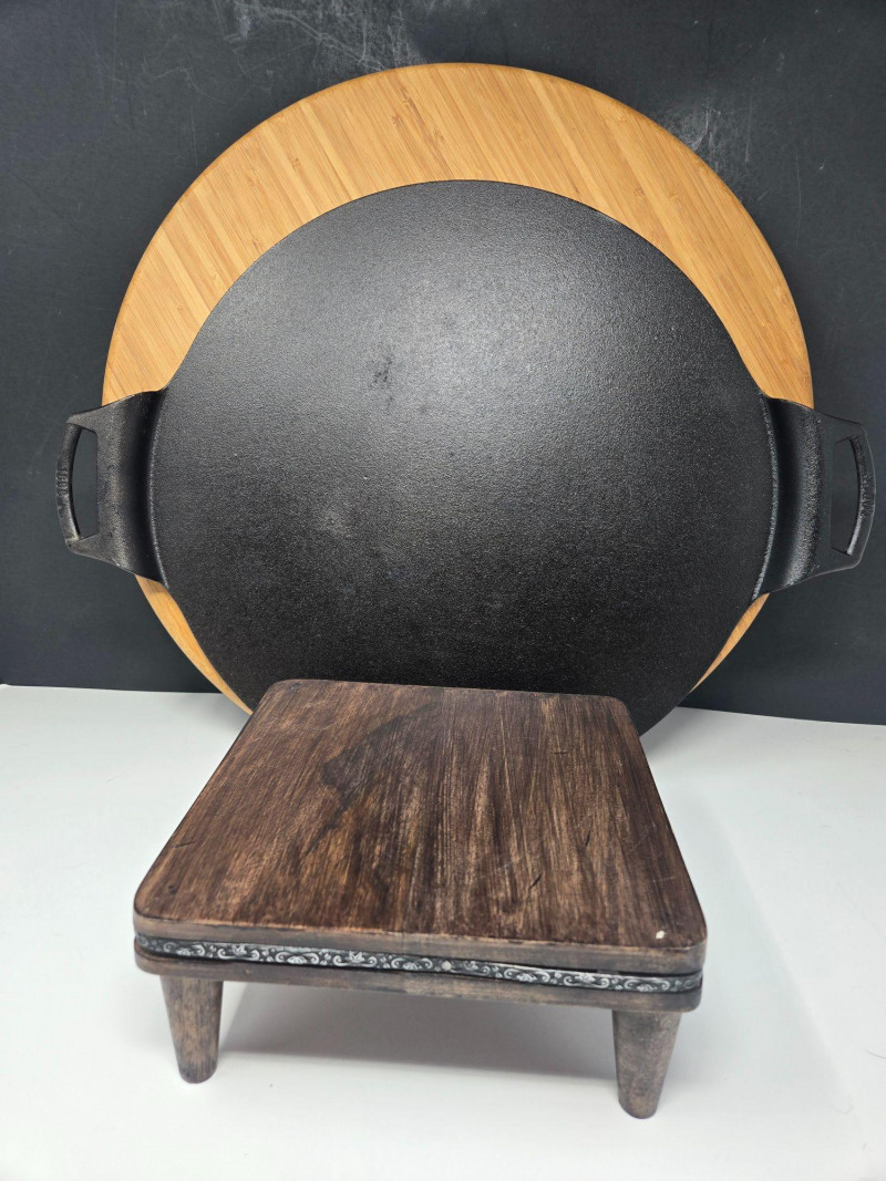 Lodge Cast Iron Pan (15"): Heavy-duty round griddle with dual handles Ideal for flatbreads, searing, or stovetop-to-oven cooking Signature Lodge quality—seasoned and ready to use Wooden Lazy-Susan (18"): Smooth rotating base for serving condiments, cheeses, or charcuterie Light brown finish with natural grain Great for tabletop entertaining or pantry organization Decorative Wood Riser (8" × 8"): Dark-stained mini platform with short legs and carved edge band Perfect for elevating dishes, candles, or centerpiece displays🍳 Lot Title: Lodge Iron Pan, Lazy-Susan & Wood Riser – Rustic Kitchen Trio