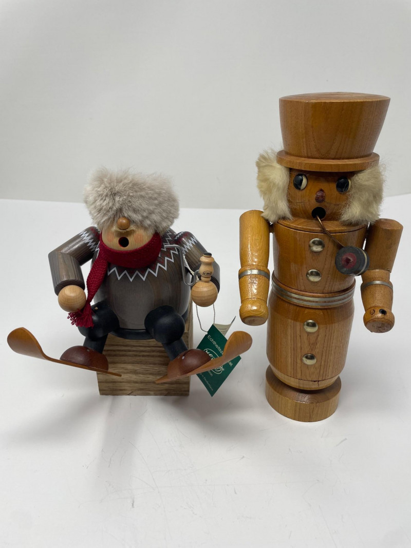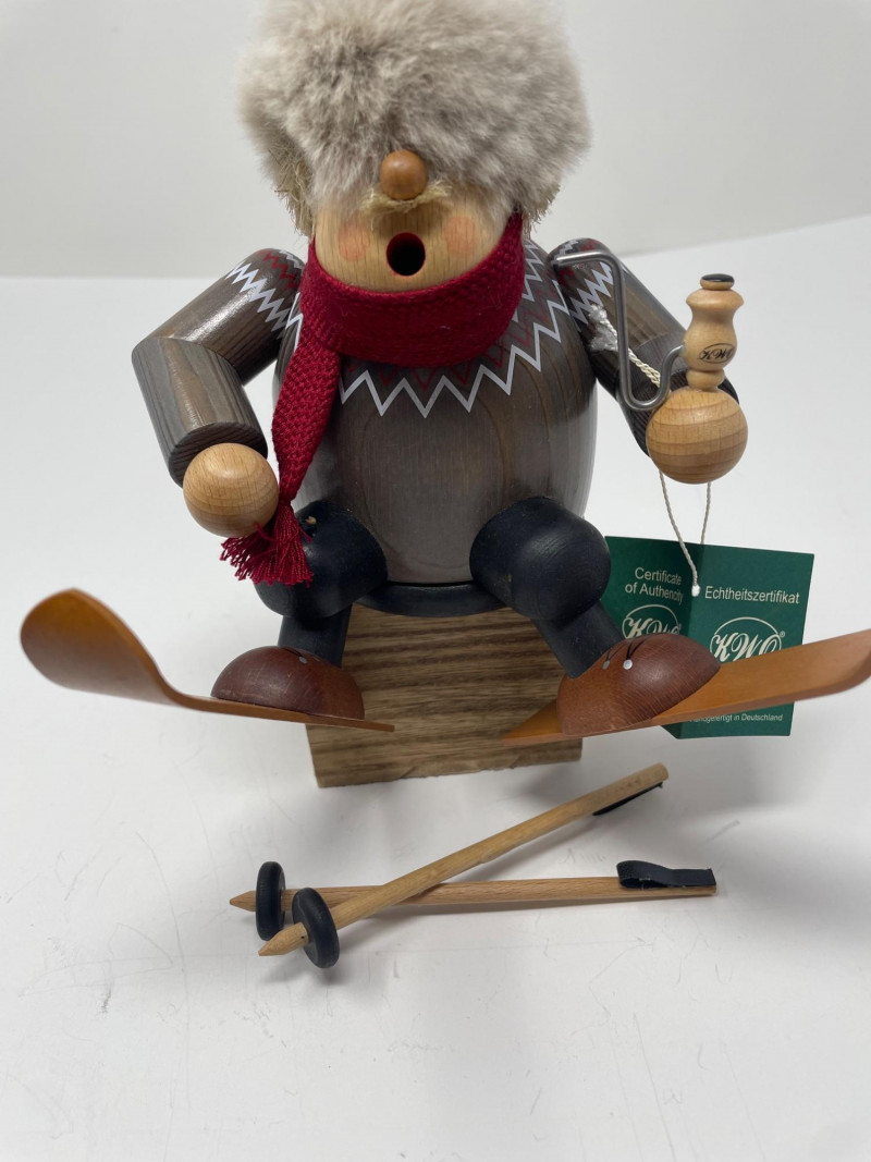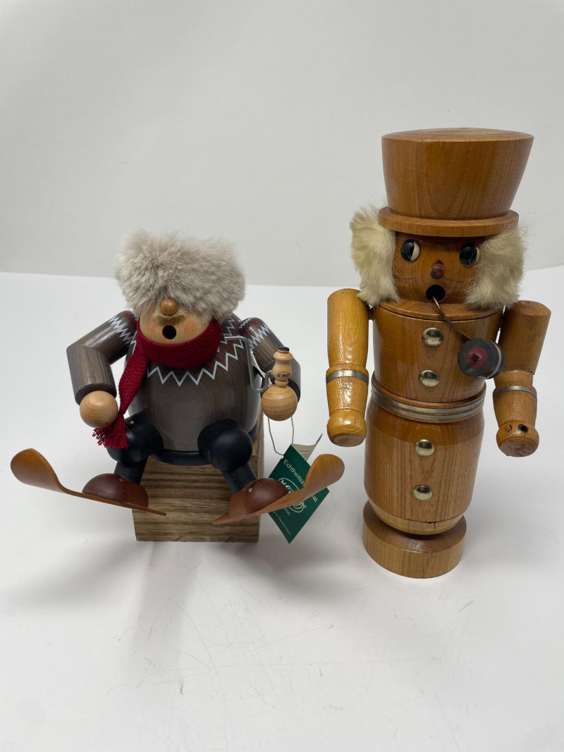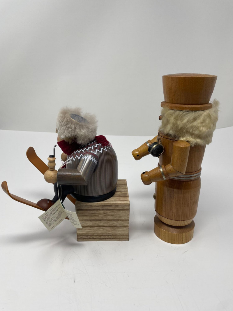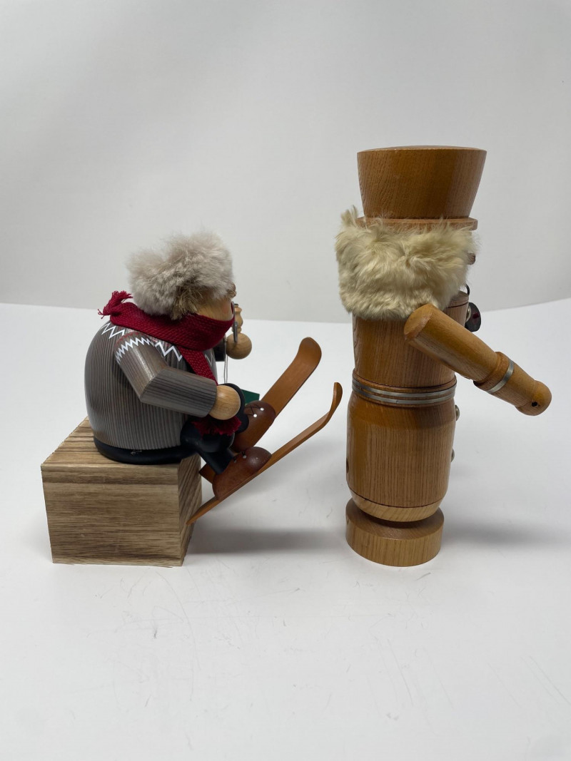 Skier Smoker: Seated figure with skis, red scarf, fur hat, and zigzag sweater Mounted on wooden block base Emits incense smoke through mouth when lit Soldier/Winter Character Smoker: Standing figure with tall cylindrical hat, fur earmuffs, and pipe Buttoned torso and upright posture Emits incense smoke through pipe Craftsmanship: Marked “ECHT HANDARBEIT” (genuine handmade) Rich in detail, texture, and traditional charm Ideal for collectors of German folk art or seasonal décor Measurements: Skier 7” x 7” and Wood Soldier 10”x 3”Two German Wood Incense Smokers – Handcrafted Erzgebirge Figures